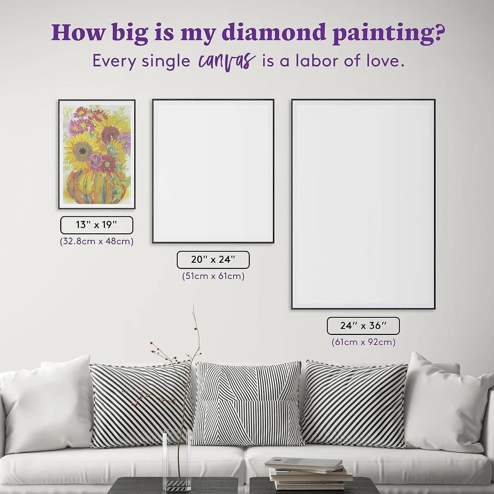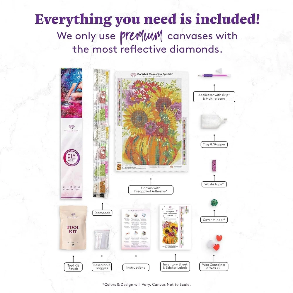 Pumpkin with Sunflowers Diamond Painting Kit, Floral Diamond Canvas, Round 5D Diamond Art for Adults and All Ages, 13" x 19" x 48 cm WHAT IS DIAMOND PAINTING?: Looking for a fresh take on cross-stitch, embroidery, or number painting? Simply apply colorful resin rhinestones to our velvety-soft self-adhesive canvas and create sparkling mosaic art. No experience necessary. INCLUDED: A 13" x 19" ( x 48 cm) full-drill canvas, round diamonds in 38 colors with 3 aurora borealis diamonds and 1 fairy dust diamond, 1 applicator with grip, 2 multi-placers, 1 cover minder, 1 tray with stopper, 1 wax container, 2 wax pads, washi tape, resealable baggies, sticker labels, and instructions. Diamond count: 20,007. OUR UNIQUE CANVAS PROCESS: We offer premium patented canvases with licensed art and the shiniest diamonds. Each canvas is hand charted for optimum clarity. Gift this sunflower diamond art painting canvas designed by artist Gail Flores to your friends or display it on your own wall! EASY & FUN FOR ALL: Make beautiful large or small diamond art with little effort and no mess! Diamond painting is a relaxing activity where you can create sparkling wall decor with friends and family. It’s perfect for adults and everyone who loves puzzles and DIY art projects. PREMIUM QUALITY: As a US-based company, we strive to manufacture high-quality products free from material defects. Elevate your crafting experience with this luxurious diamond art kit. Inspire creative minds with an exceptional DIY diamond painting today. Whether you love nature decor or are looking for a fun DIY diamond painting kit, ’s “Pumpkin With Sunflowers” nature diamond painting kit is perfect for you. It features a beautiful piece created by artist Gail Flores. manufactures high-quality products that feature unique artwork to inspire creative minds everywhere. Our diamond painting kits are great for both beginners and advanced crafters. To start the fun, choose any symbol on the canvas and find the matching diamond color. Then, press the applicator tip into the wax, pick up the diamond, and voilà! You’re ready to apply dazzling rhinestones to the canvas to create vibrant mosaic-inspired art. This canvas is 13" x 19" ( x 48 cm) in size. The craft kit includes the following tools: round diamonds in 38 colors with 3 aurora borealis diamonds and 1 fairy dust diamond, 1 applicator with grip, 2 multi-placers, 1 cover minder, 1 tray with stopper, 1 wax container, 2 wax pads, washi tape, resealable baggies, sticker labels, and step-by-step instructions. The cover minder keeps the plastic covering out of the way while you diamond paint. This tool, along with the washi tape, pen, and grip, will vary in design and color. Diamond count: 20,007. Our paintings are officially licensed, making our canvas selection unparalleled. It features popular characters, animals, and more to inspire creative fun for all! Each diamond art kit is great to work on alone or with a group of friends. Frame your finished artwork as home decor or gift it to a loved one. kits also make perfect craft-station activities. They require little effort and are mess-free, making them easy and fun crafts for all ages, especially those who love puzzles, crocheting, and art projects!