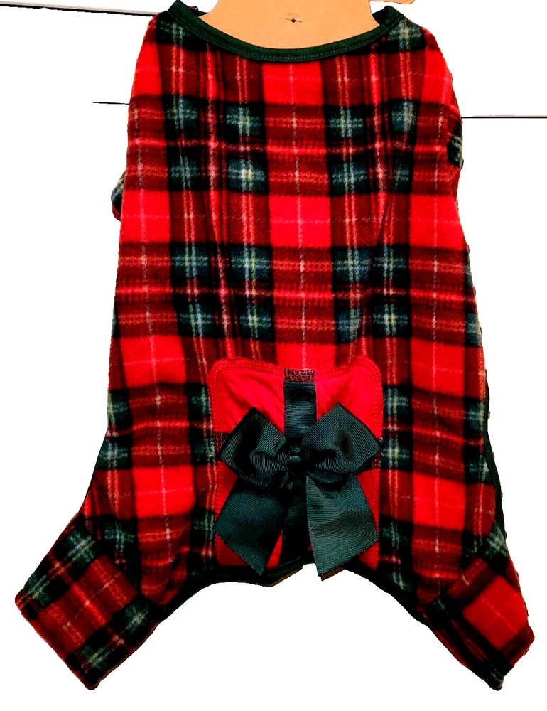 Adorable soft Fleece doggie pj's. Pj's are green & Red plaid with red package on bum with green bow! Too cute. Great for holiday pictures. Please take time to see all great items in my E-bay store. Buy with confidence! I have had my E-bay store for nearly 20 years with 100% positive feedback. I carry great gift and collector items. Please add me to your favorite store list. Also sign up for my store e-mail that comes out once every 2 weeks to see new items. If you have any questions please message me. Thanks for looking and I hope to do business with you soon. SMOKE FREE HOME I WILL COMBINE SHIPPING ON ALL MY ITEMS FOR YOU!
