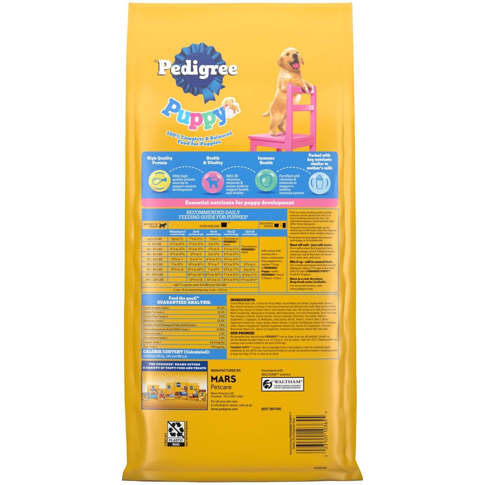 Dogs bring out the good in us. Pedigree brings out the good in them. Express your love for your dog by serving Pedigree Puppy Dry Puppy Food, Chicken, Rice, and Vegetable Flavor recipe. This great-tasting dry puppy food is specifically designed for puppies, made with high-quality protein sources to support muscle development, and is fortified with vitamins and minerals to support a healthy immune system. Pedigree Puppy Dry Puppy Food, Chicken, Rice, and Vegetable Flavor is also 100% complete and balanced for puppies and is made with key nutrients similar to mother’s milk. To support your puppy’s health and vitality, this dry puppy food is formulated with 36 vitamins, minerals, and amino acids. With no high fructose corn syrup, artificial flavors, or added sugars, Pedigree Puppy Dry Puppy Food, Chicken, Rice and Vegetable Flavor shows your puppy that you care. Made with high-quality protein sources to support muscle development in growing pups. Made with 36 vitamins, minerals, and amino acids to support your puppy’s health and vitality. Dry puppy food fortified with vitamins & minerals to support a healthy immune system. 100% complete and balanced food for puppies, bringing a nutritious meal to your pet. Crafted with no high fructose corn syrup, artificial flavors, or added sugar.