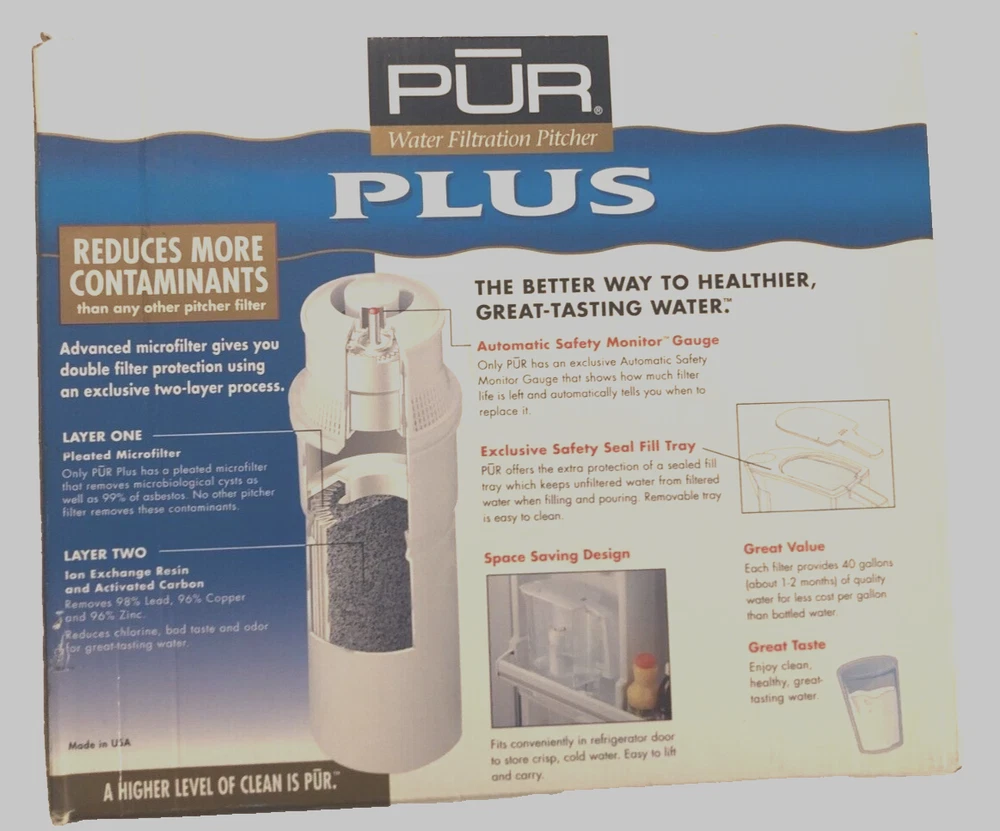 This is a PUR Plus Water Filtration Pitcher with a capacity of 1/2 gallon. The pitcher is made of plastic and is clear in color. It comes in a pack of 3 and the model number is CR-740. It is compatible with PUR filters and is suitable for household use. This pitcher is new and unused, manufactured in the United States. Condition: Open box but never used. Old stock.