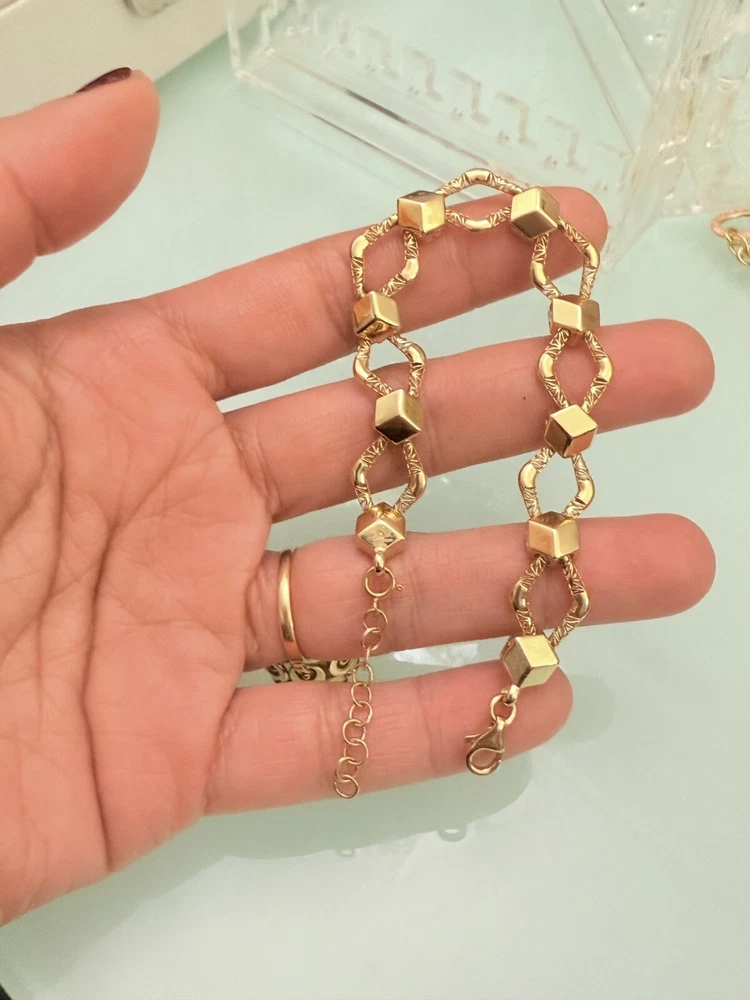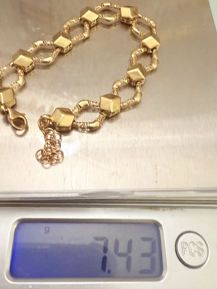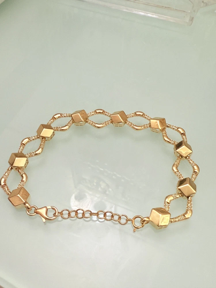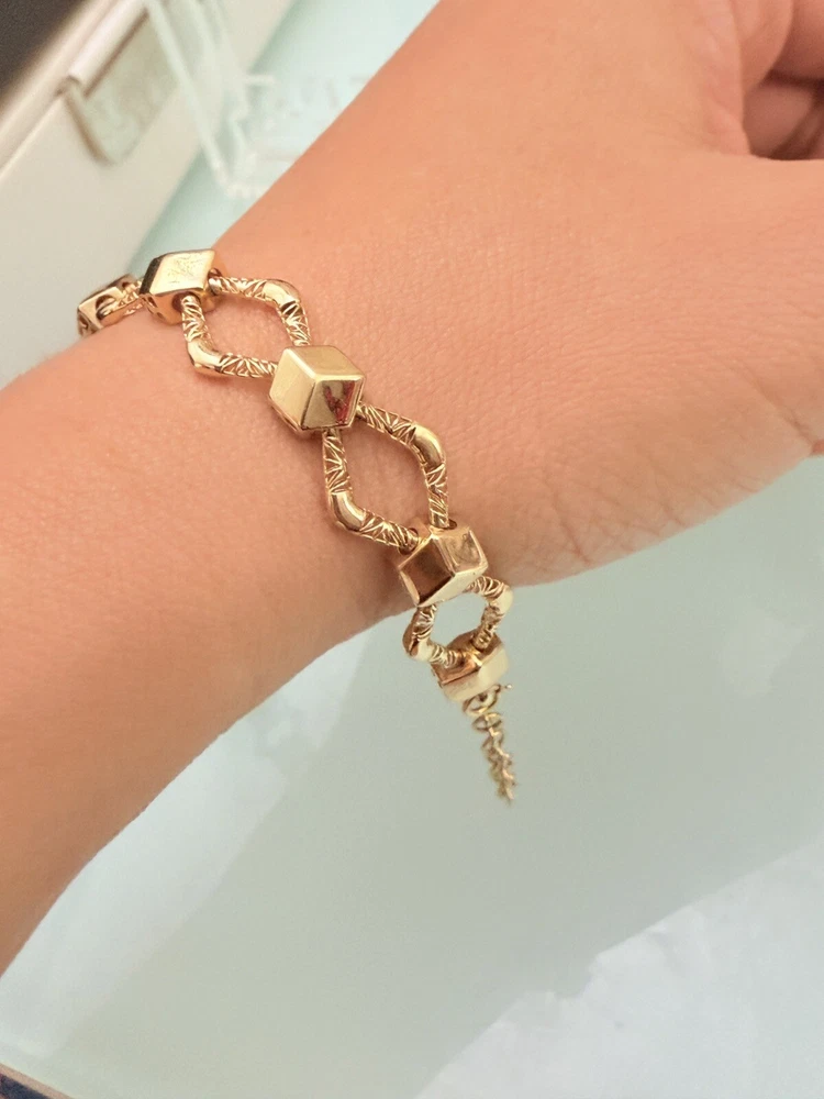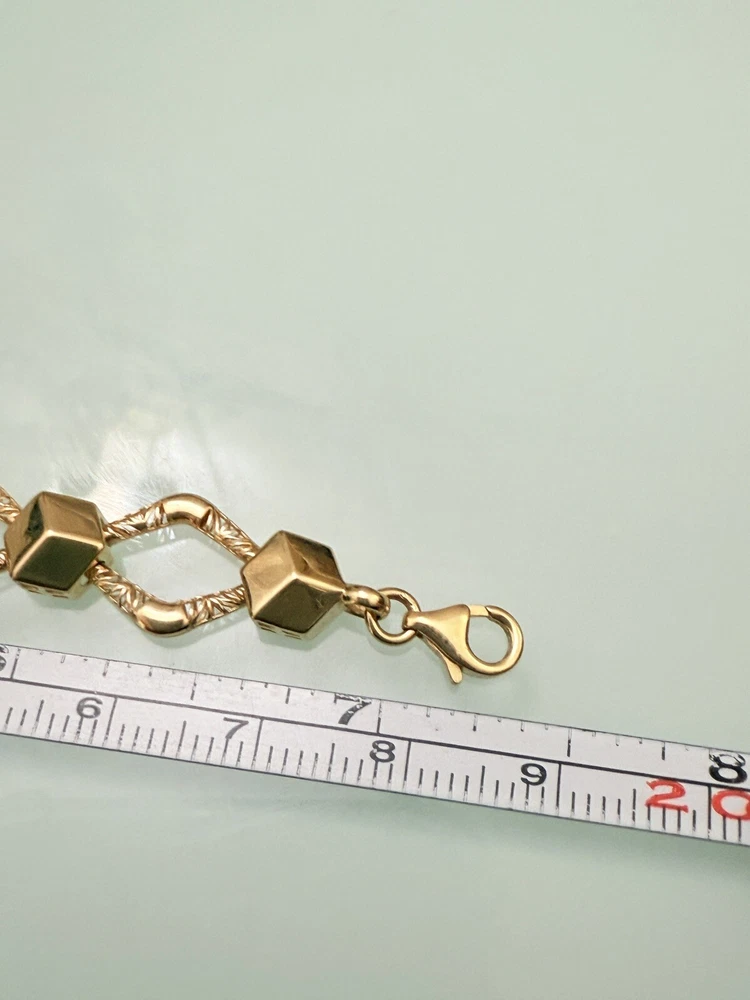 This 18k yellow gold bracelet features a shiny diamond shape design, making it a beautiful Valentine's gift. The bracelet is nickel-free, not plated, and marked as 18k gold. It weighs approximately 7.43g and has a length of 7.25”. The unique design is adjustable and comes in a gift box. Made in the United Arab Emirates, this elegant piece is a perfect choice for special occasions.