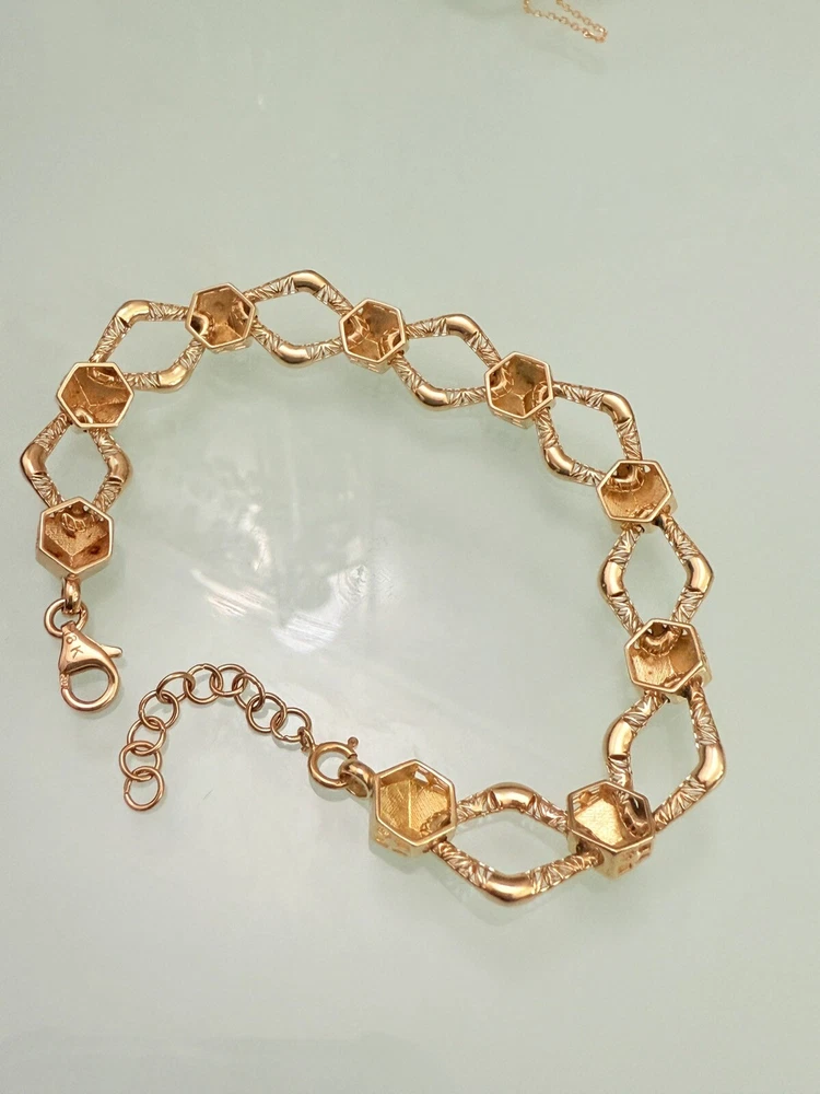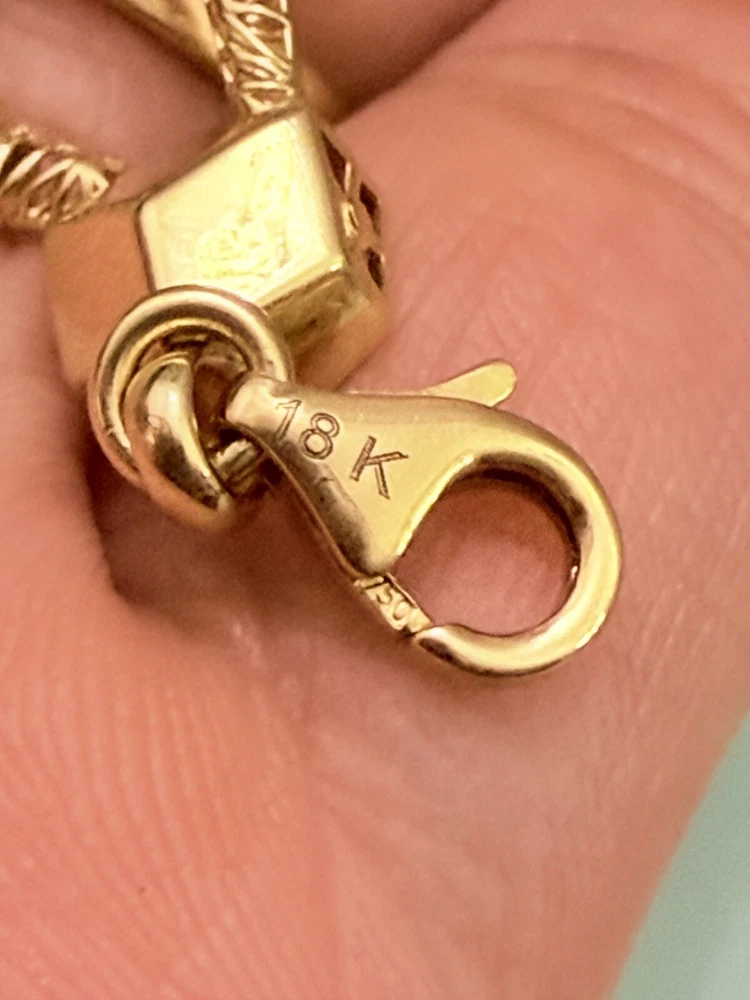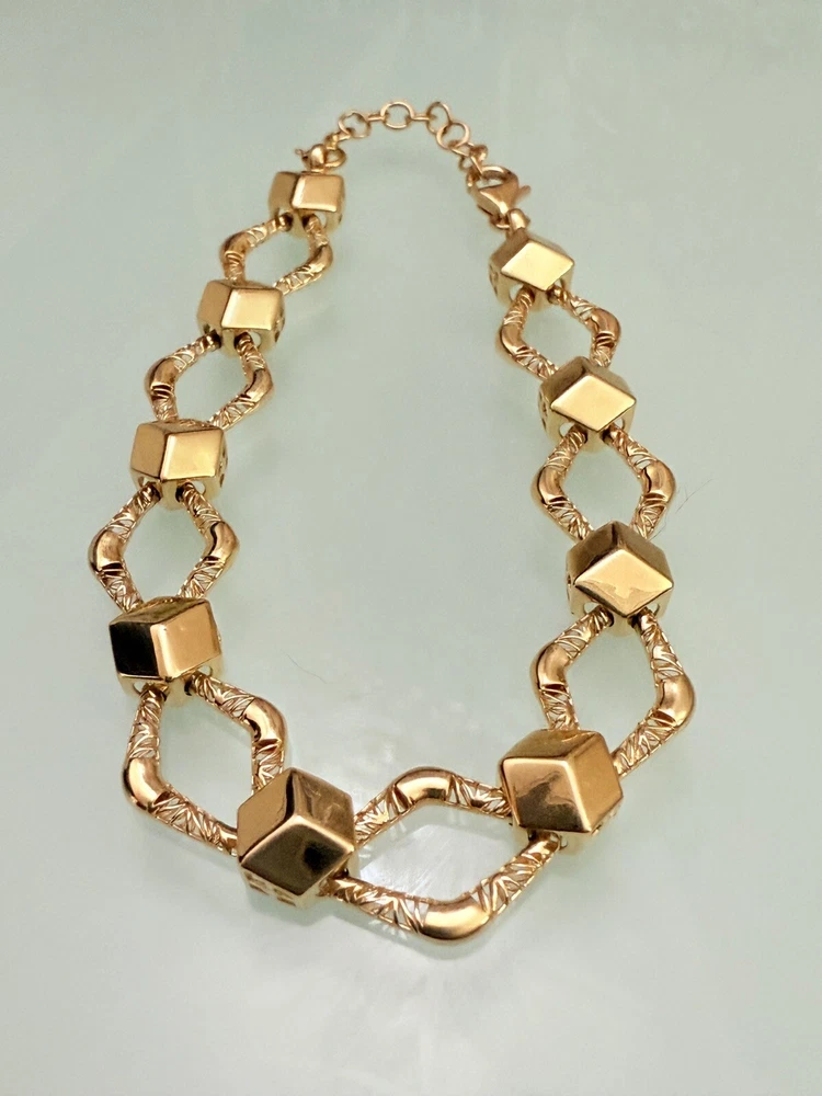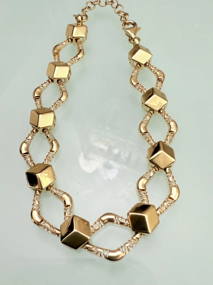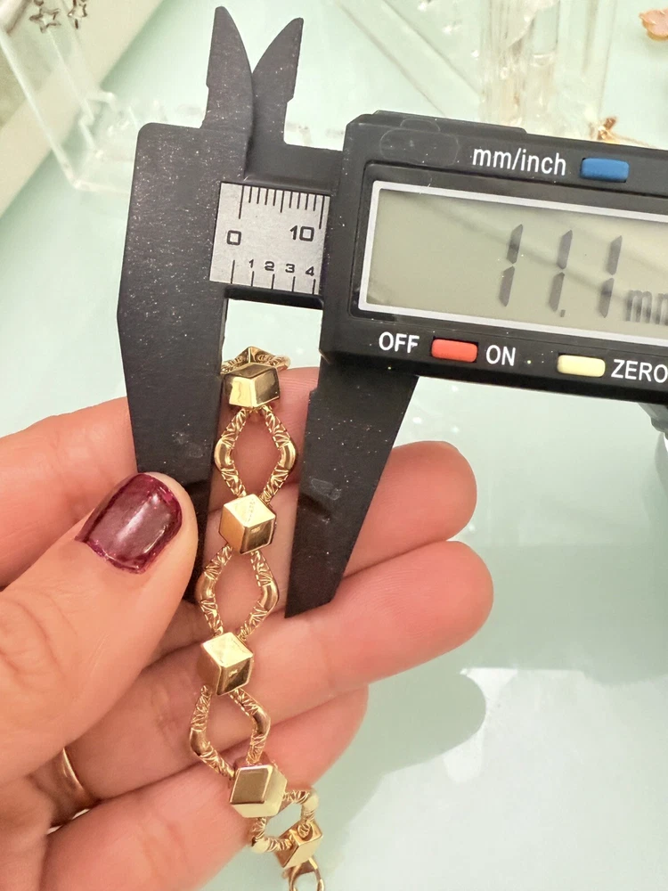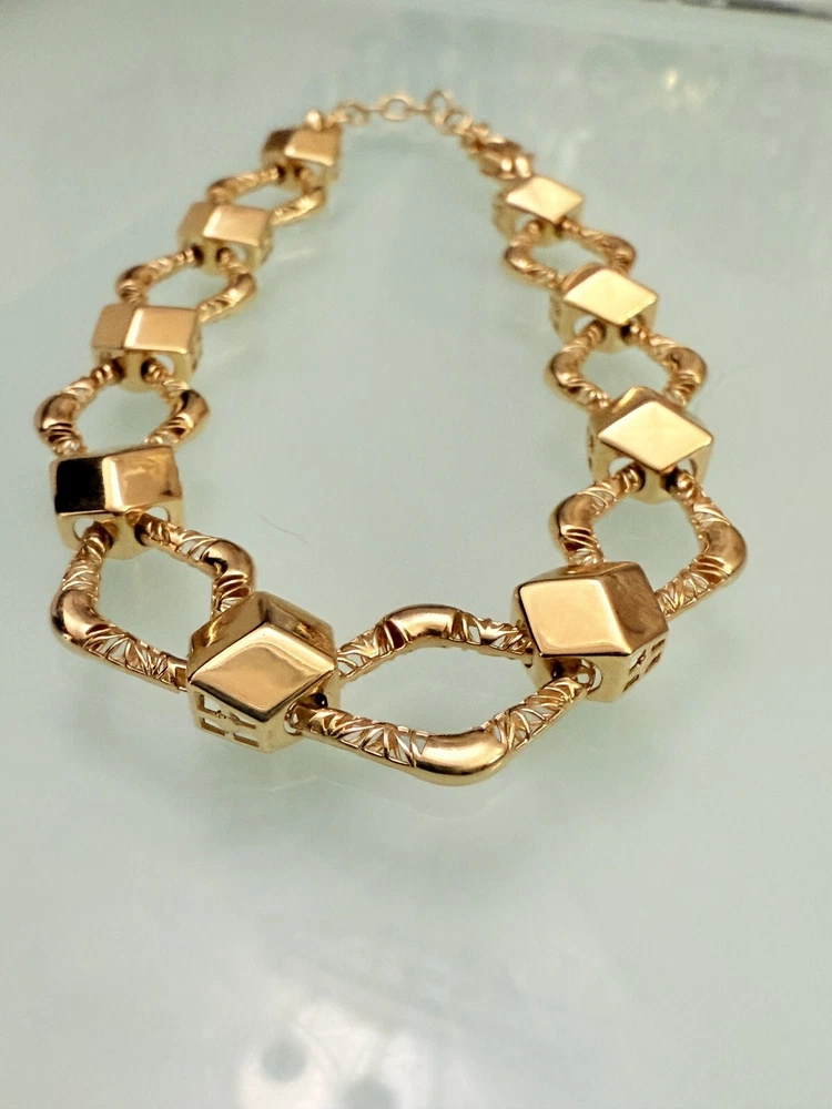 This 18k yellow gold bracelet features a shiny diamond shape design, making it a beautiful Valentine's gift. The bracelet is nickel-free, not plated, and marked as 18k gold. It weighs approximately 7.43g and has a length of 7.25”. The unique design is adjustable and comes in a gift box. Made in the United Arab Emirates, this elegant piece is a perfect choice for special occasions.