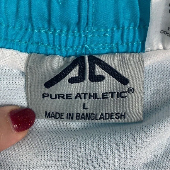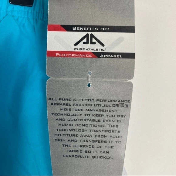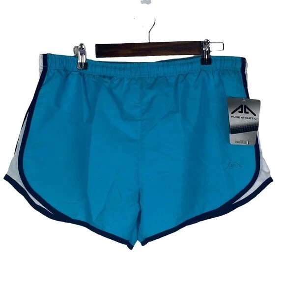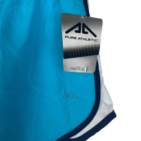 NEW Pure Athletic Women's Large Dritek Performance Teal Blue Black White Trim Inside Panty Athletic Running Shorts. Elastic waistband. Inside drawstring. Inside pocket. Color is more of a teal color than what the pictures show. Great Condition. No rips, flaws, or stains. Smoke free home. 100% Polyester Size: Large Measurements are approximate Waist: 17.5" Inseam: 4" Rise: 12" #2746