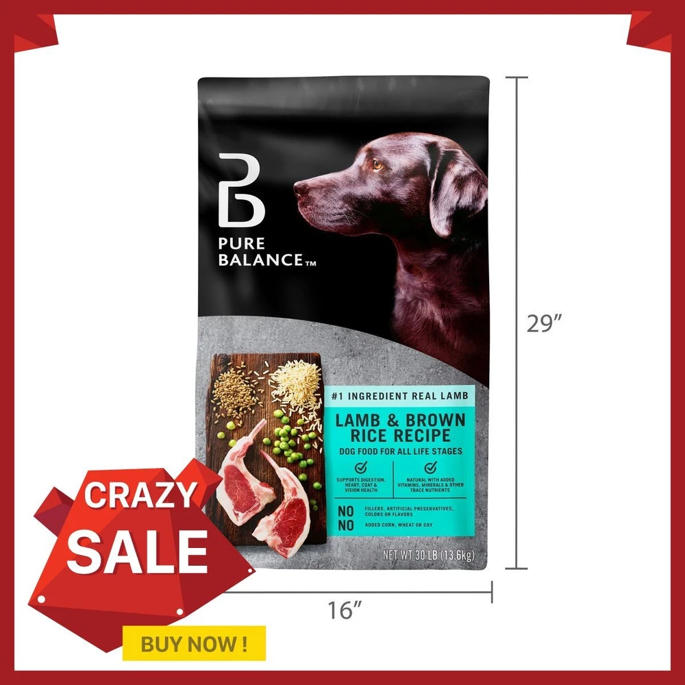 Pure Balance Lamb & Brown Rice Recipe Dry Dog Food, 15 lbs Added vitamins, minerals, and other trace nutrients Omega-6 and Omega-3 fatty acids help support healthy skin and coat Follow the convenient feeding instructions listed on the back of the packaging to ensure your dog is receiving the appropriate amount for their size during feeding times