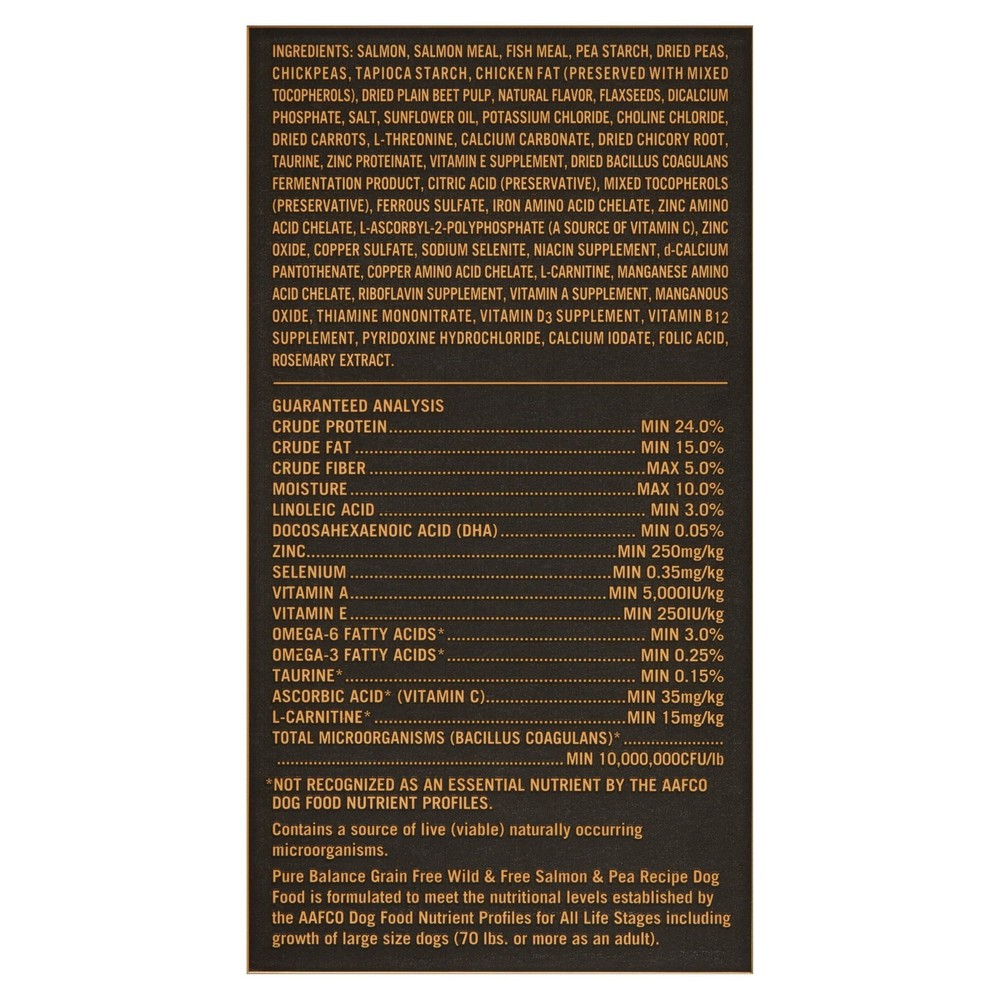Our Pure Balance Wild & Free Grain-Free Salmon & Pea Recipe Dry Dog Food is made with carefully selected ingredients to ensure your dog gets all the nutrition they need. This grain-free Salmon & Pea recipe features real salmon as the first ingredient and has added vitamins, minerals, and other trace nutrients to help support your dog's muscle, digestion, heart, and coat health. Plus, it has no fillers or artificial preservatives, colors, or flavors, and has no corn, wheat, or soy, making it ideal for dogs of all life stages and especially dogs with food sensitivities. Whether your canine companion has seen many years at your side, is a fully blossomed adult, or still has some growing to do, our Pure Balance Wild & Free Grain-Free Salmon & Pea Recipe Dry Dog Food gives your dog the best ingredients, pure and simple. At Pure Balance, we believe in one idea, the best nutrition for your pet starts with ingredients you can trust. Each of our super premium recipes are made with natural ingredients with added vitamins, minerals and other nutrients to ensure your pet gets the nutrition they need. It's the Pure Balance way. Pure and Simple. Pure Balance Wild & Free Salmon & Pea Recipe Dry Dog Food, Grain-Free, 24 lbs: Dry dog food for dogs of all life stages Grain-free formula with no fillers, artificial preservatives, artificial colors, or artificial flavors No added corn, wheat, or soy Supports muscle, digestion, heart, and coat health Natural with added vitamins, minerals, and other trace nutrients Real salmon is the first ingredient Follow the convenient feeding instructions listed on the back of the packaging to ensure your dog is receiving the appropriate amount for their size during feeding times