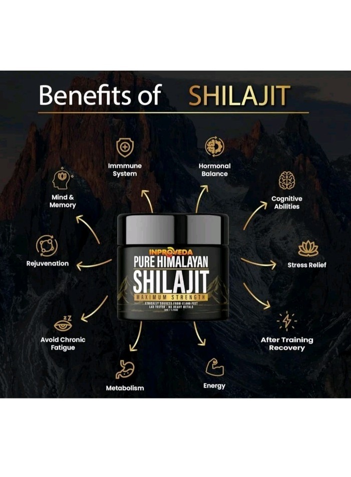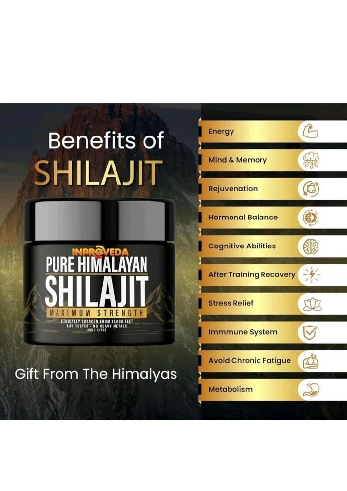 Shilajit Pure Himalayan Organic Resin 600mg Max Strength 85+ Trace Mineral 50gr. *Bottle design may vary*** 85+ Trace Minerals Supplement Facts Attached Himalayan Shilajit Resin: Harvested from the pristine regions of the Himalayas, ensuring the highest quality and authenticity of Shilajit resin. Natural Shilajit Resin: Packed with fulvic acid and essential minerals, our pure shilajit works to rejuvenate energy levels and enhance overall vitality. Health Benefits: Traditionally used in Ayurvedic medicine, golden shilajit supports cognitive health, improves stamina, and aids in nutrient absorption for optimal well-being. Organic & Unrefined: Free from artificial additives and preservatives, our shilajit supplement maintains its purest form for maximum benefits. Rich & Potent Resin: Our pure shilajit resin is carefully processed to preserve its natural potency, delivering a concentrated pure natural shilajit resin for easy consumption and absorption.