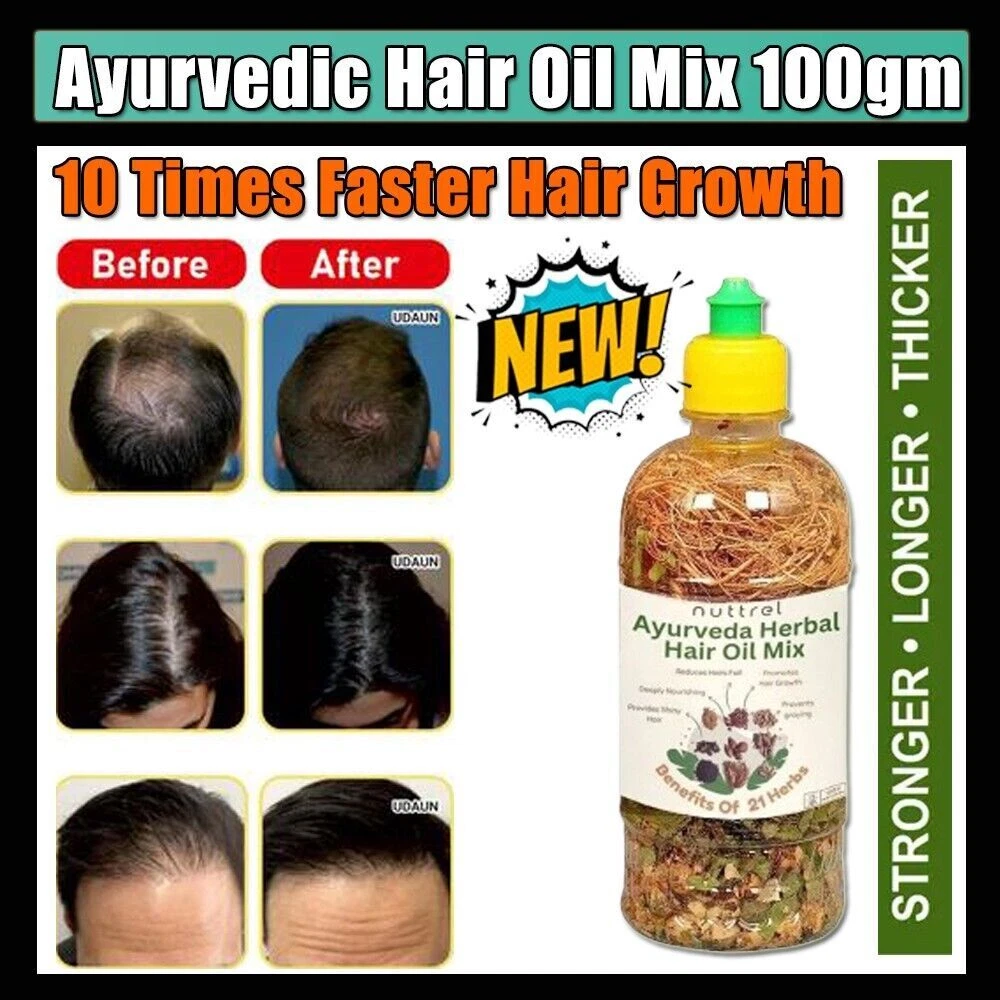 Pure Natural Herbal Hair Oil for Hair Care Infused with Natural Ingredients 50g Brand Nuttrel Ingredients 1. Vetiver root 2. Licorice root 3. Hibiscus flowers 4. Curry leaves 5. Rose petals 6. Senna flowers 7. Spanish cherry flower 8. Screw tree pods 9. Sweet flag 10. Dried Amla berry 11. Myrobalan 12. Black cumin seeds 13. Fenugreek seeds 14. Alkanet 15. White turmeric 16. Babchi seeds 17. Neem seeds 18. Henna seeds..+ 3 More Shipping From India Who Can Use This Oil Men, Women, Unisex For All Age, All People Usage Daily Skin Care, Morning, Afternoon, Night Quantity 1 Bottle ( Buy 3 Bottle Get 1 Bottle Free ) Mfg. 02/2023 Exp. 05/2026 Free From Parabens, Sulphates, Silicones, Synthetic Dyes & Artificial Perfume. 100% Natural Fragrance and Colour It is a unique blend of Bhringraj and 29 more herbs known in Ayurveda Grantha Sahasra Yoga to improve quality of hair, treat split ends, prevent premature greying of hair and hair fall. PROMOTES HAIR GROWTH: The Ayurvedic formulation rejuvenates hair and repairs root damage while reducing hair fall and stimulating growth. STRENGTHENS HAIR FOLLICLES: A good massage with our Bhringraj Amla Hair Oil provides essential nutrients and antioxidants to the roots. It boosts blood circulation and strengthens hair follicles. REDUCES DANDRUFF & DRY SCALP: The soothing formula hydrates and replenishes dry scalp. It has antimicrobial properties that clear dandruff. Clinically Proven to grow new hair in 1 months of regular usage Clinically Tested to provide 4X less hair fall, 3X thicker hair and 3X faster hair growth 100% Ayurvedic Oil, Recommended by Ayurvedic Experts. Our Product is Natural Note: This Product is designed to deliver optimal results, offering high-quality performance and satisfaction. Please note that individual experiences and outcomes may vary based on personal use, preferences, and unique circumstances. For best results, we recommend following the provided guidelines and ensuring the product is used as intended. Product result may vary for every individual.