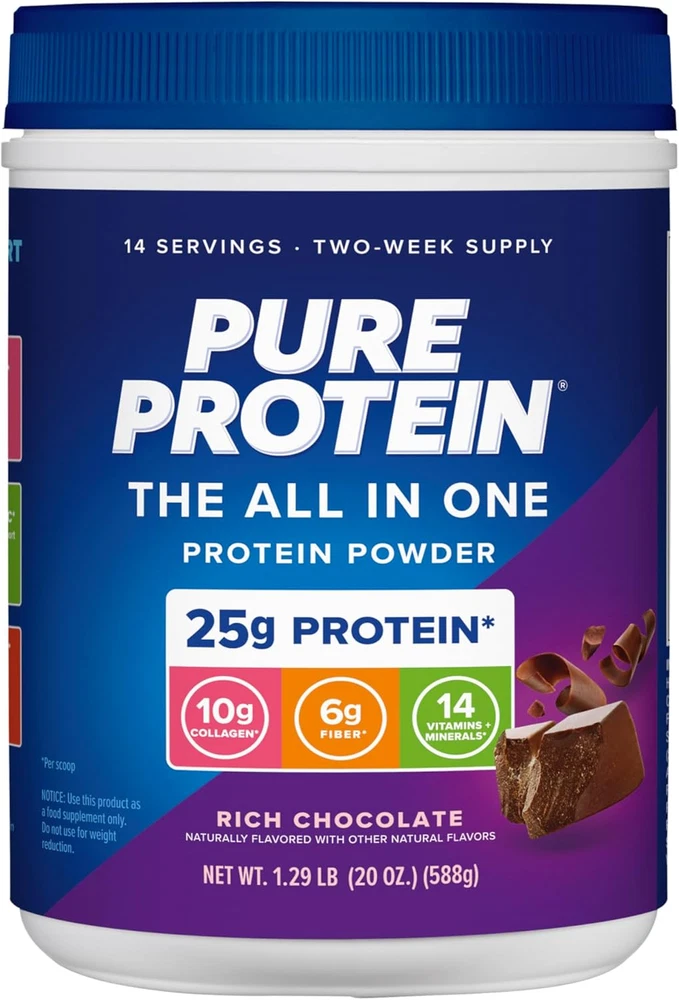 Store New Arrivals Add to Favorite View Feedback Contact Pure Protein All-In-One Powder, Rich Chocolate - Whey & Collagen, High Fiber, Vitamins, No Added Sugar, Non-Gmo, Gluten-Free, 1.25Lb Description Unit Count 20.0 Ounce Number of Items 1 Brand Pure Protein Package Weight 0.72 Kilograms Flavor Name All-in-one Flavor All-in-one Package Dimensions 7.05 x 4.92 x 4.84 inches; 1.59 Pounds Manufacturer Pure Protein The Pure Protein All in One Protein Powder is a game-changing formula designed to simplify your daily nutrition with ingredients to help support lean muscle, skin, joints, and digestive health. Our blend of 15g whey protein, 10g collagen, 6g fiber, and 14 vitamins and minerals give you the everyday boost you need in one simple scoop. Delicious in a smoothie to start your day, or simply shake and enjoy post-workout. It's nutrition made easy, giving you more time to do what you love. Third Party Tested ABOUT US We offer the best prices around on high quality products. Our E-store includes media such as books, movies, music and games while offering electronics, toys, sporting apparel, clothing, tools, general home, garden items and more. SHIPPING We are always working hard to ensure your package arrives as soon as possible. Please understand that some factors like weather, high postal traffic, and the performance of shipping companies are outside of our control. We offer free shipping to the lower 48 states and ship within 2 business days of payment, usually sooner. We do not accept P.O. Boxes. Please provide a physical address. RETURNS We offer a 30-Day Return Policy on items which you are not completely satisfied with. You have the option for a full-refund or an exchange of the item. No returns are available on items shipped outside of the USA. PAYMENT We accept PayPal. CONTACT US This page content is yet to come Please ad us to your favorite seller and visit again later Thank You CUSTOMER SATISFACTION We try our very best to make sure every customer is completely satisfied. If there's a problem, message us! We're happy to help.