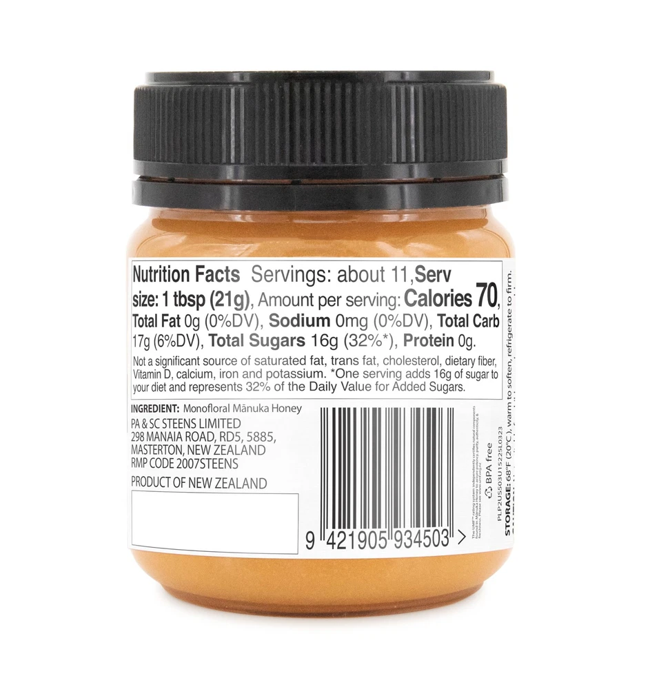 Steens Manuka Honey - bottled and freshly sealed in New Zealand. The best made from Mother Nature. Company founders and beekeepers Paul and Sheryl Steens started making Manuka Honey in the most natural way over 40 years ago. Transparency is important to us. Each jar is traceable to the hive by batch number. RAW & UNPASTEURISED - our Scrape & Separate method ensures a pure raw honey with a crystalline structure as well as a unique taste. Pure enjoyment. RICH IN NUTRIENTS - the nutrient-rich bee pollen components make Steens Manuka Honey a healthy superfood that actively supports your body. UNIQUE MANUKA FACTOR (UMF) - is the highest level of certification. This tests for 9 specific ingredients to guarantee efficacy and authenticity. 54 YEARS OF EXPERIENCE AND FAMILY TRADITION - Paul and Sheryl Steens focus on raw & unpasteurised honey. Transparency is important to us. Each jar is traceable by its batch number.