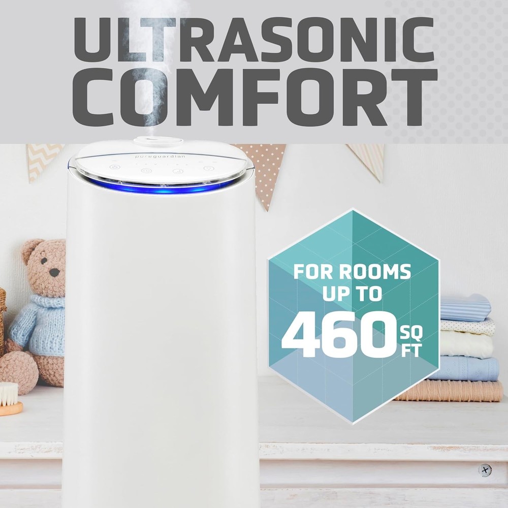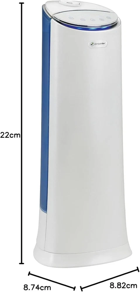 PureGuardian 1.5 Gallon Ultrasonic Warm and Cool Mist Humidifier Blue/White Product Details Brand: GermGuardian Special Feature: Aroma Tray, 1.5 Gallon Tank, Warm and Cool Mist Color: Blue/White Filter Type: No Filter Floor Area: 460 Square Feet Operation Mode: Ultrasonic Product Dimensions: 8.82"D x 8.74"W x 22"H Item Weight: 6.5 Pounds Room Type: Bedroom, Kid's Room, Living Room, Home Office Model Name: H3250WCA Included Components: Humidifier, 1 Aromatherapy Pad included for the Aromatherapy Tray, User Manual Voltage: 120 Volts Wattage: 30 watts Control Method: Touch Shape: Tower Manufacturer: Guardian Technologies Item Weight: 6.5 pounds Item model number: H3250WCA Is Discontinued By Manufacturer: No Assembly required: No Number of pieces: 1 Batteries required: No CapacityRuntime: 1.5 Gallons100 minutes MaterialPower Source: PlasticCorded Electric ULTRASONIC TECHNOLOGY: Quietly disperses a fine mist providing relief from the dry air ENHANCED COMFORT: Sleep better with soothing warm or cool mist, while making life pleasant for those with colds, allergies and dry skin SILVER CLEAN PROTECTED TANK: Silver Clean Protection on the surface of the water tank helps to keep the tank clean 100 HOUR RUN TIME: Up to 100 Hours of Run Time is provided with a large 1.5 gallon tank that is Ideal for medium sized Rooms AROMA TRAY: The Aroma tray option helps create a relaxing environment with your favorite essential oil. Oils not included. The 100-hour* PureGuardian Ultrasonic Cool and Warm Mist Humidifier Tower enhances comfort, helping you sleep better. It provides quick relief from dry air making life pleasant for those with colds, allergies and dry skin. The space-saving tower design, with an easy-to-fill large 1.5 gallon tank, is ideal for use in medium size rooms. Silver Clean™ Protection is embedded in the tank to help keep the water tank cleaner longer. Thanks to ultrasonic technology, it disperses a fine mist into the air, and is ultra-quiet making it ideal to have on while you sleep. This tower humidifier has an optional aroma tray so a few drops of essential oil can be added to create a relaxing atmosphere. The humidifier is equipped with a 12-hour timer, a night light and variable mist control. An indicator light lets you know when it's time to refill the water tank. The humidifier shuts off automatically once empty. Note: Run time is based off of running the unit on low speed, also depends on atmospheric conditions. PureGuardian® aromatherapy oils are not included and must be purchased separately. Do not add oils to the humidifier tank as they can damage the humidifier and void the warranty. Only add essential oils to the pad that is included with the unit. Additional essential oil pads are available separately.