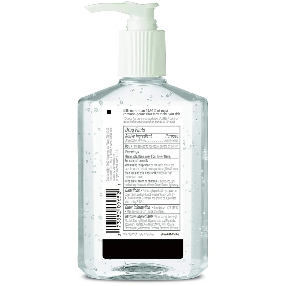Product Description Purell Advanced Hand Sanitizer Refreshing Gel, Moisturizers & Vitamin E, With Pump Dispenser, 8 Fluid Ounce (Pack Of 1) Purell Advanced Hand Sanitizer Refreshing Gel. Purell hand sanitizer is the No. 1 brand most used by hospitals, and it is preferred by healthcare workers. It is proven to kill 99.99 percent of most common germs, without damaging skin. With a blend of four moisturizers, Purell hand sanitizer is perfect for frequent use. The mild formulation is free of parabens, phthalates, preservatives, and harsh ingredients, so it does not dry out or irritate skin. Hands feel soft, even after many uses. Purell hand sanitizer is free of triclosan and will not create supergerms, as the alcohol formulation kills germs fast and evaporates quickly, so germs don’t become resistant. 2X Sanitizing Strength. One squirt of PURELL Advanced Hand Sanitizer equals two squirts of other national brands. Outperforms other sanitizers ounce-for-ounce Show you care about well-being with PURELL Advanced Hand Sanitizer Refreshing Gel, which eliminates 99.99 percent of germs on hands Features a refreshing clean scent and evaporates quickly for easy, convenient sanitizing when soap and water are not available Mild formula and a blend of four moisturizers means hands feel soft even with repeated use; it‰۪s free of triclosan, parabens, phthalates, and preservatives so it doesn't dry out or irritate skin Perfect for frequent use. Mild formulation with 4 moisturizers is free of triclosan, parabens, phthalates, and preservatives so it does not dry out or irritate skin. Help your family and those you care for kill germs on their hands with PURELL Advanced Hand Sanitizer Refreshing Gel. Using PURELL hand sanitizer is a convenient and gentle way to kill germs Perfect for frequent use. Mild formula is free of parabens, phthalates, preservatives and harsh ingredients; so it does not dry out or irritate skin. Hands feel soft, even after many uses Ingredients Active Ingredients: Ethyl Alcohol (70%) v/v. Purpose: Antimicrobial. Inactive Ingredients: Water (Aqua), Isopropyl Alcohol, Caprylyl Glycol, Glycerin, Isopropyl Myristate, Tocopheryl Acetate, Acrylates/C10-30 Alkyl Acrylate Crosspolymer, Aminomethyl Propanol, Fragrance (Parfum). Active Ingredients Ethyl Alcohol Inactive Ingredients Water (Aqua); Isopropyl Alcohol; Caprylyl Glycol; Glycerin; Isopropyl Myristate; Tocopheryl Acetate; Acrylates/C10-30 Alkyl Acrylate Crosspolymer; Aminomethyl Propanol; Fragrance