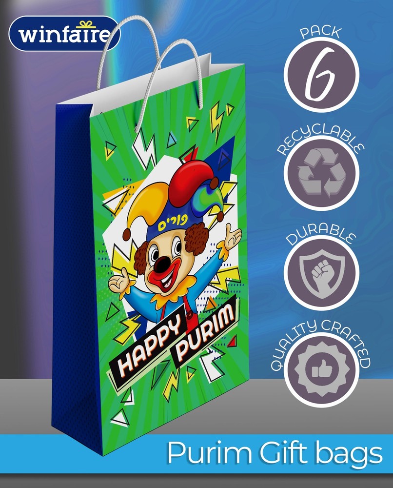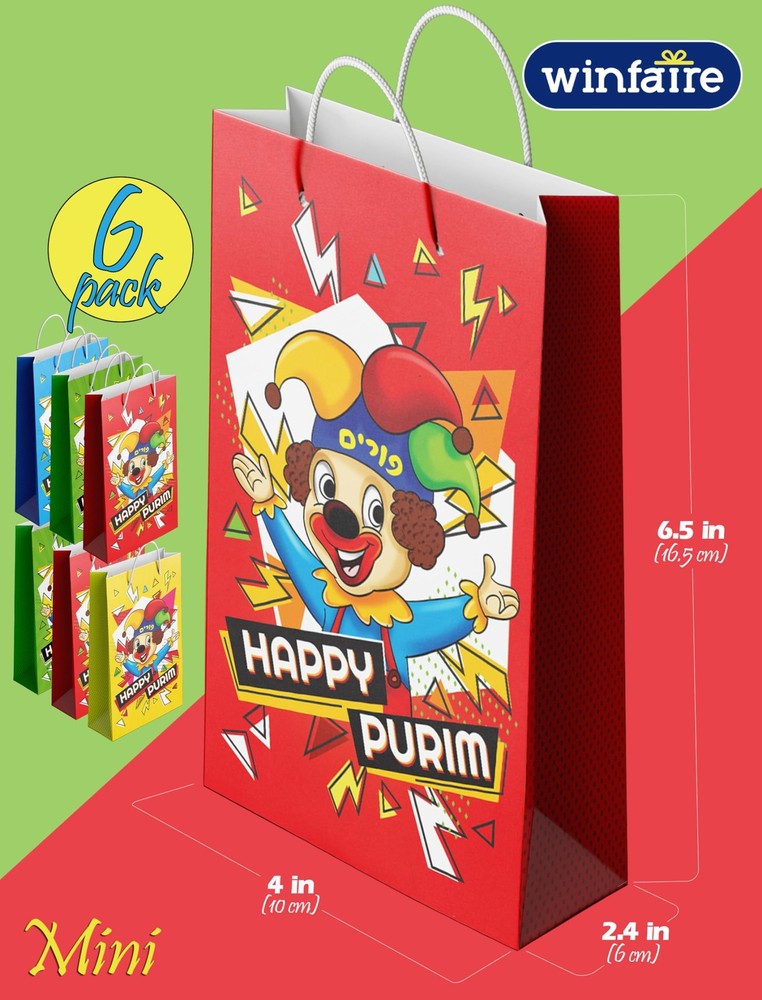 Purim Gift Bags - 4 Pack Small Purim Bags for Mishloach Manot - Purim Boxes and Bags Bulk - Happy Purim Bags and Boxes Purim Sameach! Present your Mishloach Manot in amazingly fun style! PURIM GIFT BAGS WITH ROPE HANDLES: Our twisted rope handle bags are reusable and strong providing for a sturdy hold on your Mishloach Manos Purim gift bags and boxes, making delivery simple. PURIM BAGS: These adorable and durable purim gift bags kids come in a selection of bright, vibrant colors and fun purim designs. Made of premium quality hard paper it is strong enough to stand on its own. 6 PACK PURIM BAGS: Impress your loved ones with our beautifully designed Purim gift bags. Enough to gift all your family and friends CONVENIENT SMALL SIZE: Our happy purim bags is the perfect size, big enough to fit many food items and gifts and small enough for little hands to carry. FUN PURIM DESIGN: Our Purim Gift Bags and party favor boxes collection are embellished with fun and bold Purim designs. celebrates the Jewish faith with gifting items for Purim, Hanukkah, and all year round. Purim Gift Bags With Rope Handles: Our twisted rope handle bags are reusable and strong providing for a sturdy hold on your Mishloach Manos Purim Gift Bags and boxes, making delivery simple. Purim Bags: These durable purim gift bags come in a selection of bright, vibrant colors and fun purim designs. Made of premium quality cardboard paper it is strong enough to stand on its own. 6 Pack Purim Bags: Impress your loved ones with our beautifully designed Purim gift bags. Enough to gift all your family and friends. Convenient Mini Size: Our mini Happy Purim bags measure 4” x 6.5” x 2.4”,big enough to fit many food items and gifts yet small enough for little hands to carry. Fun Purim Design:Our Purim Gift Bags and party favor boxes collection is embellished with fun and bold Purim designs. , a brand that celebrates the Jewish faith with gifting items for Purim, Hanukkah, and all year round