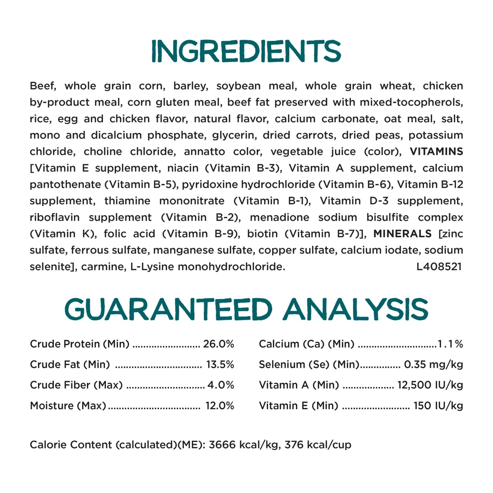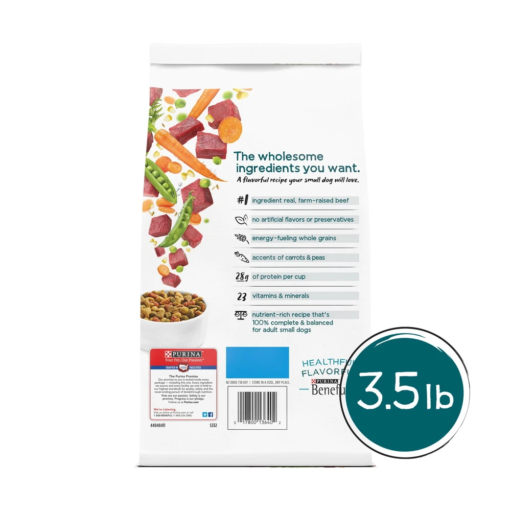 Choosing the right dog kibble for your small breed dog won’t just give your dog the nutrition they need to thrive; it will also help support your smaller dog’s higher metabolism, which is why they need Purina Beneful IncrediBites With Farm-Raised Beef, Purina High Protein Dry Dog Food for Small Dogs. This natural Purina Beneful dog food recipe has everything your small dog needs: a generous 26 grams of protein in each cup to help them develop strong muscles, 23 essential vitamins and minerals to support immune health and overall wellness, plus calcium to help maintain healthy teeth and bones. Featuring delicious farm-raised beef as the number 1 ingredient, this high protein dog food also includes smaller dog kibble for your dog’s tiny mouth to handle more easily. Unlike other dog food brands, Purina Beneful dry dog food is made without artificial flavors or preservatives, so your small breed dog will only get the wholesome nutrition they need and nothing they don’t. Make sure you’re giving your small breed dog the 100 percent complete and balanced nutrition delivered in this Purina Beneful dog food and see the joy in their eyes each time you fill their bowl with this delicious dog kibble. Each bag of Purina Beneful IncrediBites With Farm-Raised Beef Dry Dog Food for Small Dogs is proudly produced and tested for quality and safety in Purina-owned facilities. Purina Beneful dry dog food featuring real farm-raised beef as the number 1 ingredient Dog kibble providing 26 grams of protein per cup to help support muscle strength Naturally delicious natural beef dry dog food for small dogs with added vitamins, minerals and nutrients with no artificial preservatives or flavors and added colors only from natural sources Purina Beneful dog food featuring a calcium-rich recipe to help support strong teeth and bones Provides 100 percent complete and balanced nutrition for small adult dogs, including 23 essential vitamins and minerals to help maintain overall health and immune support for dogs