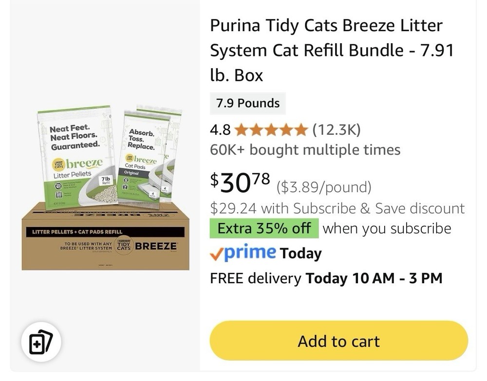Type: Does Not Apply Target Species: Cat Model Name: TDCT BREEZE Pad/Pellet CombiPack US Unit Count: 7.91 Pound Country of Origin: Japan upc: 070230168894 Style: Bundle Pads + Pellets Included Components: Does Not Apply Materials sourced from: Japan Brand: Does Not Apply Size: 7.91 Pound (Pack of 1) Manufacturer recommended age: 1 month and up Item Length: 14.25 Age Range Description: All Life Stages Directions: Animal behaviorists recommend multiple cat households have multip Warranty Description: Purina guarantees outstanding quality. If for any reason youre no Breed Recommendation: All Breed Sizes Manufacturer: Nestle Purina Pet Item Package Dimensions L x W x H: 14.25 x 10.83 x 4.69 inches Material: Pellet Item model number: 70230168894 MPN: Does Not Apply Product Dimensions: 10.85 x 14.35 x 4.65 inches; 7.91 Pounds Date First Available: August 27, 2018 Scent: Unscented Number of Items: 1 Item Weight: 7.91 Pounds Item Width: 10.83 gtin13: Does Not Apply Target Audience Keyword: house-cats Item Height: 4.69 Item Dimensions LxWxH: 10.85 x 14.35 x 4.65 inches EAN: Does Not Apply Global Trade Identification Number: 00070230168894