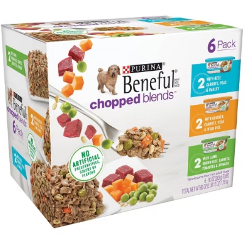 Important Note for Our Valued Customers: To offer you the best prices with free shipping, we occasionally experience shipping delays. If this happens, we’ll notify you immediately, issue a full refund, and invite you to place a new order at your convenience. To keep costs low, we sometimes reuse branded packaging boxes for shipments—we appreciate your understanding if you receive your order in repurposed packaging. Rest assured, all products we sell are 100% brand new, unopened, and freshly manufactured, including pet food and human-grade items, with a minimum 8-month shelf life remaining. If any issues arise, please contact us first—we’re committed to resolving them quickly. If you’re not completely satisfied, we offer a full refund with no hassle. Thank you for your trust and support! Highlights 6-count Beneful Chopped Blends dog food variety pack is made with real chicken, beef or lamb with inclusions of real vegetables and grains you can see High protein dog food helps support strong muscles and contains no artificial colors, flavors or preservatives Wet dog food provides 100 percent complete and balanced nutrition for adult dogs along with 23 essential vitamins and minerals to support overall health Serve the tender, meaty chunks in savory sauce as a delicious meal, or use as enticing wet dog food toppers when mixed with his favorite kibble Beneful dog food proudly produced in Purina-owned, U.S. facilities and packaged in re-closeable dog food tubs for easy storing of leftovers Description Give your dog a high-protein formula that supports his strong muscles with Purina Beneful Chopped Blends variety pack wet dog food. This premium dog food variety pack features high-quality ingredients, including real chicken, beef or lamb, in a reclosable container for easy storage of leftovers. Our high quality dog food recipes also feature wholesome, real ingredients you can see, including vegetables like carrots, peas or tomatoes, along with whole grains like barley and rice. Together, they help create a meal that supports his whole-body health. A savory sauce adds tempting texture that lasts the whole bowl through. We also ensure these adult dog food recipes include 23 essential vitamins and minerals to support your dog’s overall health. Each dog food tray is crafted with no artificial colors, flavors or preservatives and is proudly produced in Purina-owned, U.S. facilities. Serve Beneful wet dog food tubs alone as tasty meals or add them in with your good boy’s favorite kibble as wet dog food toppings for even more delicious variety at mealtime. Providing 100 percent complete and balanced nutrition for adult dogs, our delectable Purina Beneful Chopped Blends dog food tubs make mealtime exciting with a variety of your pal’s favorite flavors plus the nutrition he needs to thrive.