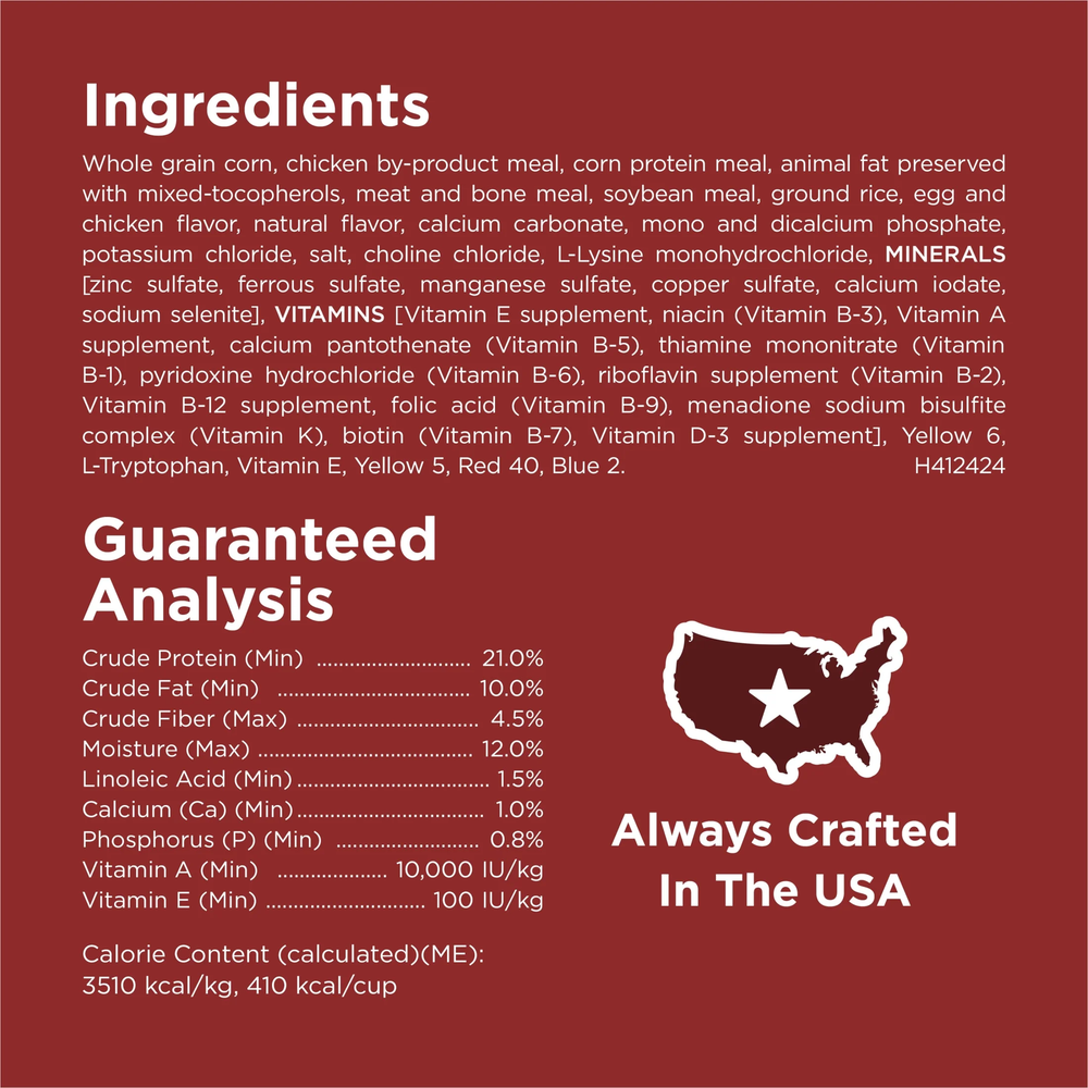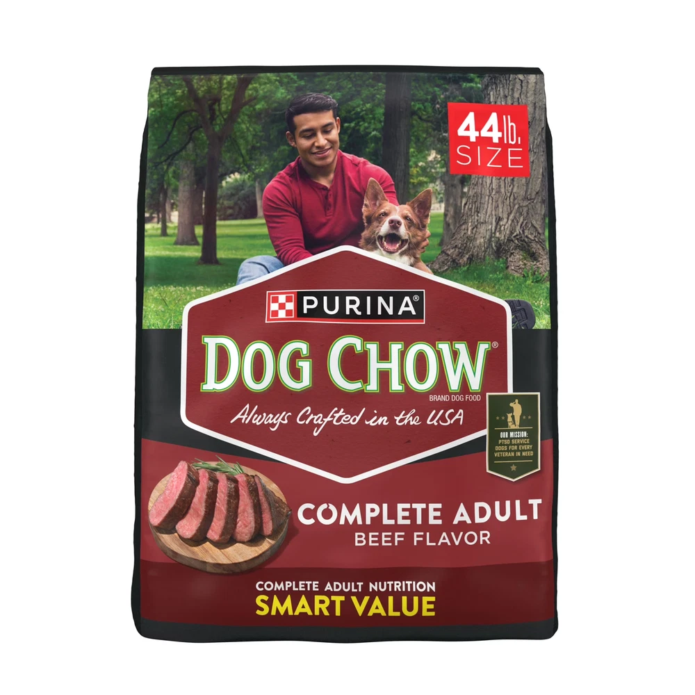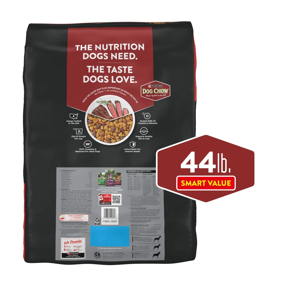 Purina Dog Chow Beef Flavor Dry Dog Food, This delicious adult dog food recipe is made with high quality ingredients, giving them a wholesome dog food meal option that you can both feel good about. With 23 essential vitamins and minerals in every serving, this kibble dog food helps support your dog's overall health and wellness. Crafted without artificial flavors, this Purina dry dog food recipe provides 100 percent complete and balanced nutrition that adult dogs need and supports immune health. Purina Dog Chow Beef Flavor Dry Dog Food, 44 lb Bag 100 percent complete and balanced dry dog food for adult dogs Purina Dog Chow Complete Adult Beef Flavor dog kibble contains 23 essential vitamins and minerals Hard dog food that supports your dog's immune health Purina dog chow beef-flavored formula featuring high-quality protein for dogs to help them build strong muscles Delicious dry dog kibble with a beef flavor that dogs love Ingredients Whole Grain Corn, Chicken By-Product Meal, Corn Protein Meal, Animal Fat Preserved With Mixed-Tocopherols, Meat And Bone Meal, Soybean Meal, Ground Rice, Egg And Chicken Flavor, Natural Flavor, Calcium Carbonate, Mono And Dicalcium Phosphate, Potassium Chloride, Salt, Choline Chloride, L-Lysine Monohydrochloride, MINERALS [Zinc Sulfate, Ferrous Sulfate, Manganese Sulfate, Copper Sulfate, Calcium Iodate, Sodium Selenite], VITAMINS [Vitamin E Supplement, Niacin (Vitamin B-3), Vitamin A Supplement, Calcium Pantothenate (Vitamin B-5), Thiamine Mononitrate (Vitamin B-1), Pyridoxine Hydrochloride (Vitamin B-6), Riboflavin Supplement (Vitamin B-2), Vitamin B-12 Supplement, Folic Acid (Vitamin B-9), Menadione Sodium Bisulfite Complex (Vitamin K), Biotin (Vitamin B-7), Vitamin D-3 Supplement], Yellow 6, L-Tryptophan, Vitamin E, Yellow 5, Red 40, Blue 2. H412424/div>