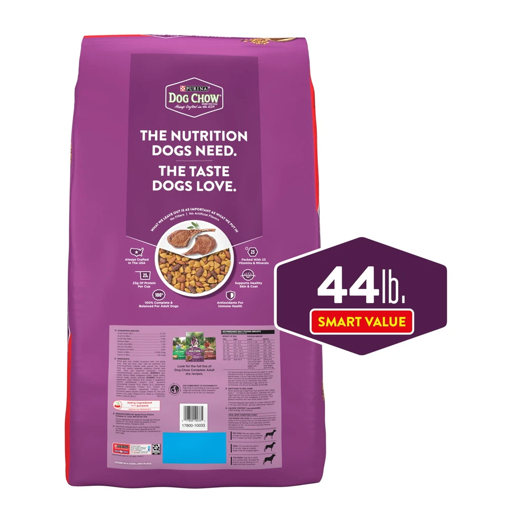 Purina Dog Chow Lamb Flavor Dry Dog Food Complete Adult, Discover a dog kibble that meets your dog's taste requirements while providing 100 percent complete and balanced nutrition with Purina Dog Chow Complete Adult Dry Dog Food With Lamb Flavor. An easily digestible dog food with a crunchy Purina dry dog food texture to help clean your dog's teeth, this formula has a lot to like. Each Purina Dog Chow Complete dog food bag is packed with enough high-quality protein to support your dog's strong muscles. That's not all: this hard dog food delivers 23 vitamins and minerals along with plenty of antioxidants to bolster your dog's immune system. A wholesome dry dog food with an irresistible lamb flavor. Purina Dog Chow Lamb Flavor Dry Dog Food Complete Adult, 18.5 lb Bag 100 percent complete and balanced dry dog food for adult dogs Purina Dog Chow Complete adult dry dog food kibble with high protein for strong muscles Features a tasty Purina dry dog food recipe packed with 23 vitamins and minerals along with antioxidants for immune health Crunchy Purina dog food dry kibble texture helps clean teeth Highly digestible hard dog food recipe proudly tested for quality and safety in Purina facilities