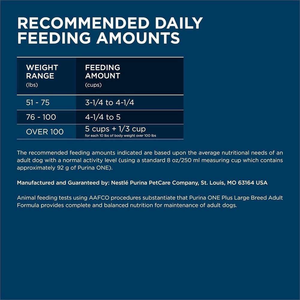 Buyer will not be charged import fees. item location from america package will ship from america you will receive package in 5-8 day Purina ONE Plus Large Breed Adult Dog Food Dry Formula, Real Protein Rich Natural Chicken Flavor - 40 lb. Bag About this item This adult dog food for large dogs is made with real chicken as the first ingredient supports strong muscles, including a healthy heart A SmartBlend of high-quality ingredients in this large adult dog food formula is tailored to support the health of large breed dogs Purina ONE large breed adult dog food includes four antioxidant sources to provide immune support for dogs and omega-6 fatty acids, vitamins and minerals to support a shiny, healthy skin and coat Deliciously crunchy bites and tender meaty morsels deliver great taste in a dog food kibble recipe made with no artificial flavors or preservatives High Protein dog food crafted in Purina-owned, U.S. facilities provides 100 percent nutrition for adult dogs