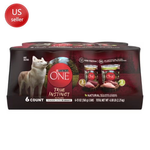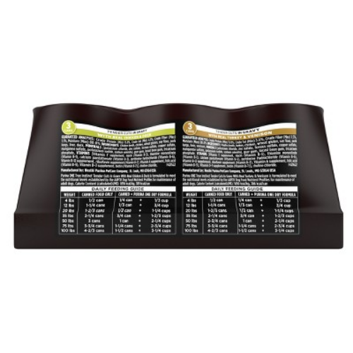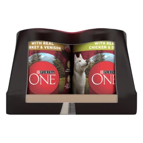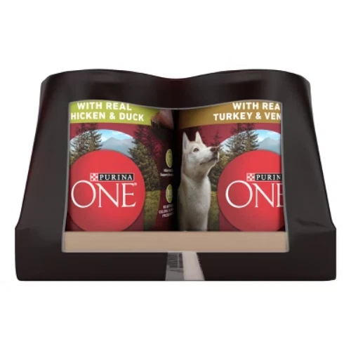 Description Give your dog delicious mealtime choices with this Purina ONE Tender Cuts in Gravy Adult Dog Food Wet Variety Pack Natural with Added Vitamins, Minerals and Nutrients. Two enticing recipes feature real turkey or venison. Plus, each canned dog food recipe supports his strong muscles. No poultry by-products, artificial colors, flavors or preservatives and 0 percent fillers means all of the ingredients in these adult dog wet food recipes have a purpose. Be confident knowing he's getting the nutrition he deserves with this Purina ONE Tender Cuts in Gravy adult dog food wet variety pack. highlights Canned dog food recipes with added vitamins, minerals and nutrients Each bite of these dog food wet formulas features real turkey and venison or real chicken and duck 100 percent nutrition for adult dogs with 0 percent fillers Dog wet food recipes made by veterinarian-recommended Purina ONE Purina ONE dog food with no poultry by-products and no artificial colors, flavors or preservatives Ingredients: tender cuts in gravy with real chicken & duck: chicken broth, chicken, wheat gluten, soy flour, pork lungs, liver, duck, minerals [potassium chloride, zinc sulfate, ferrous sulfate, copper sulfate, manganese sulfate, potassium iodide, sodium selenite], guar gum, locust bean gum, tricalcium phosphate, vitamins [vitamin e supplement, niacin (vitamin b-3), thiamine mononitrate (vitamin b-1), calcium pantothenate (vitamin b-5), pyridoxine hydrochloride (vitamin b-6), vitamin b-12 supplement, riboflavin supplement (vitamin b-2), vitamin a supplement, folic acid (vitamin b-9), vitamin d-3 supplement, biotin (vitamin b-7)], choline chloride. tender cuts in gravy with real turkey & venison: poultry broth, turkey, chicken, wheat gluten, soy flour, pork lungs, liver, venison, minerals [potassium chloride, zinc sulfate, ferrous sulfate, copper sulfate, manganese sulfate, potassium iodide, sodium selenite], guar gum, locust bean gum, tricalcium phosphate, vitamins [vitamin e supplement, niacin (vitamin b-3), thiamine mononitrate (vitamin b-1), calcium pantothenate (vitamin b-5), pyridoxine hydrochloride (vitamin b-6), vitamin b-12 supplement, riboflavin supplement (vitamin b-2), vitamin a supplement, folic acid (vitamin b-9), vitamin d-3 supplement, biotin (vitamin b-7)], choline chloride. f421522. f421622.