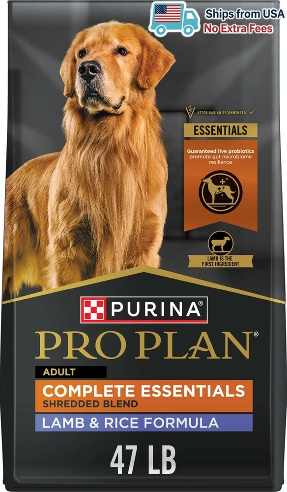 Purina Pro Plan Complete Essentials Adult Shredded Blend Dry Dog Food 47 lb Crunchy dog kibble combined with tender, shredded pieces for taste and texture dogs love. Fortified with live probiotics to help maintain gut microbiome resilience. Vitamin A and omega-6 fatty acids nourish the skin and coat, while natural prebiotic fiber helps deliver digestive support. This recipe is high in protein to support strong muscles, including a healthy heart; it also includes rice as a healthy source of energy-rich carbohydrates. Ingredients are carefully selected to provide key nutrients pets need; Purina Pro Plan dog food offers 100% complete and balanced nutrition for adult dogs. - All orders are shipped directly from our U.S. warehouse - no extra or hidden fees involved. - If you need any assistance regarding the product or your order, please message us. We will respond within 24 hours THANKS FOR WATCHING !!
