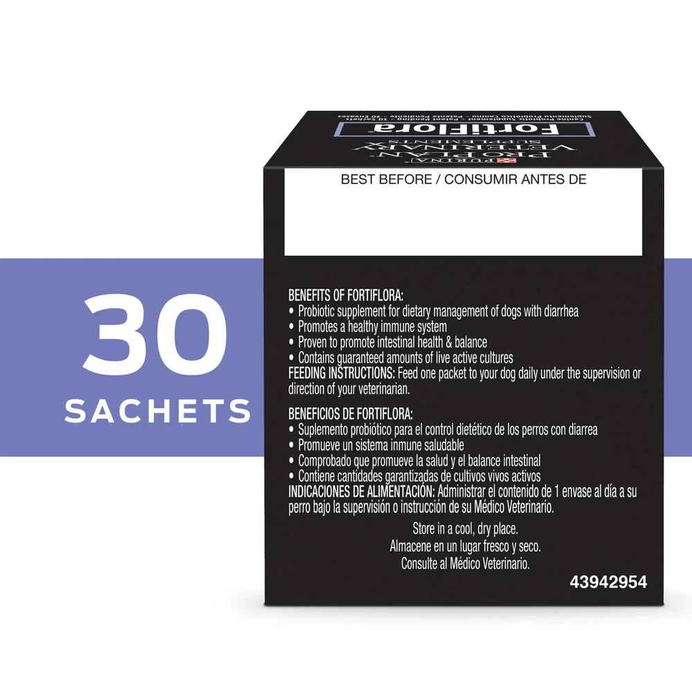 Manage your dog's diarrhea with Purina Pro Plan Veterinary Supplements FortiFlora Canine Probiotic Supplement. These safe and effective probiotic dog supplements are simple to administer by adding the powder to your dog's regular food. When fed with your dog's food, FortiFlora dog probiotics may help support your dog's digestive health and reduce gas. Each packet contains a guaranteed level of live microorganisms that help promote beneficial intestinal microflora. Our proprietary microencapsulation process helps enhance the stability and survival of the microorganisms until they reach your dog's intestinal tract, so your dog gets the maximum benefits from each serving. This formula contains antioxidants and also supports your dog's immune health. Appropriate for administration to both puppies and adult dogs, including those with sensitive stomachs, Purina FortiFlora canine nutritional supplement should be used as directed by your dog's veterinarian. We're now part of the PetIQ family. We Are Advocates for Pet Parents. We believe that all pet parents should be able to provide the necessary care that enhances the lives of their pets. That starts by educating our audience on the importance of preventive veterinary care—and by giving pet parents convenient access to affordable veterinary services and a broad portfolio of pet health and wellness products to keep their pets happy and healthy all year long. Purina Pro Plan FortiFlora Probiotic Supplement for Dogs, 30 Sachets #1 probiotic recommended by veterinarians Probiotic supplement for the dietary management of puppies and adult dogs with diarrhea Contains a probiotic to promote normal intestinal microflora Proprietary microencapsulation process for enhanced stability Easy to feed probiotic powder supplement for all dogs, including those with sensitive stomachs Increases levels of beneficial bacteria; Contains a guaranteed level of live microorganisms Helps reduce gas in dogs info: