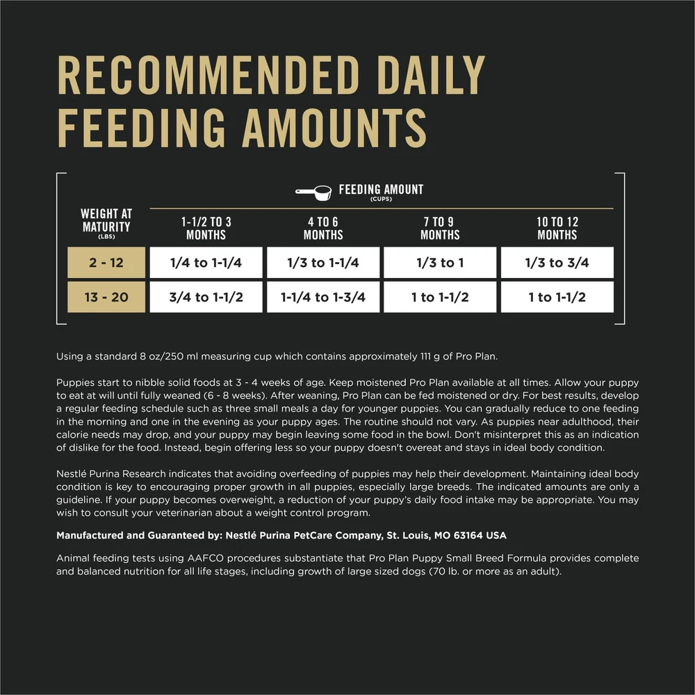 Purina Pro Plan High Protein Small Breed Puppy Food DHA 18 Pound (Pack of 1) Description Get your puppy's life started out right with Purina Pro Plan Brand Dog Food Puppy Small Breed Chicken and Rice Formula dry puppy food. This puppy kibble is high in protein, including chicken as the first ingredient, to meet the needs of highly active small dogs. With no artificial colors or flavors, every ingredient is carefully selected for a specific nutritional or functional purpose, giving your puppy specialized nutrition to meet his needs during the early stages of life. With its bite-sized kibble, this puppy dog food helps make chewing easier for your small dog, and the highly digestible puppy food formula promotes nutrient availability and absorption so your puppy can get the most out of every bite. Real poultry in this small breed puppy food helps provide for your dog's protein needs. Make this super-premium Purina dry puppy food part of your small breed companion's daily diet, and keep him wriggling with happiness. Features: High in protein to meet the needs of highly active small dogs Real chicken is the first ingredient Used to be known as FOCUS Chicken and Rice Formula DHA from omega-rich fish oil nourishes brain and vision development Product Details: Handling We will ship all orders within 1 business day of payment. Delivery We Do Not Ship Outside of the Continental US. Return Policy All items qualify for returns within 30 days of receipt. Buyer is responsible for return shipping on any item that is not damaged. Feedback We take our reputation seriously, we buy and sell online, so we understand the value of trust. If you are unsatisfied with your order, please contact us and we will work with you to resolve it to your satisfaction.