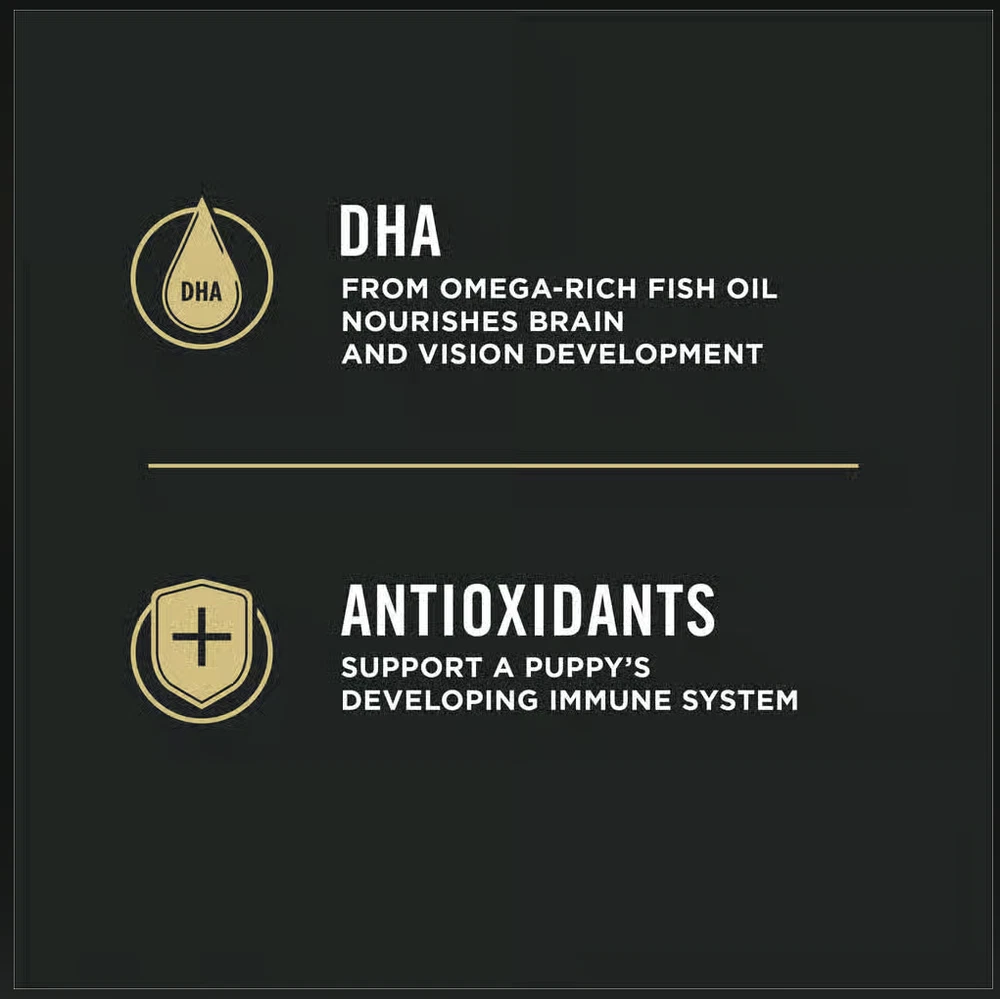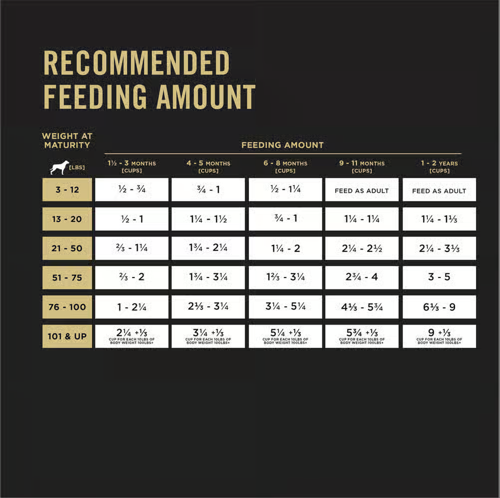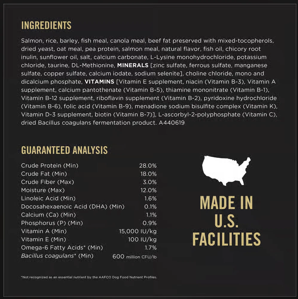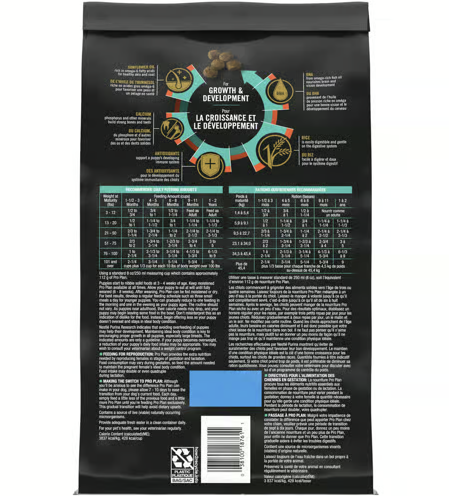 Purina Pro Plan Puppy Sensitive Skin & Stomach Salmon & Rice Formula Dry Dog Food What is Purina Pro Plan Puppy Sensitive Skin & Stomach Salmon & Rice Formula Dry Dog Food? Nourish your puppy with specialized nutrition formulated for their first year of life with Purina Pro Plan Puppy Sensitive Skin and Stomach Salmon and Rice Formula dry puppy food. Every high-quality ingredient is carefully chosen for a specific nutritional or functional purpose. Purina makes this sensitive stomach puppy food without artificial colors or flavors. Start your puppy off on the right path in life by giving them the targeted, high-quality nutrition in Purina Pro Plan Puppy Sensitive Skin and Stomach Salmon and Rice Formula dry puppy food. Suitable for: Dogs (Puppy Under 1 Year) Benefits: Salmon is the first ingredient Contains rice for sensitive stomachs Sunflower oil rich in omega-6 fatty acids for healthy skin and coat DHA from omega-rich fish oil nourishes brain and vision development Antioxidants support a puppy’s developing immune system Calcium, phosphorus and other minerals build strong bones and teeth Guaranteed live probiotics for digestive and immune health. How does Purina Pro Plan Puppy Sensitive Skin & Stomach Salmon & Rice Formula Dry Dog Food work? This wholesome dog kibble features salmon as the first ingredient and rice, which is gentle on sensitive stomachs. Purina uses sunflower oil, a rich source of omega-6 fatty acids, and vitamin A to support your puppy's healthy skin and coat. DHA, from omega-rich fish oil, nourishes brain and vision development. Antioxidants in this puppy food support your puppy's developing immune system, while calcium, phosphorus and other minerals help build strong bones and teeth. They fortify this Purina Pro Plan sensitive skin and stomach formula with guaranteed live probiotics to support digestive and immune health and include natural prebiotic fiber to nourish specific intestinal bacteria for digestive health. Purina Pro Plan Puppy Sensitive Skin & Stomach Salmon & Rice Formula Dry Dog Food Directions: Feeding Weaning Pups: Puppies start to nibble solid foods at 3 - 4 weeks of age. Keep moistened Pro Plan available at all times.Allow your puppy to eat at will until fully weaned (6 - 8 weeks). Feeding Growing Pups: After weaning, Pro Plan can be fed moistened or dry. As puppies near adulthood, their calorie needs may drop, and your puppy may begin leaving some food in the bowl. Don’t misinterpret this as an indication of dislike for the food. Instead, begin offering less so your puppy doesn’t overeat and stays in ideal body condition. Feeding For Reproduction: Pro Plan provides the extra nutrition needed by reproducing females in stages of gestation and lactation.Food consumption may vary during gestation, so feed the amount needed to maintain the pregnant female’s ideal body condition. Food intake may double or even quadruple during lactation. Making the Switch to Pro Plan: Although you'll be anxious to see the difference Pro Plan can make in your dogs please allow 7-10 days to ease the transition from your dog's current food. Each day, simply feed a little less of the previous food and a little more Pro Plan until you're feeding Pro Plan exclusively. This gradual transition will help avoid dietary upsets. Tip: For best results, develop a regular feeding schedule such as three small meals a day for younger puppies. You can gradually reduce to one feeding in the morning and one in the evening as your puppy ages. The routine should not vary. Purina Pro Plan Puppy Sensitive Skin & Stomach Salmon & Rice Formula Dry Dog Food Dosage: Feeding Guidelines Weight at Maturity 1 1/2 - 3 Months 4 - 5 Months 6 - 8 Months 9 - 11 Months 1 - 2 Years 3 - 12 lbs 1/2 - 3/4 cup 3/4 - 1 cup 1/2 - 1 1/4 cups Feed as Adult Feed as Adult 13 - 20 lbs. 1/2 - 1 cup 1 1/4 - 1 1/2 cups 3/4 - 1 cup 1 - 1 1/4 cups 1 1/4 - 1 1/3 cups 21 - 50 lbs. 2/3 - 1 1/4 cup 1 3/4 - 2 1/4 cups 1 1/4 - 2 cups 2 1/4 - 2 1/2 cups 2 1/4 - 3 1/3 cups 51 - 75 lbs. 2/3 - 2 cups 1 3/4 - 3 1/4 cups 1 2/3 - 3 1/4 cups 2 3/4 - 4 cups 3 - 5 cups 76 - 100 lbs. 1 - 2 1/4 cups 2 1/3 - 3 1/4 cups 3 1/4 - 5 1/4 cups 4 1/3 - 5 3/4 cups 6 1/3 - 9 cups Over 100 lbs 2 1/4 cups plus 1/3 cup for each 10 lbs of body weight over 100 3 1/4 cups plus 1/3 cup for each 10 lbs of body weight over 100 5 1/4 cups plus 1/3 cup for each 10 lbs of body weight over 100 5 3/4 cups plus 1/3 cup for each 10 lbs ofbody weight over 100 9 cups plus 1/3 cup for each 10 lbs of body weight over 100 Purina Pro Plan Puppy Sensitive Skin & Stomach Salmon & Rice Formula Dry Dog Food Ingredients: Guaranteed Analysis Guaranteed Analysis Amount Crude Protein (Min) 28.0% Crude Fat (Min) 18.0% Crude Fiber (Max) 3.0% Moisture (Max) 12.0% Linoleic Acid (Min) 1.6% Docosahexaenoic Acid (DHA) (Min) 0.1% Calcium (Ca) (Min) 1.1% Phosphorus (P) (Min) 0.9% Vitamin A (Min) 15,000 IU/kg Vitamin E (Min) 100 IU/kg Omega-6 Fatty Acids* (Min) 1.7% Bacillus coagulans* (Min) 600 million CFU/lb Note *Not recognized as an essential nutrient by the AAFCO Dog Food Nutrient Profiles. Ingredients Salmon, Rice, Barley, Fish Meal, Canola Meal, Beef Fat Preserved With Mixed-Tocopherols, Dried Yeast, Oat Meal, Pea Protein, Salmon Meal, Natural Flavor, Fish Oil, Chicory Root Inulin, Sunflower Oil, Salt, Calcium Carbonate, L-Lysine Monohydrochloride, Potassium Chloride, Taurine, DL-Methionine, MINERALS [Zinc Sulfate, Ferrous Sulfate, Manganese Sulfate, Copper Sulfate, Calcium Iodate, Sodium Selenite], Choline Chloride, Mono And Dicalcium Phosphate, VITAMINS [Vitamin E Supplement, Niacin (Vitamin B-3), Vitamin A Supplement, Calcium Pantothenate (Vitamin B-5), Thiamine Mononitrate (Vitamin B-1), Vitamin B-12 Supplement, Riboflavin Supplement (Vitamin B-2), Pyridoxine Hydrochloride (Vitamin B-6), Folic Acid (Vitamin B-9), Menadione Sodium Bisulfite Complex (Vitamin K), Vitamin D-3 Supplement, Biotin (Vitamin B-7)], L-Ascorbyl-2-Polyphosphate (Vitamin C), Dried Bacillus Coagulans F
