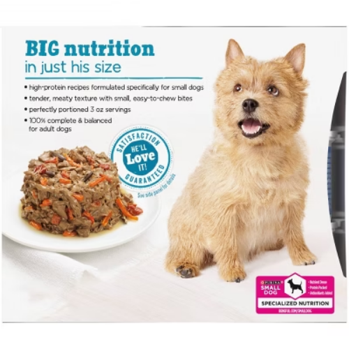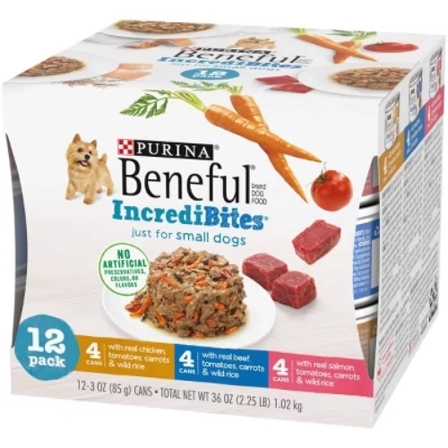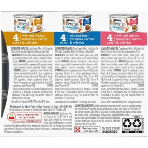 Important Note for Our Valued Customers: To offer you the best prices with free shipping, we occasionally experience shipping delays. If this happens, we’ll notify you immediately, issue a full refund, and invite you to place a new order at your convenience. To keep costs low, we sometimes reuse branded packaging boxes for shipments—we appreciate your understanding if you receive your order in repurposed packaging. Rest assured, all products we sell are 100% brand new, unopened, and freshly manufactured, including pet food and human-grade items, with a minimum 8-month shelf life remaining. If any issues arise, please contact us first—we’re committed to resolving them quickly. If you’re not completely satisfied, we offer a full refund with no hassle. Thank you for your trust and support! Description Feed your small dog an assortment of big flavors and provide wholesome nutrition with a Purina Beneful IncrediBites adult wet dog food variety pack. Each of these protein-rich recipes features bite-sized, meaty chunks that are easy for his small mouth and teeth to manage along with a touch of savory sauce. Plus, our premium wet dog food for small dogs is made with real salmon or farm-raised beef or chicken to help provide a variety of delicious flavors sure to keep mealtime exciting for your pal. We craft each small dog recipe with no artificial colors, flavors or preservatives. This Beneful small adult dog food offers 100 percent complete and balanced nutrition and supplies 23 essential vitamins and minerals. With real meat, poultry or fish, along with real vegetables you can see, our Beneful small breed adult dog food delivers healthy food choices that also taste great. Your little guy finds flavor in each bite of the small dog food with gravy, and you find the enjoyment that comes from feeding him good food that's also good for him. Serve these tasty Purina Beneful IncrediBites for small dogs recipes alone as mouthwatering meals, or mix them in with his favorite kibble as tempting wet dog food toppings to add even more flavor and fun to his bowl. Either way, you're sure to get his little tail wagging every time you serve up one of the delicious options found in this Purina Beneful IncrediBites small breed variety pack dog food. highlights Beneful IncrediBites variety pack made with real beef, chicken or salmon and real vegetables you can see formulated specifically for small dogs High protein dog food helps support strong muscles and contains no artificial colors, flavors or preservatives Small, tender bites are perfect for small mouths, and a flavorful gravy adds the finishing touch to this small adult dog food 100 percent complete and balanced small breed adult dog food includes 23 essential vitamins and minerals Purina Beneful IncrediBites is made specially for small dogs in 3 oz. cans and proudly produced in Purina-owned, U.S. facilities Amount With Real Chicken, Tomatoes, Carrots & Wild Rice: % Daily Value* Crude Protein (Min) 11% Crude Fat (Min) 2.5% Crude Fiber (Max) 1.5% Moisture (Max) 76% * Percentage of Daily Values are based on a 2,000 calorie diet. Amount With Real Beef, Tomatoes, Carrots & Wild Rice : % Daily Value* Crude Protein (Min) 11% Crude Fat (Min) 2.5% Crude Fiber (Max) 1.5% Moisture (Max) 76% * Percentage of Daily Values are based on a 2,000 calorie diet. Amount With Real Salmon, Tomatoes, Carrots & Wild Rice: % Daily Value* Crude Protein (Min) 11% Crude Fat (Min) 2.5% Crude Fiber (Max) 1.5% Moisture (Max) 76% * Percentage of Daily Values are based on a 2,000 calorie diet. Ingredients: with real salmon, tomatoes, carrots & wild rice - chicken broth, chicken, wheat gluten, liver, salmon, tomatoes, meat by-products, carrots, wild rice, corn starch-modified, soy flour, minerals [potassium chloride, zinc sulfate, ferrous sulfate, copper sulfate, manganese sulfate, potassium iodide, sodium selenite], tricalcium phosphate, choline chloride, vitamins [vitamin e supplement, niacin (vitamin b-3), thiamine mononitrate (vitamin b-1), calcium pantothenate (vitamin b-5), pyridoxine hydrochloride (vitamin b-6), vitamin b-12 supplement, riboflavin supplement (vitamin b-2), vitamin a supplement, folic acid (vitamin b-9), vitamin d-3 supplement, biotin (vitamin b-7)], with real beef, tomatoes, carrots & wild rice - beef broth, beef, wheat gluten, liver, meat by-products, tomatoes, carrots, wild rice, corn starch-modified, soy flour, minerals [potassium chloride, zinc sulfate, ferrous sulfate, copper sulfate, manganese sulfate, potassium iodide, sodium selenite], tricalcium phosphate, choline chloride, vitamins [vitamin e supplement, niacin (vitamin b-3), thiamine mononitrate (vitamin b-1), calcium pantothenate (vitamin b-5), pyridoxine hydrochloride (vitamin b-6), vitamin b-12 supplement, riboflavin supplement (vitamin b-2), vitamin a supplement, folic acid (vitamin b-9), vitamin d-3 supplement, biotin (vitamin b-7)], with real chicken, tomatoes, carrots & wild rice - chicken broth, chicken, wheat gluten, liver, meat by-products, tomatoes, carrots, wild rice, corn starch-modified, soy flour, minerals [potassium chloride, zinc sulfate, ferrous sulfate, copper sulfate, manganese sulfate, potassium iodide, sodium selenite], tricalcium phosphate, choline chloride, vitamins [vitamin e supplement, niacin (vitamin b-3), thiamine mononitrate (vitamin b-1), calcium pantothenate (vitamin b-5), pyridoxine hydrochloride (vitamin b-6), vitamin b-12 supplement, riboflavin supplement (vitamin b-2), vitamin a supplement, folic acid (vitamin b-9), vitamin d-3 supplement, biotin (vitamin b-7)]