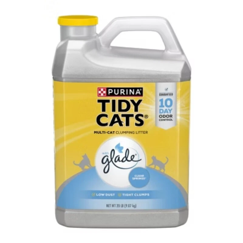 Important Note for Our Valued Customers: To offer you the best prices with free shipping, we occasionally experience shipping delays. If this happens, we’ll notify you immediately, issue a full refund, and invite you to place a new order at your convenience. To keep costs low, we sometimes reuse branded packaging boxes for shipments—we appreciate your understanding if you receive your order in repurposed packaging. Rest assured, all products we sell are 100% brand new, unopened, and freshly manufactured, including pet food and human-grade items, with a minimum 8-month shelf life remaining. If any issues arise, please contact us first—we’re committed to resolving them quickly. If you’re not completely satisfied, we offer a full refund with no hassle. Thank you for your trust and support! Description Bring the power of two trusted names in odor control to your home with Purina Tidy Cats With Glade Clear Springs clumping litter. This clumping multi cat litter neutralizes ammonia, urine and fecal odors, keeping each litter box smelling clean and pleasant for 10 days when used as directed. Backed by the power of Glade, this clay cat litter defends against strong scents, leaving a fresh fragrance behind. Our low dust clumping litter solution forms strong, tight clumps, making litter box maintenance a simple task. Formulated for multiple cats, this litter stands up to regular use by all your feline family members, and the moisture-locking technology keeps them dry, comfortable and willing to use their boxes each day. Make it simple to check kitty litter box cleaning off of your list with this powerful odor-control solution, and get back to spending more quality time with your beloved cat companions. For the great formula you love and the performance you expect, now with a new look, trust in Purina Tidy Cats With Glade Clear Springs clumping litter. highlights Guaranteed 10-day odor control when used as directed Clay kitty litter forms strong, tight clumps for easy cleanup Low dust cat litter formula for a clean pour Glade Clear Springs scented cat litter adds a pleasant fragrance to your litter box area Formulated for multiple-cat households