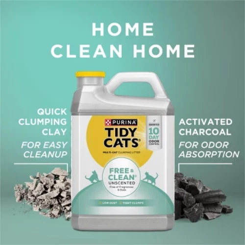 Important Note for Our Valued Customers: To offer you the best prices with free shipping, we occasionally experience shipping delays. If this happens, we’ll notify you immediately, issue a full refund, and invite you to place a new order at your convenience. To keep costs low, we sometimes reuse branded packaging boxes for shipments—we appreciate your understanding if you receive your order in repurposed packaging. Rest assured, all products we sell are 100% brand new, unopened, and freshly manufactured, including pet food and human-grade items, with a minimum 8-month shelf life remaining. If any issues arise, please contact us first—we’re committed to resolving them quickly. If you’re not completely satisfied, we offer a full refund with no hassle. Thank you for your trust and support! Description Fill your cats' litter boxes with Purina Tidy Cats Free & Clean Unscented Clumping Multi Cat litter, and provide them with uncompromising odor control. This litter solution is free of fragrances and dyes, making it an ideal option for cats and pet parents who prefer unscented cat litter. Guaranteed odor control helps you maintain a clean-smelling home for up to 10 days when used as directed, and our low dust cat litter formula helps provide a clean pour. We formulate this clay cat litter with activated charcoal to help absorb odors, and it forms tight, strong clumps for easy cleaning. Let your cats paw their way through this litter made with natural clay and activated charcoal, and watch as they purr in appreciation after each use. Choose this Purina Tidy Cats litter. It's the same great formula you know and love with the same performance you expect, now with a new look. highlights Guaranteed 10-day odor control when used as directed Unscented cat litter formula made without fragrances and dyes Multi cat litter with activated charcoal absorbs odors Tidy Cats clumping litter offers uncompromising odor control Low dust clumping cat litter formula helps provide a clean pour into each litter box