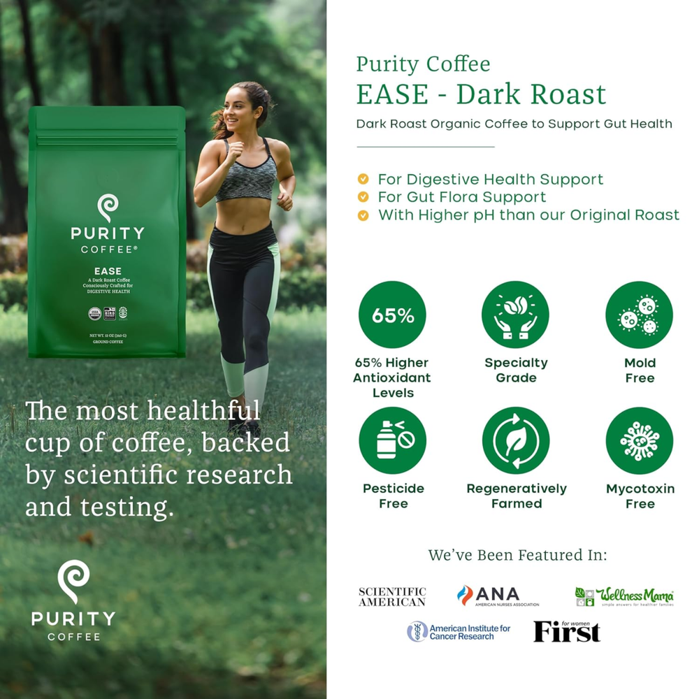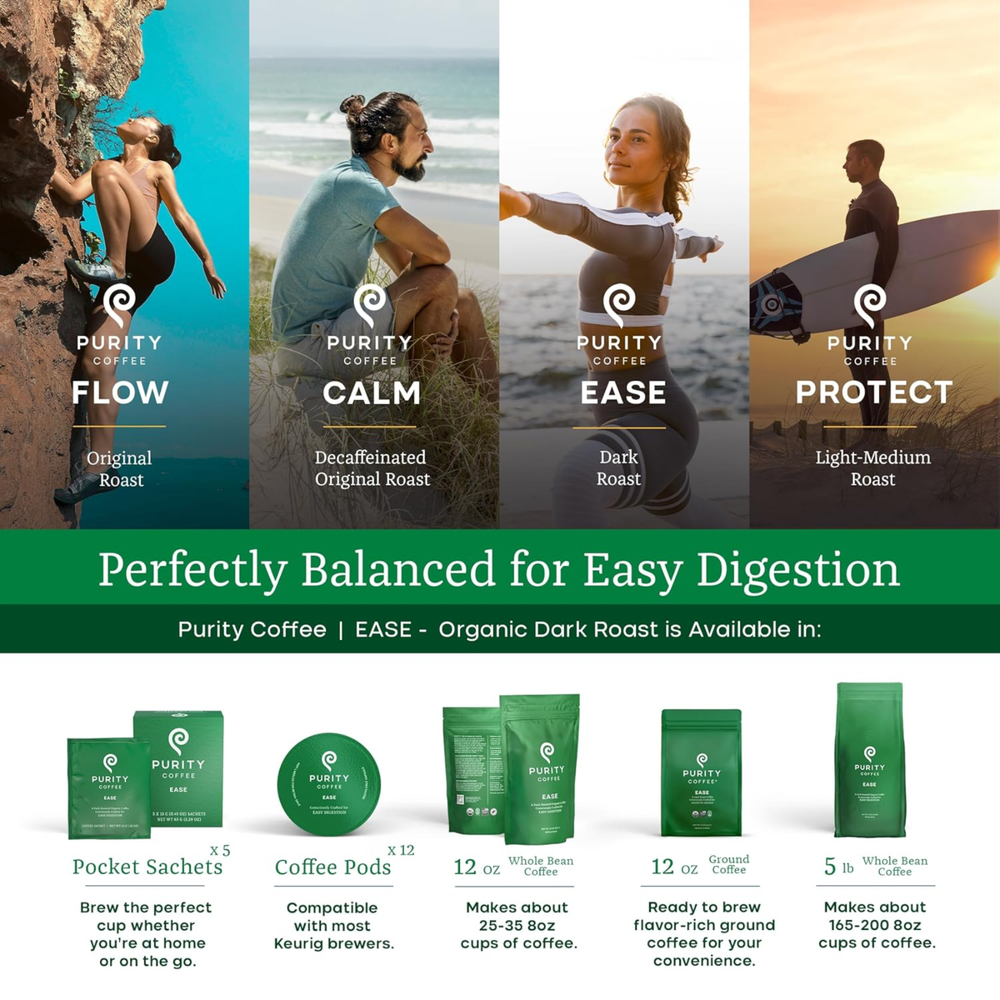 Purity Coffee – Dark Chocolate Organic Dark Roast Ground Coffee (12 oz) Low-Acid Coffee Crafted for Wellness Enjoy the perfect balance of full-bodied flavor and digestive support . Purity Coffee Dark Roast is high in antioxidants, lower in acidity, and contains prebiotic compounds to support gut health and overall wellness. Certified Organic & Regeneratively Farmed USDA Organic Certified Demeter Certified Biodynamic Smithsonian Bird Friendly Every batch is specialty-grade, regeneratively farmed, and hand-picked to ensure the highest quality beans with exceptional health benefits. Flavor Profile Top Notes: Brown spice Mid Notes: Roasted walnut Base Notes: Dark chocolate Zero Additives, Pure Coffee Purity Coffee contains 100% specialty-grade organic Arabica beans with no additives or allergens. Lab-tested for antioxidant content, it’s coffee designed with your health in mind. Brewing Recommendations This medium-fine grind is ideal for electric drip machines, manual pour-over, Aeropress, or Clever Dripper . Use filtered water at 195–205°F and start with 4 Tbsp (20g) per 12-oz mug —adjust to taste. Once opened, store airtight and consume within 10 days for peak freshness. For cold brew lovers, try Purity EASE for smooth, easy-to-digest coffee. Freshness You Can Taste Packaging is nitrogen-flushed to reduce oxygen to 1–2%, preserving coffee oils, aroma, and flavor. Each 12 oz bag yields approximately 25–30 cups of coffee. Coffee Crafted for Wellness From farm to cup, Purity Coffee focuses on maximizing health benefits without compromising taste. Enjoy a dark roast that’s smooth, antioxidant-rich, and supportive of your gut and overall wellness . Ingredients: 100% Specialty-Grade Organic Arabica Coffee