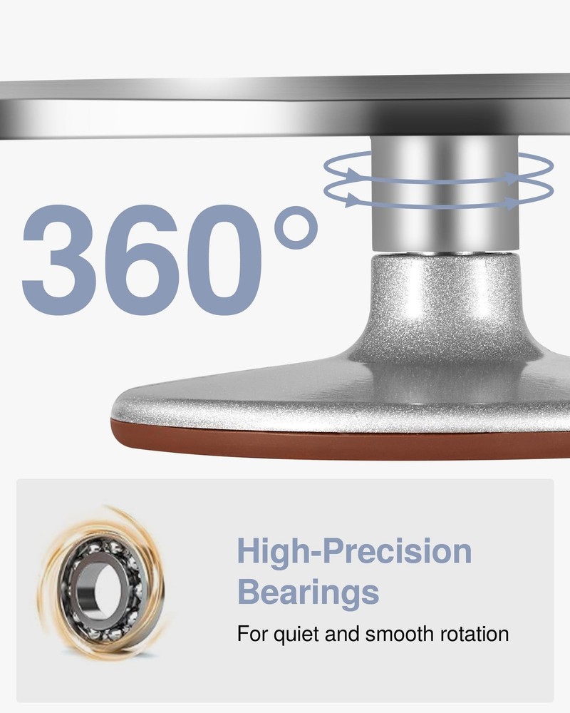 Puroma Aluminium Alloy Rotating Cake Turntable 12'' Revolving Cake Stand with Non-slip Silicone Bottom, Ideal Cake Decorating Supply for Cake Decorations, Pastries and Cupcakes Product Details Material: Aluminum Brand: Puroma Item Weight: 2.34 Kilograms Finish Type: Anodized Shape: Round Base Type: Pedestal Assembly Required: No Number of Levels: 1 Manufacturer: Puroma Package Dimensions: 13.39 x 13.35 x 5.63 inches Item Weight: 5.14 pounds Country of Origin: China Item model number: CT012 Finish types: Anodized Dishwasher compatible: No Batteries required: No Heavy-duty Cake Stand: The Puroma cake turntable is made of heavy-duty aluminum alloy material, offering the cake spinner longevity and stability and preventing it from tipping or wobbling while decorating. Quiet and Smooth Rotation: The rotating cake turntable with stainless steel ball bearings can rotate smoothly in either a clockwise or anti-clockwise direction without making any rough noise. Perfect for either left-handed or right-handed. Precision Tick Marks: The cake spinner stand comes with four precision tick marks, which measure 7.9"/8.9"/9.9"/11.2". Make it easier to clarify the size of the cake. Ideal cake decorating supplies for the beginner and the professionals. Non-slip Design: The cake decorating turntable with a non-slip surface and silicone bottom ensures stability and grip while decorating and protecting the table from scratches. Perfect cake decorating kit for cakes, cupcakes, and desserts. Easy to Clean: Our cake decorating turntable is easy to clean and maintain with a soft cloth or sponge. Please make sure its dry when you don't use it. Puroma cake turntable for decorating makes baking fun and easy.
