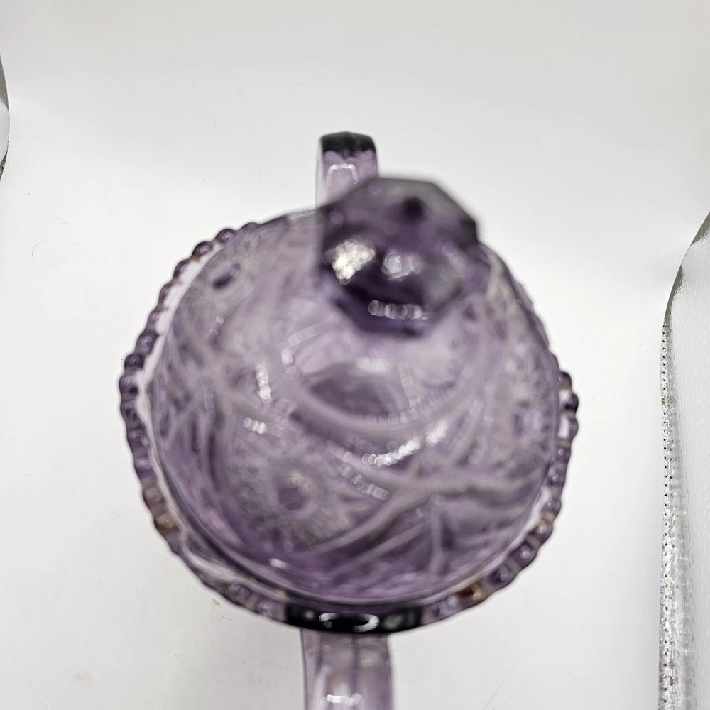 This vintage candy dish is a stunning addition to any collection. The ornate design features an etched cut glass lid and is made of high-quality glass material. The dish is perfect for storing candies, nuts, or other small items. The brand is unmarked, adding to the unique and timeless appeal of the piece. The production style is cut glass, a technique that adds depth and texture to the dish. The purple color is rich and vibrant, making it a standout item on any tabletop. This candy dish is a must-have for collectors of vintage glassware. There is a rough edge along rim... feels like chipping. Sold as is