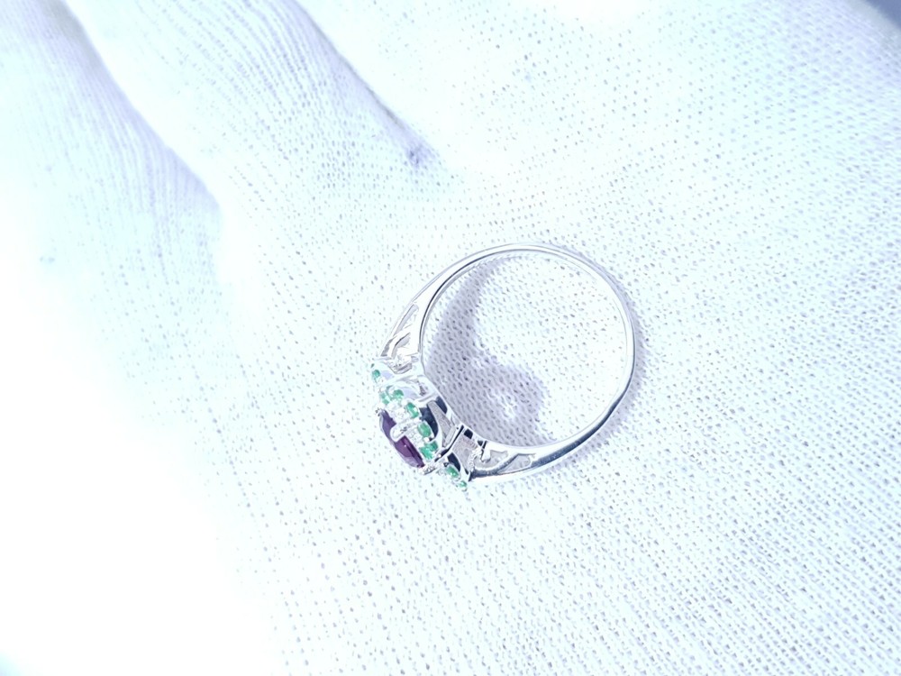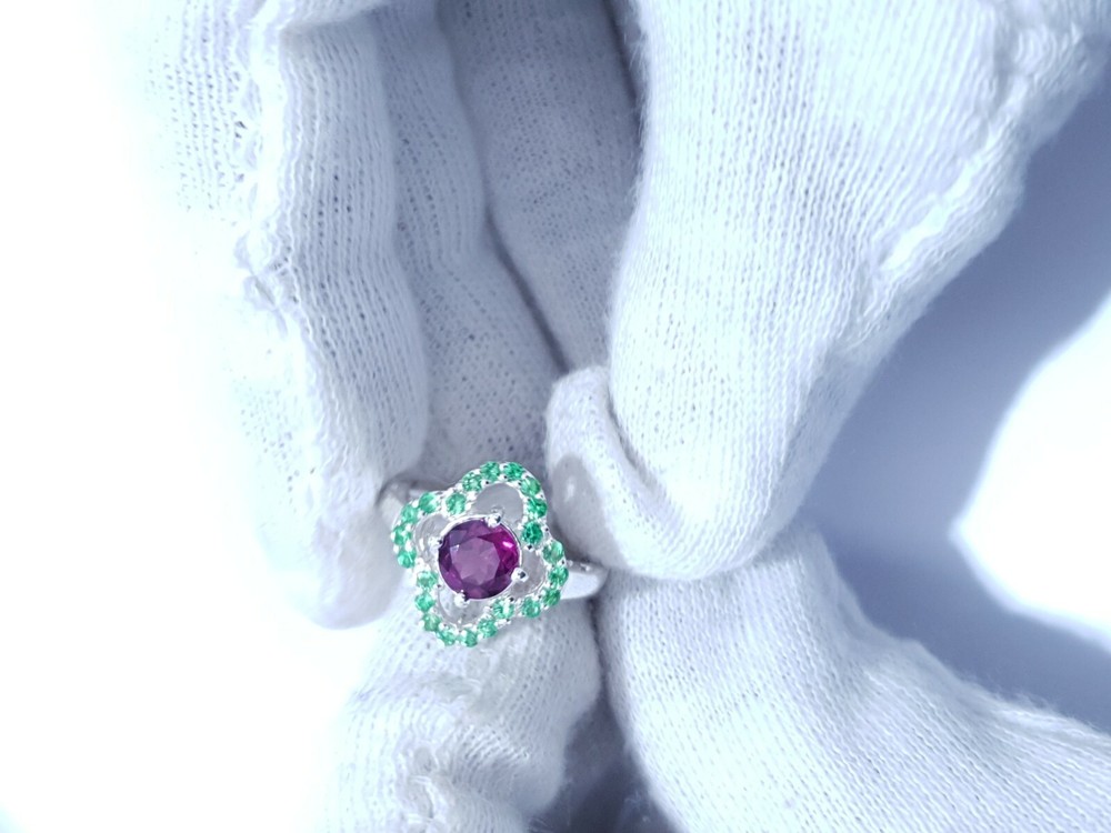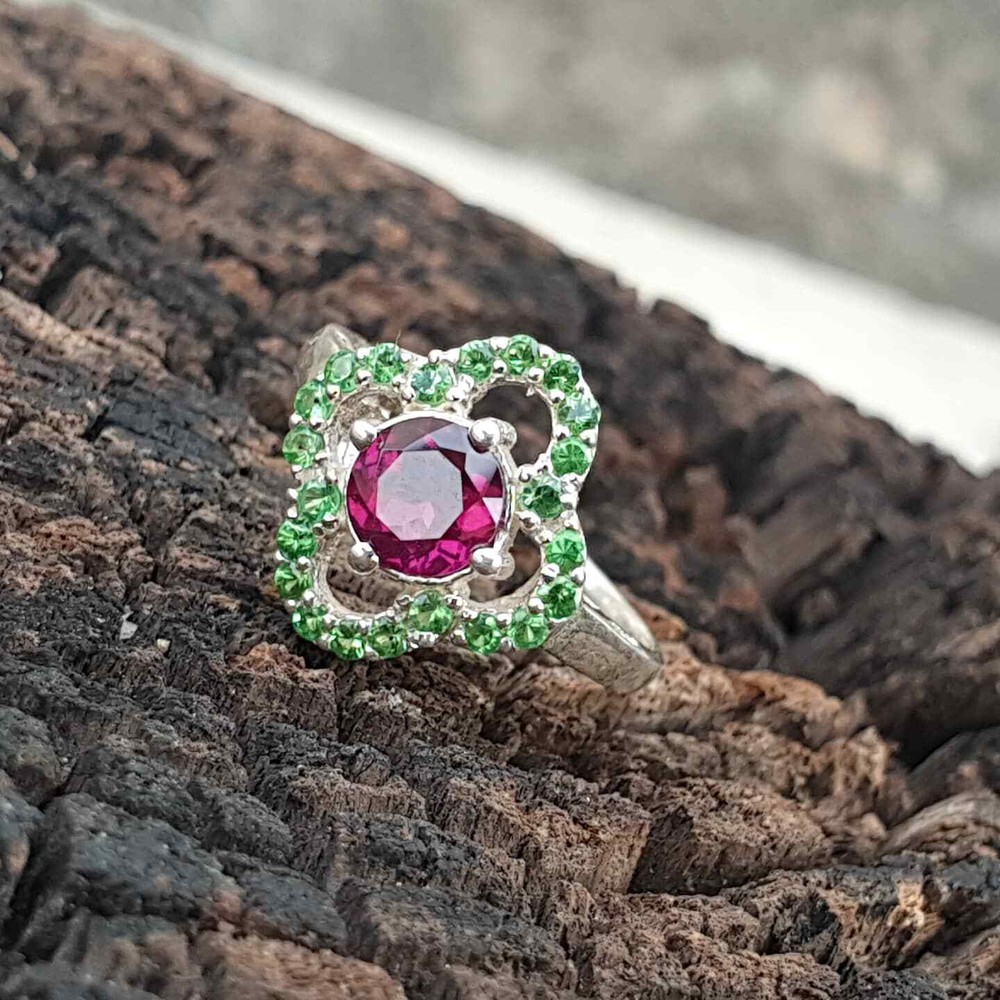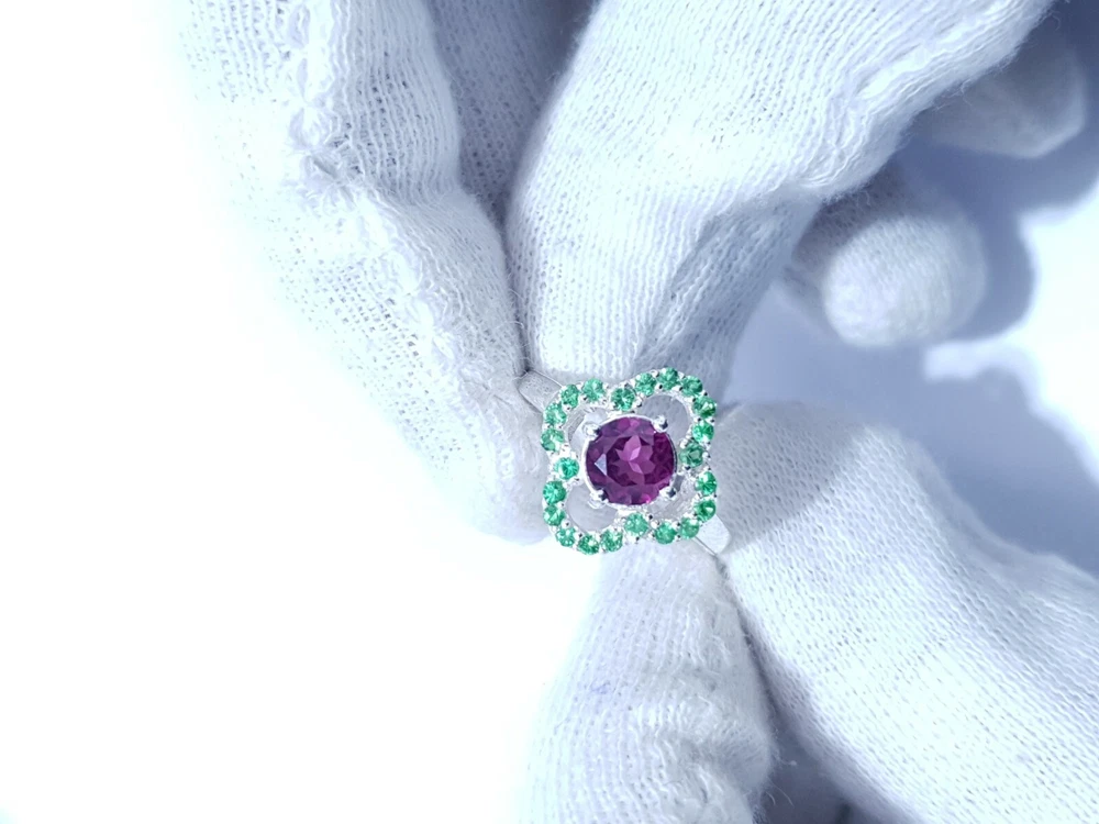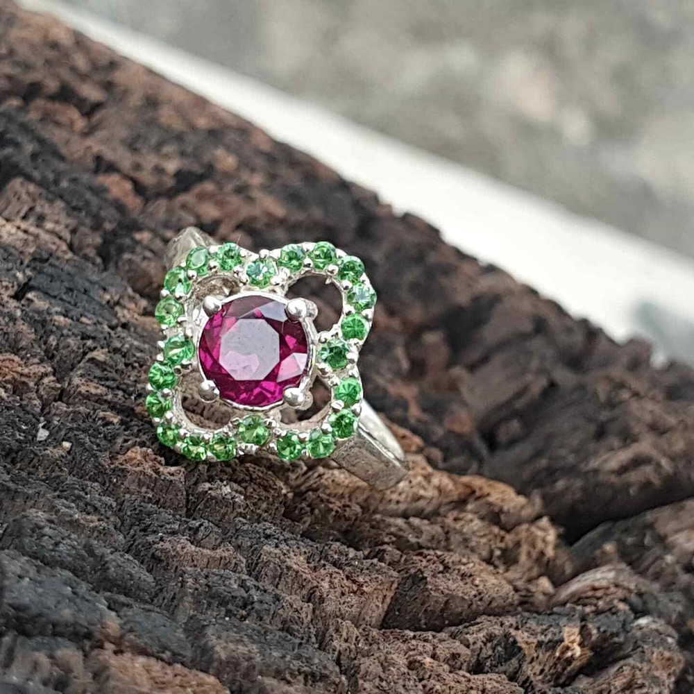 Main Stone: Rhodolite Garnet Ring Size: 8 Gender: Female Style: flower design Type: Ring Occasion: Wedding Use Occasion: Anniversary Main Stone Creation: Natural Main Stone Shape: Round Ring Shape: Round Metal: Sterling Silver Sizable: Yes Main Stone Treatment: Not Enhanced, Natural UPC: Does not apply Metal Purity: 925 parts per 1000 gtin13: Does not apply Secondary Stone: purple garnet, Tsavorite Garnet Lot: No Material: Gemstone Country of Origin: India Main Stone Color: Purple Brand: Handmade