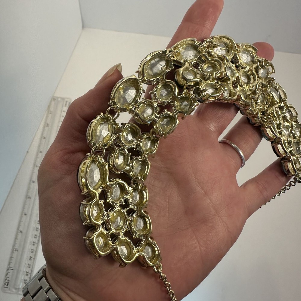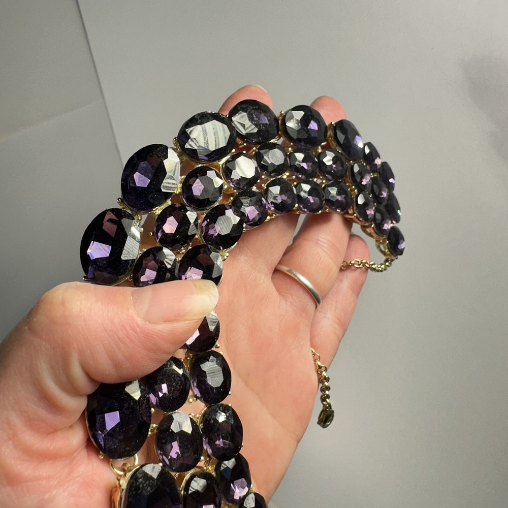 Elegant jewelry set with bold purple stones, suitable for upscale events. Features a gold-plated finish for added sophistication. • Adjustable chain clasp for a secure fit • Matching ring included, adjustable • Lightweight for comfortable wear • High-quality faceted stones for sparkle Necklace length = 18 inches Good condition.