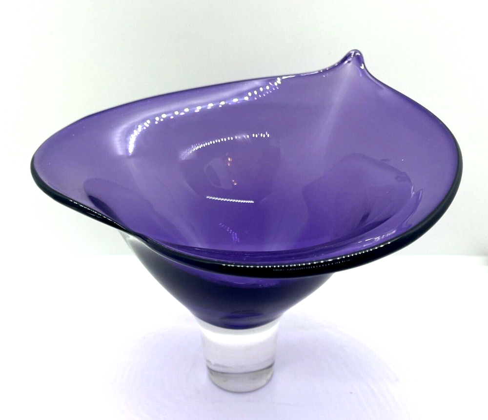 Purple Heart Art Glass Centerpiece Pedestal Bowl Mueseum of Glass Signed 2004 Valentines This art glass piece is in excellent pre owned vintage condition. There are no chips or cracks. It measures 6' x 7.5". Please note the photos for detail.