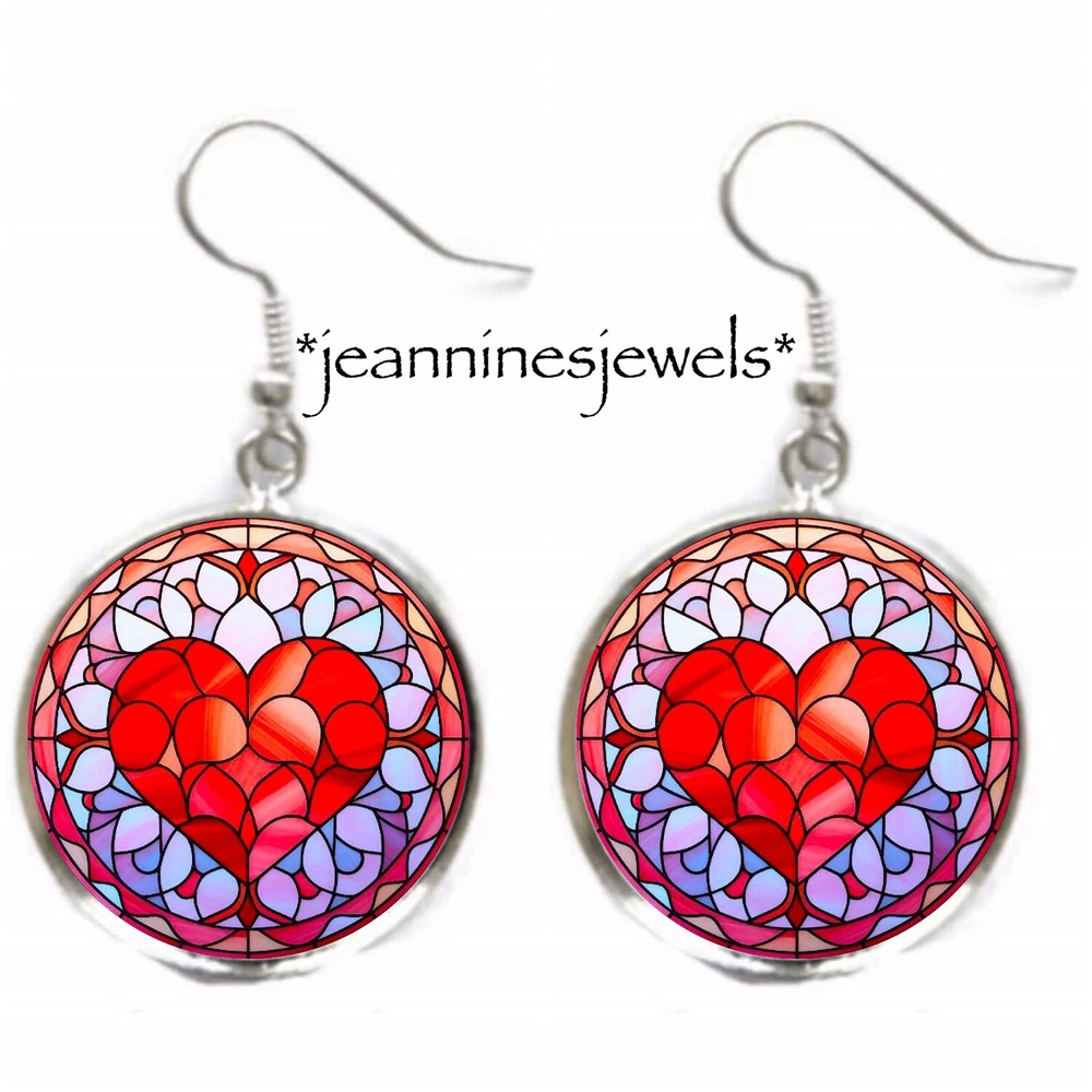 Purple Red HEART Valentines Day Gift Faux Stained Glass Silver Charm EARRINGS