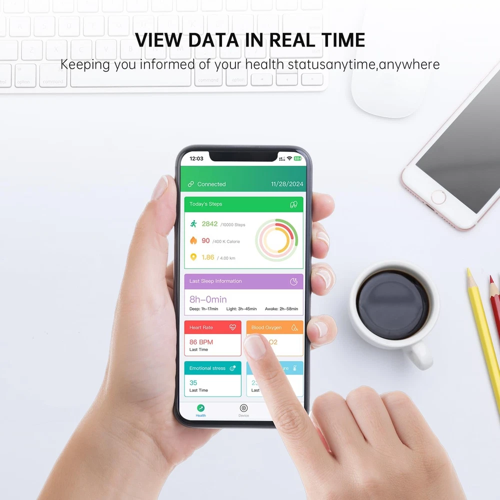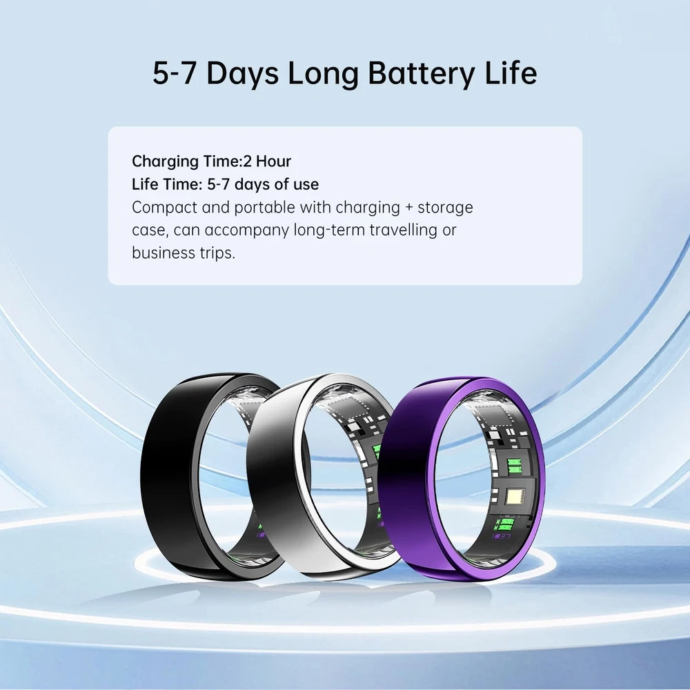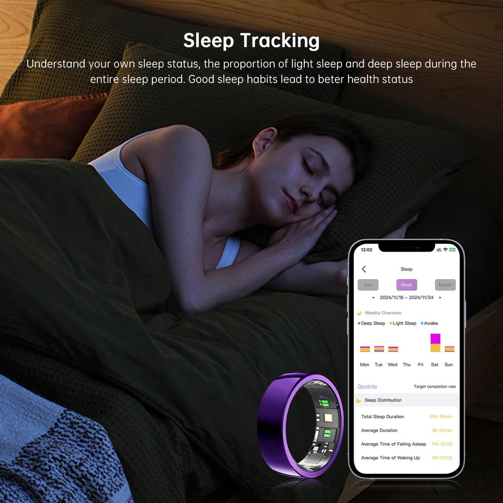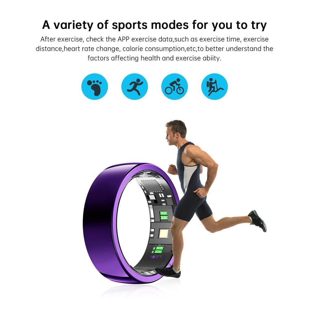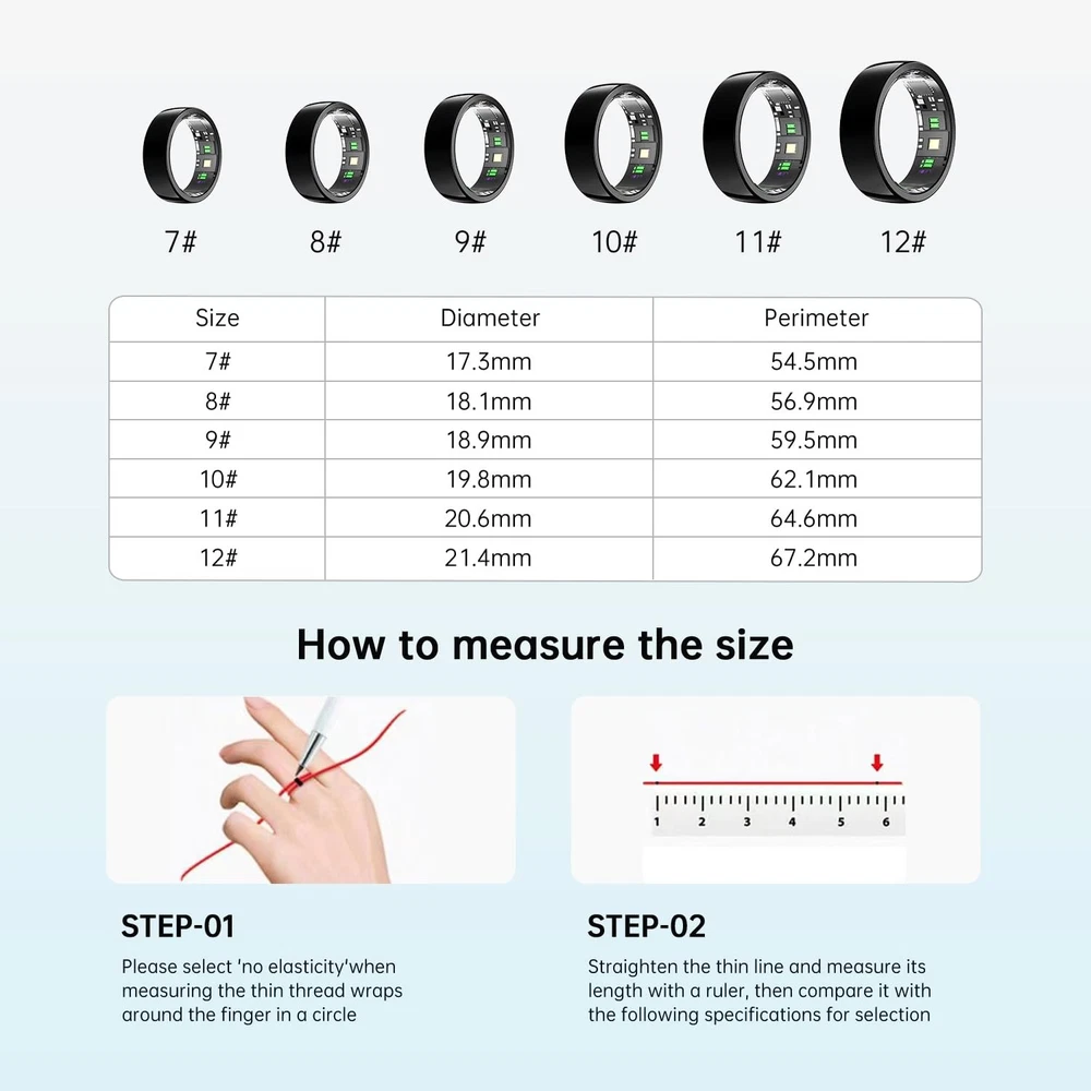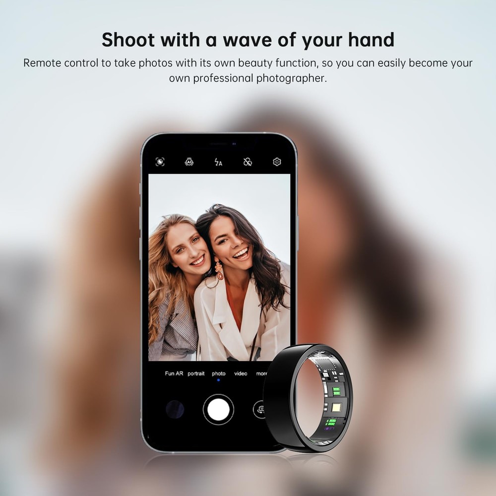 Introducing the smart ring that will revolutionize the way you track your fitness and health! The smart ring is a step counter, fitness tracker, heart rate monitor, blood oxygen level tracker, calorie tracker, and sleep tracker all in one! With its advanced technology, this smart health ring provides 24-hour health monitoring to protect your health. Experience the convenience and functionality of the smart ring that is designed to fit your active lifestyle. With a 5ATM waterproof rating, you can wear it during your swimming sessions. The 7-9 days battery life ensure that you stay connected, even when you're on the go. Take instant photos with the smart ring's hand gesture brush Tiktok feature, and never miss another picture-perfect moment again. Stay active and track your steps throughout the day with our step tracker and step counter ring for women. The sleep tracker ring provides accurate data on your sleep cycle, so you can wake up feeling refreshed every day. At only 2.5 mm thickness and 0.16 ounces Gram weight, the smart ring is lightweight and comfortable to wear. The smart ring size 7-12 fits most fingers, providing a snug and secure fit for any activity. The smart ring is the smart health ring for the modern, active individual. Get yours today and start protecting your health! 【SIZE FIRST】 Please measure your finger according to the measurements in the picture before purchasing to make sure you choose the right size for you, ensuring all-day comfort. 【HEALTH MONITOR RING】 This smart ring for women and men is an all-in-one health tracker, measuring heart rate, blood oxygen levels, activity, and sleep patterns right from your finger with this compact fitness tracker ring. The data tracked by the smart health ring can only be used as a reference data and should not be used for self-diagnosis or treatment. 【Wireless Charging Case】 Charge your smart ring anytime, anywhere, Then put the ring down with the wireless charging area aligned with the charging area, then put the ring in it and press the switch to charge it for 2 hours, and repeat the operation if it needs to be fully charged. Ultra-light stainless steel ring is comfortable enough to wear all day and night,IP68 waterproofing protects your ring better 【GEATURE CONTROLS】 After enabling the remote photo function on the app, just shake the finger wearing the ring to take photos remotely. Through connection to a phone or other device and specific technical support, the smart ring can hand gesture brush Tiktok 【ACCESSORY DETAILS & AFTER-SALE SEAVICE】 Packing, Smart Ring*1, Charging case*1, USB-C Charging Cable*1, Instruction Manual*1. We offer one year quality warranty, please contact with us if you encounter any problems during use.