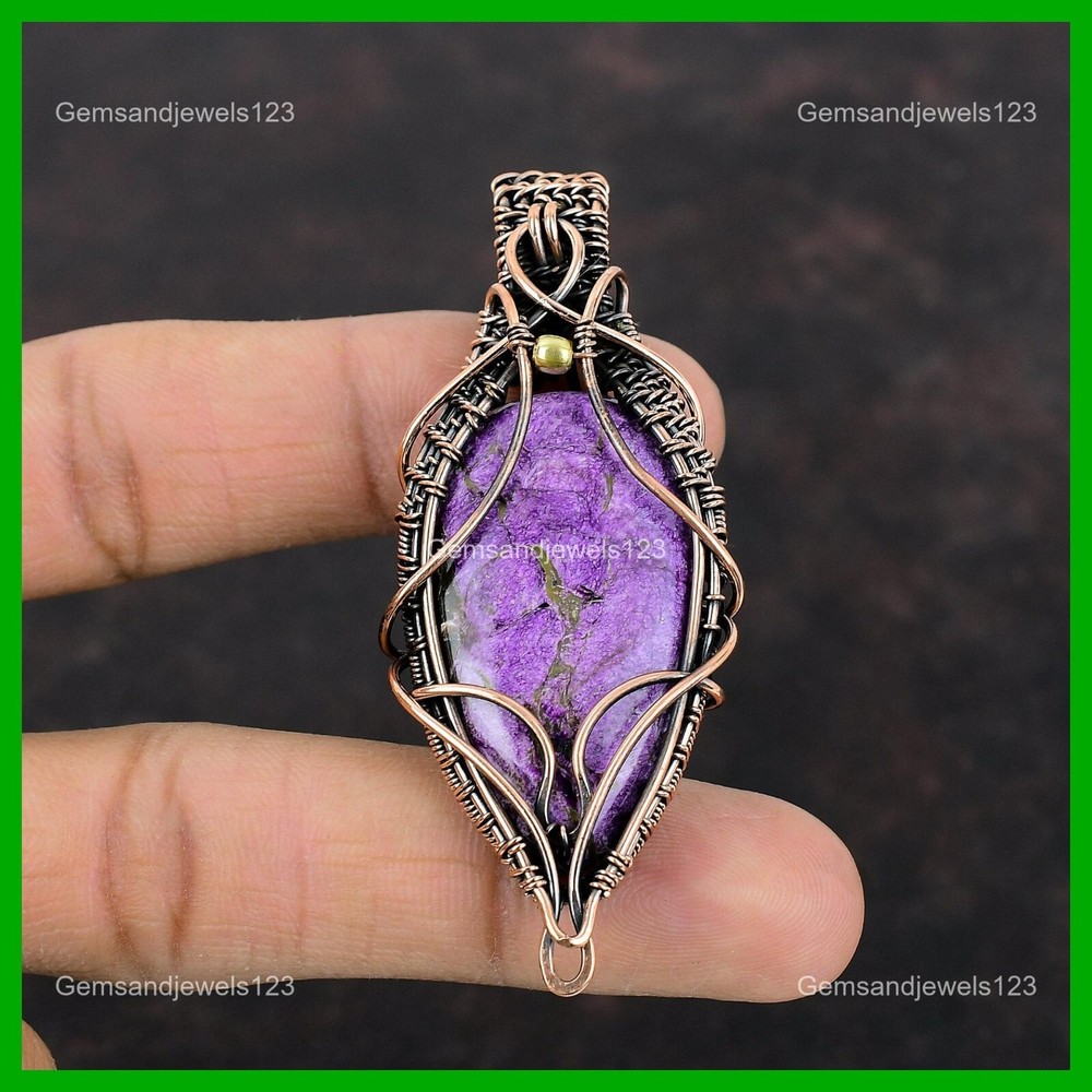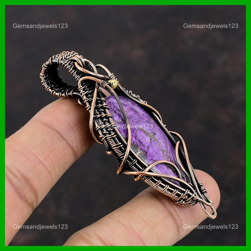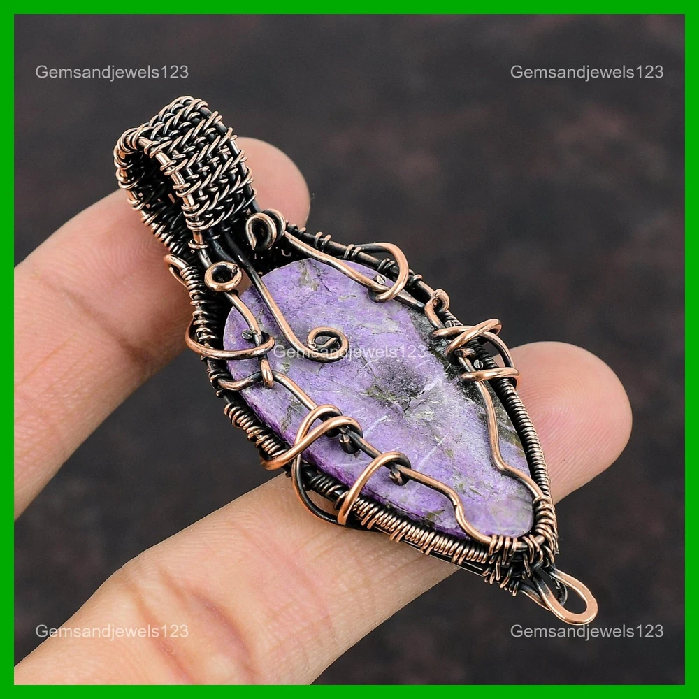 Note : Due to the natural formation of this gemstone. Slight Variation in design and color are to be expected. Welcome to gemsandjewels123 Mothers day Sale Oval Purpurite Gemstone Wire Wrapped Anniversary Pendant Copper Handmade Pendant, Wire Wrapped Pendant, Wire Wrapped Jewelry, Copper Pendant, Copper Wire Pendant, Wrapped Jewelry, Wire Wrap Pendant, Wire Wrap Jewelry SKU : VFWP-691 Gemstone : Purpurite Stone Shape : Oval Metal Purity : Unknown Copper Length : 70 Millimeters Width : 30 Millimeters Copper has been used for jewelry making for thousands of years, dating back to ancient civilizations such as the Egyptians, Romans, and Aztecs. Copper was valued for its beauty, versatility, and durability, and was often used to make everything from jewelry and coins to cookware and tools. In addition to its historical significance, copper jewelry also offers several benefits. Copper is a natural conductor of heat and electricity, which makes it ideal for energy healing and therapeutic purposes. Wearing copper jewelry is believed to have various health benefits, such as improving circulation, reducing inflammation, and boosting the immune system. Some people also believe that copper jewelry has the ability to balance energy and improve mood. For Mother's Day Gift For Father's Day Gift For Promise For Valentine's Day For Halloween Party For Christmas Day Gift For New Year Party For Mom For Her If you can't find the information you need or need some advice for your design? Feel free to contact us. We are fast to reply :) All our work is made by hand with Love and Care in our workshop Thank you so much for visiting and hope you enjoy shopping with us gemsandjewels123 is committed to delivering the best quality sterling silver jewelry to customers. As a handmade jewelry manufacturer, we offer an extensive selection of copper gemstone jewelry that showcases the brilliance of our craftsmanship. We are an experienced handmade jewelry supplier with expertise in embellishing gemstones to suit every style. We offer you the liberty to create your jewelry ensemble with sparkling, earthy, and pure gemstones. Our Talented artisans masterfully handcraft each piece of jewelry you see here. Our pieces are made with genuine gemstones. The one-of-a-kind piece you see here is the same exact piece you will receive.