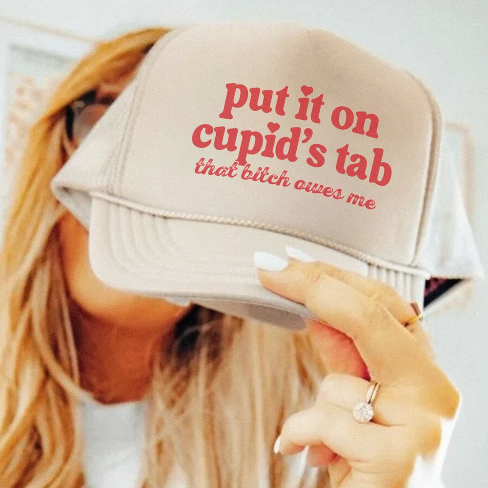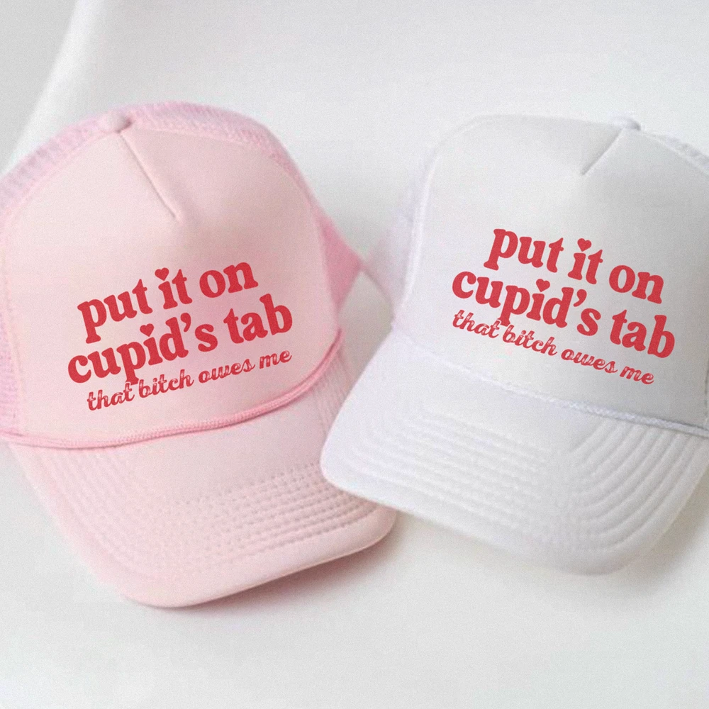 Put It On Cupid's Tab 💕 Single this Valentine’s Day? Embrace the sass and humor with this hilarious "Put it on Cupid's Tab, That B*tch Owes Me" trucker hat! Perfect for a fun night out, Galentine’s Day, or just making a statement about love and cocktails. Customize the font color to suit your unique style! ✨ Hat Features: Material: Made from 100% durable polyester for lasting wear. Design: Structured with a firm front panel and seamless foam front panel with lining for a trendy look. Visor: Slightly curved with 6 rows of stitching and a matching fabric undervisor. Comfort: Matching color sweatband ensures all-day comfort. Fit: Adjustable plastic snap closure for the perfect fit. Size: One size fits most adults, measuring 22.8 inches (58 cm) in circumference. ✨ Customization Options: Pick any font color to make this hat truly yours—bold, sassy, or subtle! 📦 Processing Time: Hats take 1–7 days to make and ship, so order now to be ready for your Valentine’s Day plans. 🎉 Why You’ll Love It: The ultimate accessory for singles who are owning their status. Lightweight, comfortable, and guaranteed to turn heads. A great gift for friends or a fun addition to your Valentine’s Day outfit. Order now and let Cupid know you’re keeping tabs!