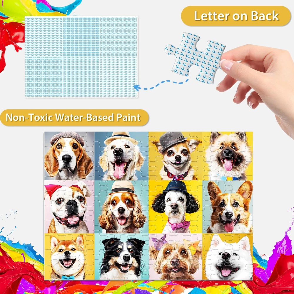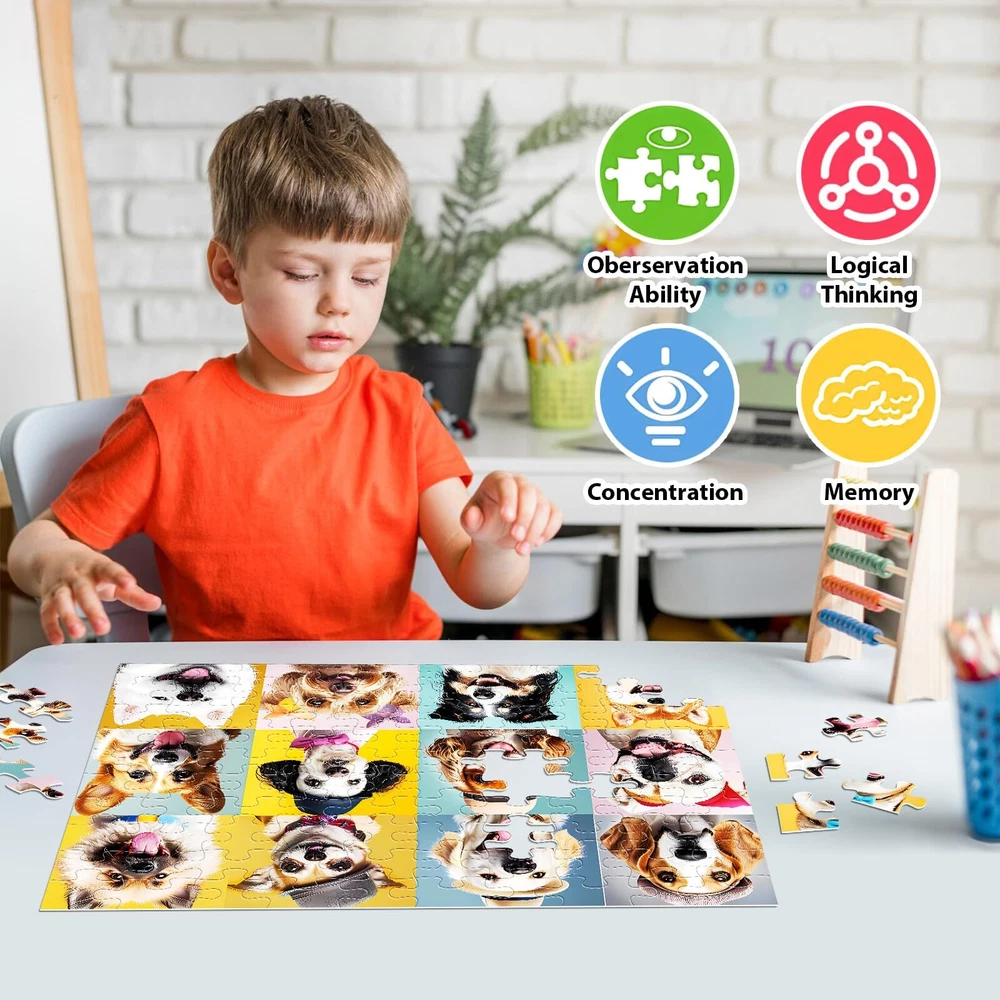 Puzzles for Kids Ages 6-8 8-10 10-12 Year Old and Seniors- Cute Dogs Portrait Jigsaw Puzzle- 100 Piece Puzzles Colorful Children Puzzles Educational Toys Puppy Animal Puzzle as Home Decor ❤Puzzle Size: Finished size of this 100 pieces puzzles for kids ages 4-8 is 15"x10.6", suitable size for kids ages 4-6 6-8 8-10 10-12 playing puzzles on tabletop or on floor.The Jeacirio kids puzzle set includes: high-quality 100 puzzle pieces, exquisite puzzle storage bag, 1:1 full color reference poster and high-end gift box, which is suitable for children as a gift. ❤Vivid Image & Unique Illustration: The 100 piece puzzles for kids ages 6-8 features bright, vibrant colors that depict cute dog portraits of different breeds in different colors, kids will fall in love with this beautiful dogs puzzles for kids. The kids puzzles ages 8-10 is beautifully designed and full of childlike fun. When completed, it forms an eye-catching image that stimulates children's imagination ❤Premium and Safe Puzzles: Jeacirio puzzles for kids ages 4-6 are made of environment-friendly high-end thick cardboard with non-toxic ink, the sturdy puzzles pieces resist bending and layering, ensure the durability and lifespan of the puzzle. The puzzle pieces are precision cut for snug fit, and have smooth round edges without burrs, won't hurt little hands. Meet the US toy standard. Safety test approved. ❤Educational Puzzles Toys: 100 piece Jigsaw puzzles allow children to sit quietly and complete a challenge, learn patience and concentration. Develop children's eye hand coordination ability and creativity, stimulate their creativity and problem-solving ability while playing. Development toys for toddler, puzzles for kids ages 3-5 ❤Great Gift for Kids: A fun and educational puzzles that is a perfect surprise for birthday, Thanksgiving, Christmas/Xmas, Easter, and other holidays or a family game night. 100 piee jigsaw puzzle is an exceptional gift for kids ages 4 to 10 years. It has an exquisite and sturdy box which are portable for outdoor or indoor playing. ❤Parent-child Game: Stay away from mobile phones and video games, protect children's eyesight. It's not just playing 100 piece puzzles for kids ages 8-10. These puzzles helps to tap into our creativity and rewire our brains to make "connections". Intellectual game for adults and kids. puzzles 100 piece are a great way to enjoy time alone or with a group ❤Start Different Levels: The pieces of kids puzzles ages 5-8 have cheat letters (A-F) on the back, showing the quadrants of the puzzle where the pieces go, help the kids work easier. Of course they can ignore them for more difficult level. This puppy puzzles can be completed by one child, it is also beginner level of difficulty 100 piece puzzles for adult & seniors. ❤Jigsaw Puzzles for Seniors and the Whole Family: Our exceptional 100 piece large piece jigsaw puzzles is optimal for seniors, but the whole family can enjoy the experience of putting this puzzle together ❤Missing Piece Support – If you are missing any piece of the kids puzzles ages 3-5, please contact us and we will replace for you a new puzzle, our team will reply to you within 24 hours and give you satisfactory service. ❤Puzzle Size: Finished size of this 100 pieces puzzles for kids ages 4-8 is 15"x10.6", suitable size for kids ages 4-6 6-8 8-10 10-12 playing puzzles on tabletop or on floor.The Jeacirio kids puzzle set includes: high-quality 100 puzzle pieces, exquisite puzzle storage bag, 1:1 full color reference poster and high-end gift box, which is suitable for children as a gift. ❤Vivid Image & Unique Illustration: The 100 piece puzzles for kids ages 6-8 features bright, vibrant colors that depict cute dog portraits of different breeds in different colors, kids will fall in love with this beautiful dogs puzzles for kids. The kids puzzles ages 8-10 is beautifully designed and full of childlike fun. When completed, it forms an eye-catching image that stimulates children's imagination ❤Premium and Safe Puzzles: Jeacirio puzzles for kids ages 4-6 are made of environment-friendly high-end thick cardboard with non-toxic ink, the sturdy puzzles pieces resist bending and layering, ensure the durability and lifespan of the puzzle. The puzzle pieces are precision cut for snug fit, and have smooth round edges without burrs, won't hurt little hands. Meet the US toy standard. Safety test approved. ❤Educational Puzzles Toys: 100 piece Jigsaw puzzles allow children to sit quietly and complete a challenge, learn patience and concentration. Develop children's eye hand coordination ability and creativity, stimulate their creativity and problem-solving ability while playing. Development toys for toddler, puzzles for kids ages 3-5 ❤Great Gift for Kids: A fun and educational puzzles that is a perfect surprise for birthday, Thanksgiving, Christmas/Xmas, Easter, and other holidays or a family game night. 100 piee jigsaw puzzle is an exceptional gift for kids ages 4 to 10 years. It has an exquisite and sturdy box which are portable for outdoor or indoor playing. ❤Parent-child Game: Stay away from mobile phones and video games, protect children's eyesight. It's not just playing 100 piece puzzles for kids ages 8-10. These puzzles helps to tap into our creativity and rewire our brains to make "connections". Intellectual game for adults and kids. puzzles 100 piece are a great way to enjoy time alone or with a group ❤Start Different Levels: The pieces of kids puzzles ages 5-8 have cheat letters (A-F) on the back, showing the quadrants of the puzzle where the pieces go, help the kids work easier. Of course they can ignore them for more difficult level. This puppy puzzles can be completed by one child, it is also beginner level of difficulty 100 piece puzzles for adult & seniors. ❤Jigsaw Puzzles for Seniors and the Whole Family: Our exceptional 100 piece large piece jigsaw puzzles is optimal for seniors, but the whole family can enjoy the experience of put