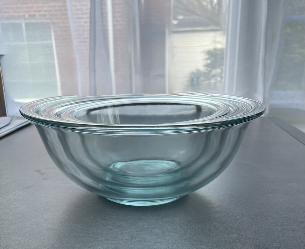 Set of THREE Pyrex nested Mixing Bowls. They have a light bluish tint — very lovely with a modern retro feel. Excellent condition. Included are 2.5 qt., 1.5 qt., and 1 qt and measure 10”, 8.5”, and 7” respectively. Likely produced from the late 1990s to early 2000s.