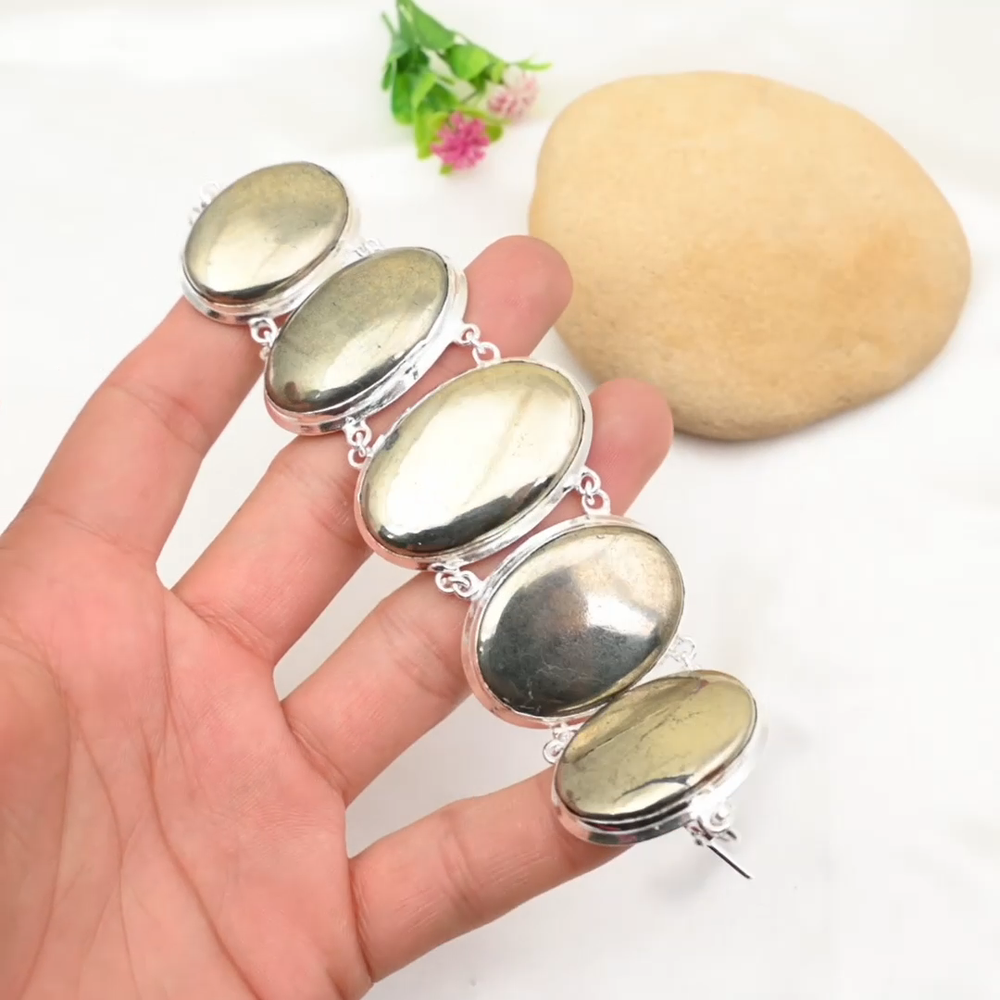 Pyrite Golden Gemstone Bracelet in 925 Sterling Silver Handmade Gift