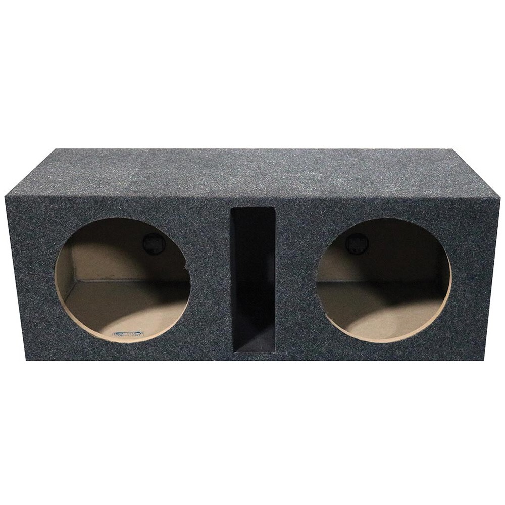 Dual car audio subwoofer box designed to hold (2) 12-inch subwoofers (not included) that blast ecstatic sound so your vehicle rocks the streets Adds more bump to your ride with powerful bass and smooth audio; Dual-chamber design doubles your kick Ensures the safety of you and your speakers with a shared slot port vent design that helps the speakers stay cool and regulated Stands strong with solid MDF wood construction and blends into your vehicle with charcoal carpeting; Color: Charcoal gray Holds (2) 12-inch car audio subwoofers; Air space: 1.6 cubic feet per chamber, 3.2 cubic feet total; Dimensions (L x W x H): 16.25 x 36 x 13.25 inches