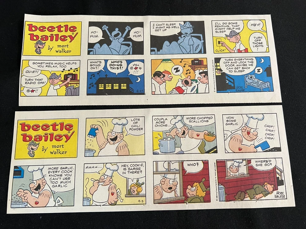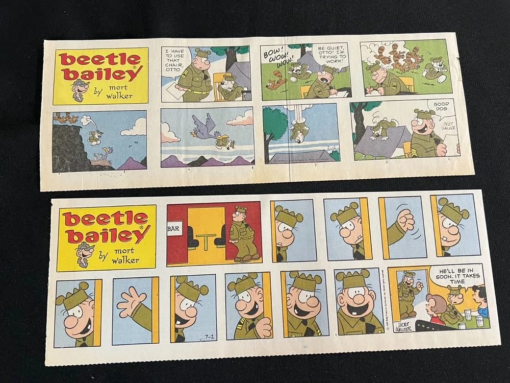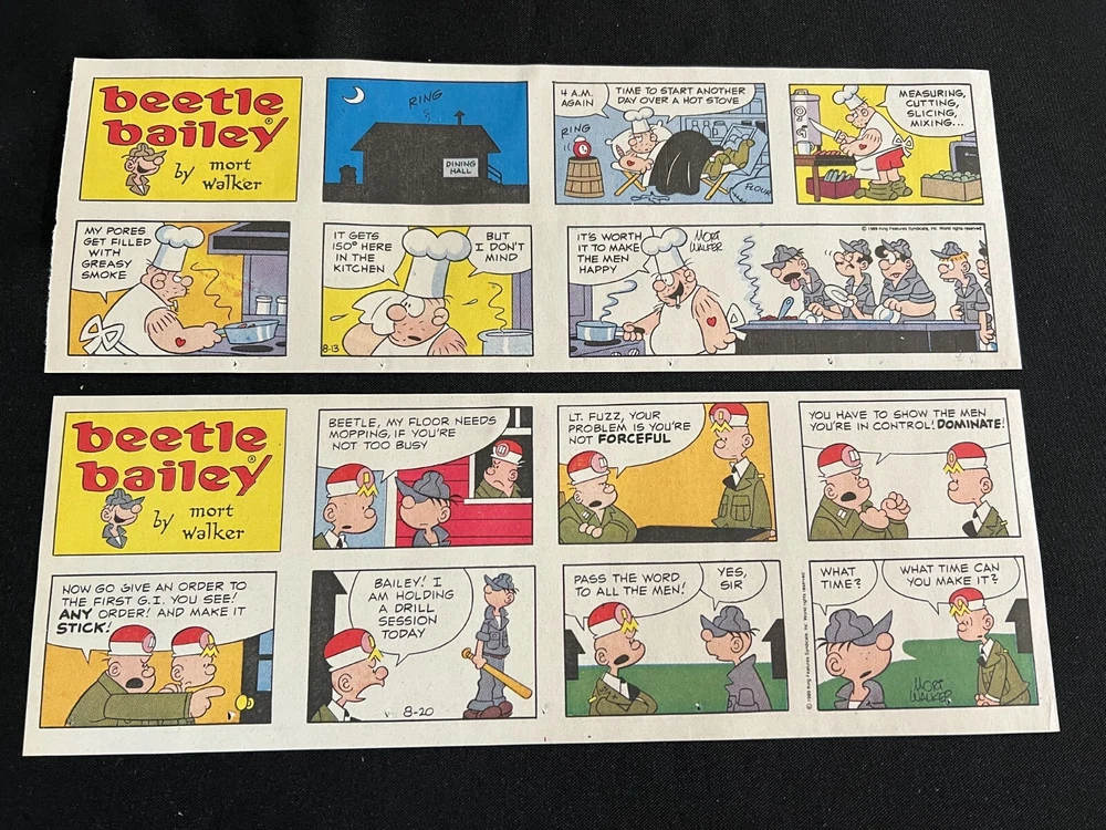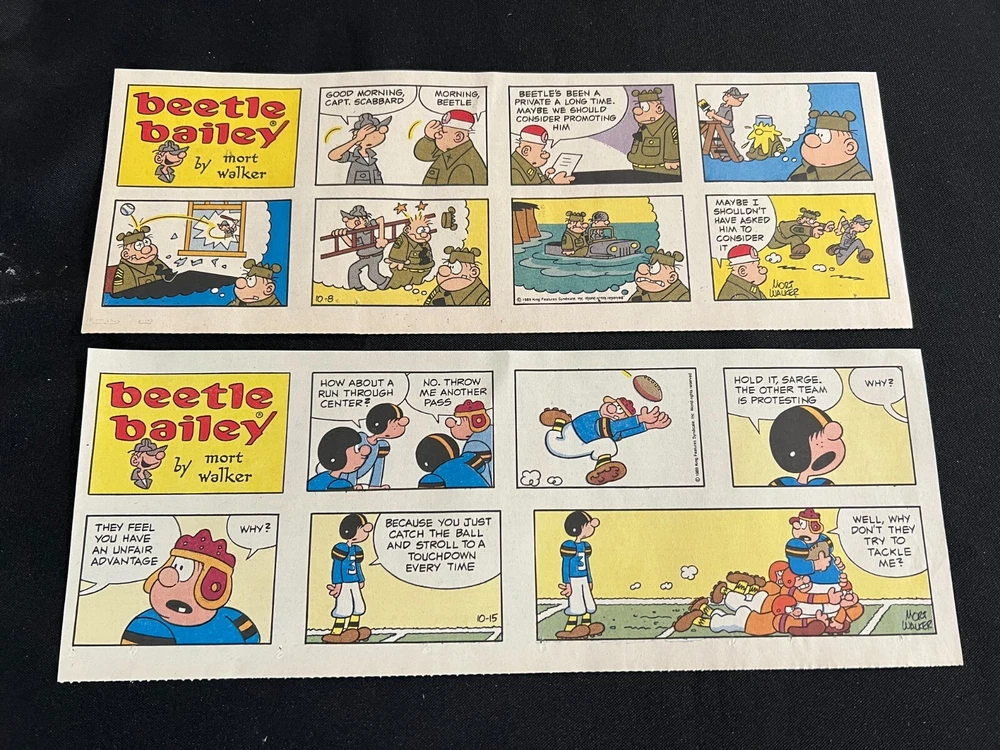 Lot of 18 BEETLE BAILEY SUNDAY QUARTER PAGE COMIC STRIPS By Mort Walker The BEETLE BAILEY comic strip has been in print since September 4, 1950. It was created by Mort Walker, and since his death in 2018, the strip has been continued by his three sons, Neal, Brian and Greg Walker. This listing is a selection of Sunday Quarter Page Comic Strips from 1989... Conditions range from Good to Fine. Includes the following dates: January 1, 1989 January 8, 1989 January 15, 1989 January 22, 1989 January 29, 1989 February 5, 1989 February 12, 1989 July 2, 1989 July 9, 1989 August 13, 1989 August 20, 1989 August 27, 1989 September 3, 1989 September 24, 1989 October 1, 1989 October 8, 1989 October 15, 1989 October 22, 1989 _______________ To Search my eBay Store for other vintage Comic Strips CLICK HERE I have thousands of strips waiting to be listed on eBay. If you don’t find what you are seeking in my eBay store, send me an email with the titles and dates and I will check my inventory! _______________ Combine purchases and save on shipping! Use the Shopping Cart option to confirm your purchases and request adjusted shipping charges. The easiest way to do this is to place the items you want to purchase in your shopping cart. When you open the shopping cart, across from your name are the words in blue "Request Total." Click these words and the request total page is generated that shows the items that you are committing to buy and a box for a message to you the seller. You can now click the blue box that states “Commit to Buy” & submit the request. This works best on a computer rather than a cell phone. If something goes wrong and eBay charges you the full amount, don't worry, I will refund the excess when I pack your order. ______________________________________