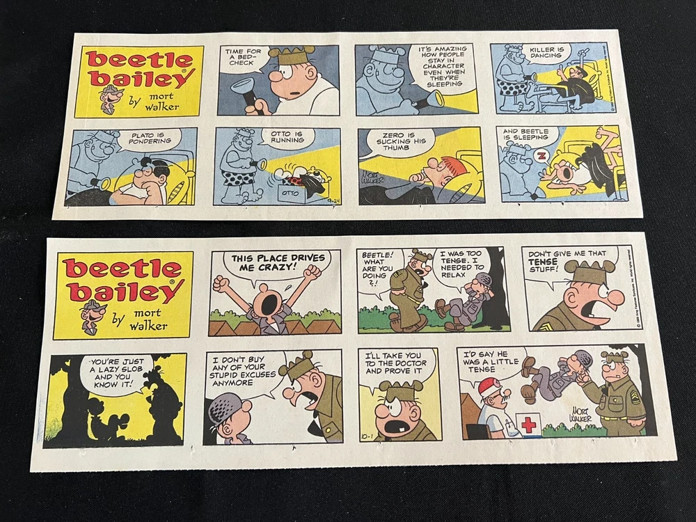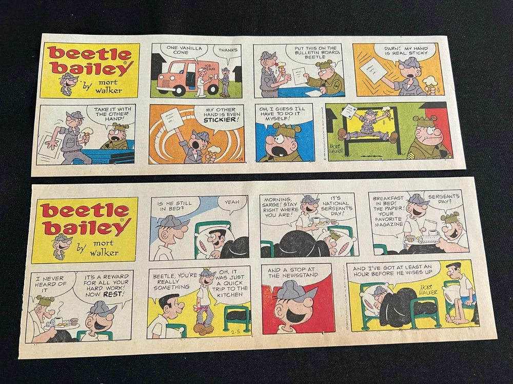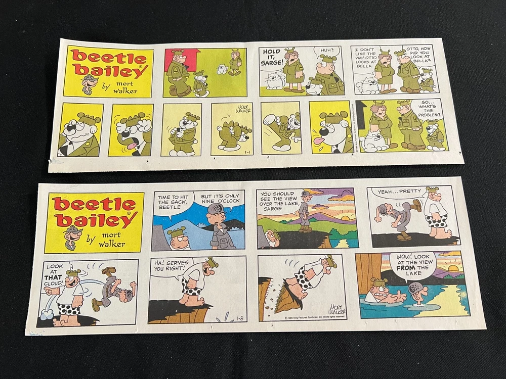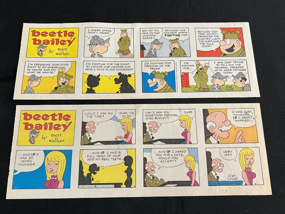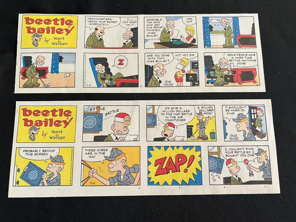 Lot of 18 BEETLE BAILEY SUNDAY QUARTER PAGE COMIC STRIPS By Mort Walker The BEETLE BAILEY comic strip has been in print since September 4, 1950. It was created by Mort Walker, and since his death in 2018, the strip has been continued by his three sons, Neal, Brian and Greg Walker. This listing is a selection of Sunday Quarter Page Comic Strips from 1989... Conditions range from Good to Fine. Includes the following dates: January 1, 1989 January 8, 1989 January 15, 1989 January 22, 1989 January 29, 1989 February 5, 1989 February 12, 1989 July 2, 1989 July 9, 1989 August 13, 1989 August 20, 1989 August 27, 1989 September 3, 1989 September 24, 1989 October 1, 1989 October 8, 1989 October 15, 1989 October 22, 1989 _______________ To Search my eBay Store for other vintage Comic Strips CLICK HERE I have thousands of strips waiting to be listed on eBay. If you don’t find what you are seeking in my eBay store, send me an email with the titles and dates and I will check my inventory! _______________ Combine purchases and save on shipping! Use the Shopping Cart option to confirm your purchases and request adjusted shipping charges. The easiest way to do this is to place the items you want to purchase in your shopping cart. When you open the shopping cart, across from your name are the words in blue "Request Total." Click these words and the request total page is generated that shows the items that you are committing to buy and a box for a message to you the seller. You can now click the blue box that states “Commit to Buy” & submit the request. This works best on a computer rather than a cell phone. If something goes wrong and eBay charges you the full amount, don't worry, I will refund the excess when I pack your order. ______________________________________