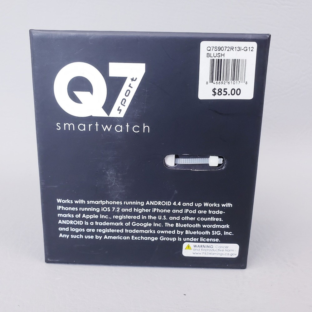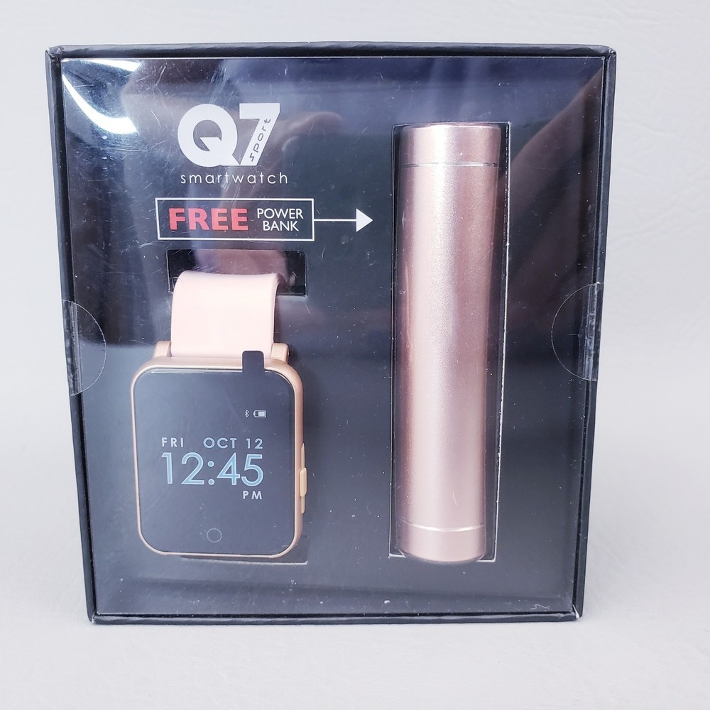 Q7 Sport Smartwatch With Power Bank Blush Pink New in box condition. Compatibility: Compatible with both Android (4.4 and up) and iOS (7.2 and up) smartphones. Features: Includes fitness tracking capabilities like a pedometer, heart rate monitor, sleep tracking, find your phone, and can display notifications for calls, texts, and social media apps. Thank you for looking!