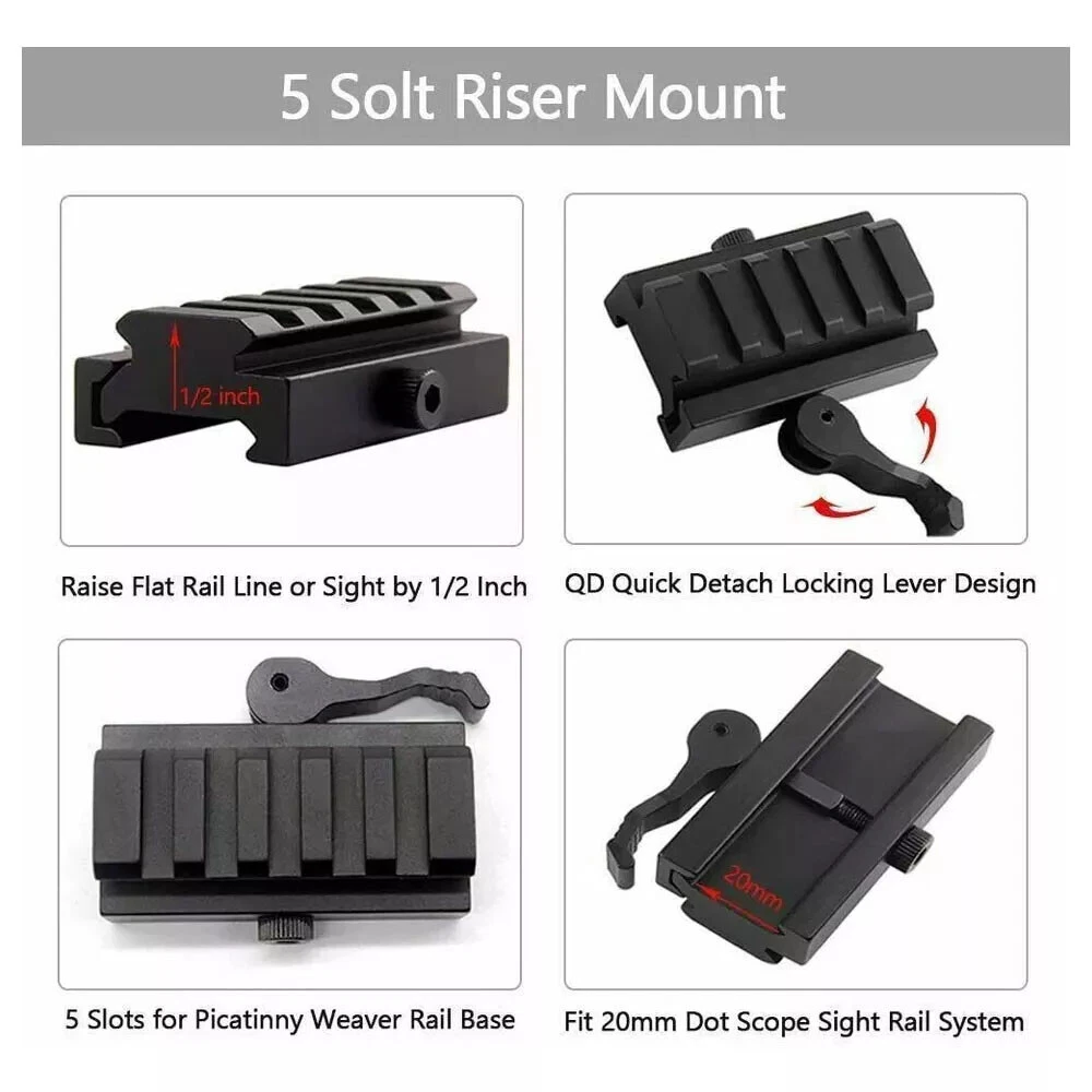 11mm to 20mm Dovetail Extension Mount with 30mm Scope Ring Middle Profile Mount 16.99 USD Free shipping 2pair 1" Low Profile 3/8" Dovetail Rail Scope Ring Mount For Scopes Flashlights 11.99 USD Free shipping Tactical Side Ring /45 Degree Offset 25.4/30mm Ring Flashlight Picatinny Mount 17.99 USD Free shipping 2Pcs 25.4mm Scope Ring Mount 1 Inch High Profile 11mm Dovetail Rail 10.99 USD Free shipping Tactical Mini Red Laser Sight Dot Scope with Tri-rail 25.4/30mm Scope Ring Mount 9.99 USD Free shipping Holographic Reflex Red Green Adjustable Dot Sight w/1" High Profile Rail Mount 8.99 USD Free shipping Quick Release 30mm/25.4mm Ring High Profile Mount /1" High Picatinny Riser Mount 8.99 USD Free shipping Holographi Reflex 3MOA Red Dot Sight with Tri-Rail 25.4/ 30mm Ring Adapter US 32.99 USD Free shipping Slim Picatinny Riser Mount 1 inch High 3/5/8/9 Slot Sight Scope Rail Mount Hunt 8.99 USD Free shipping Tactical 3 MOA Reflex Illuminated Red Dot Sight w/45 Degree Offset 5 Slot Mount 29.99 USD Free shipping Holographic Reflex Compact 3 MOA Red Dot Sight/Red Green Dot Sight 4 Reticle 22.99 USD Free shipping Converter 11mm to 20mm Picatinny Mount w/Scope Rings 1" 25.4mm Low Profile Mount 16.99 USD Free shipping Holographic Reflex Mini 3 MOA Red Dot Sight with Red Dot Laser Sight for Hunting 29.99 USD Free shipping 1X40 Green Red Dot Sight Scope Tactical with 1" See-Thru Flat Top Riser Mount 29.99 USD Free shipping Tactical 1X30 Red Green Dot Sight Scope with 45 Degree Offset Rail Slots Mount 26.99 USD Free shipping Tactical Red Dot Laser Sight 20mm Picatinny Rail w/Low Profile 25.4mm Ring Mount 20.99 USD Free shipping Tactical 1X40 Green Red Dot Sight Scope /Offset 45 Flip Up Sights Front Mount 17.99 USD Free shipping 45 Degree Offset 25.4/30mm Ring Flashlight Mount/3 Slots Picatinny Rail Section 6.99 USD Free shipping A=45 Degree Offset Rail 5 Slot Mount Description: 45 Degree Black anodized aircraft grade aluminum Accepts all standard Weaver / Picatinny 1913 accessories 5 Slots , designed for red dots, flashlights and lasers Two bolts design for better secure Length: 2.164" / Weight: 1.7 oz B=5 Slot Riser Mount Description Name:Quick Release Mount Profile:Medium Profile Rail Type:Picatinny/Weaver Material:Aluminum Specification .Quick Detach feature that makes installation and removal fast and easy. .Immediate Conversion of Non-QD Mount Accessories to QD Deployment. .Made from Aircraft Aluminum with Matte Anodizing. .Length: 60mm (2.36" Approx.). .Height: 20mm (0.79" Approx.). .Rail Width: 20mm (0.79" Approx.). .With 5 picatinny slots, suitable for any 20mm picatinny weaver. .Quick detach function, easy to install and remove. Package: 1 x 5 slots Rail Mount