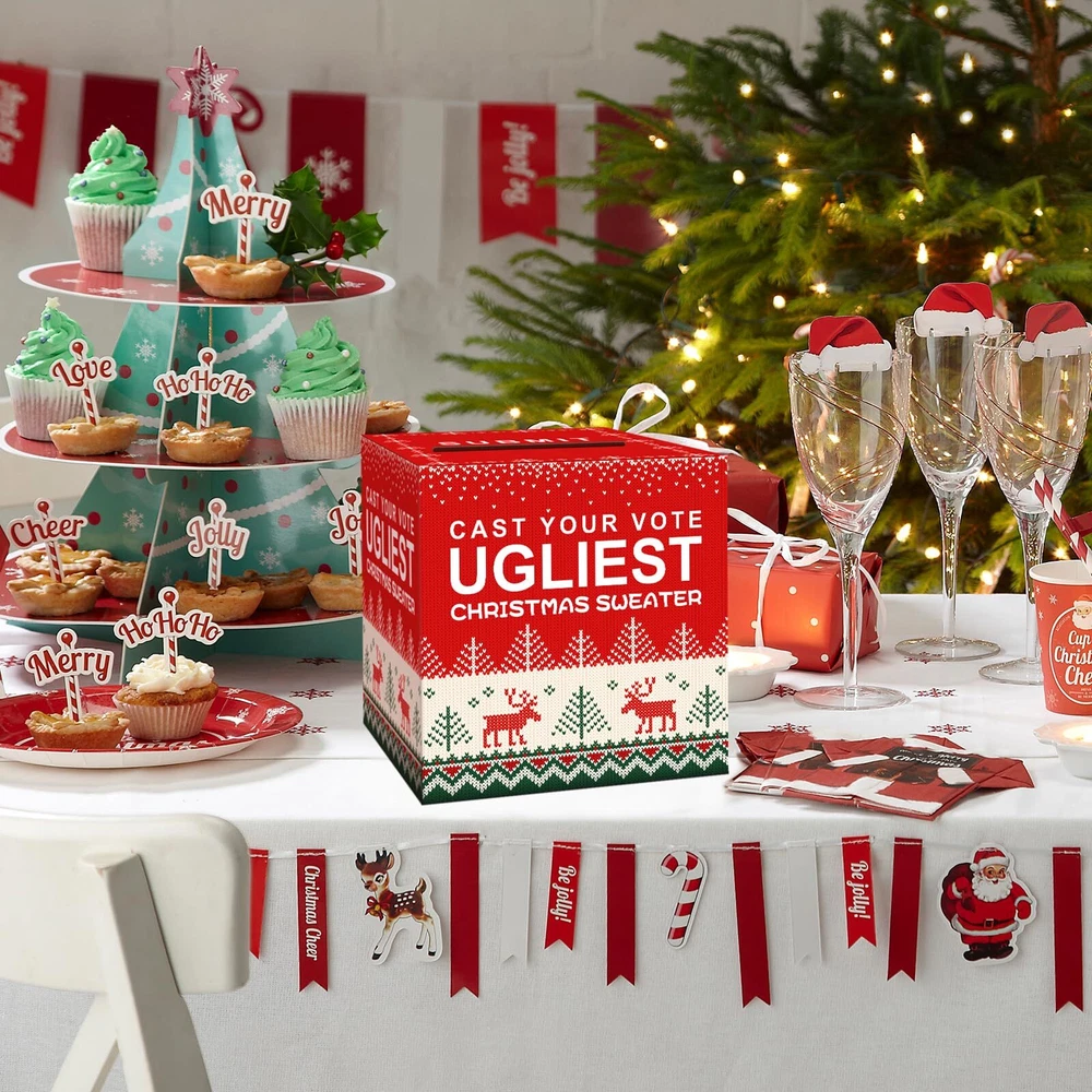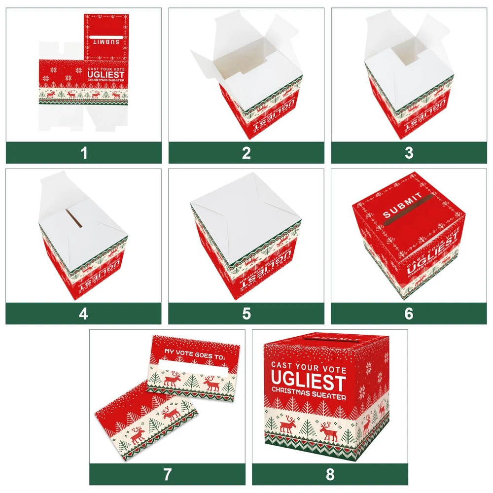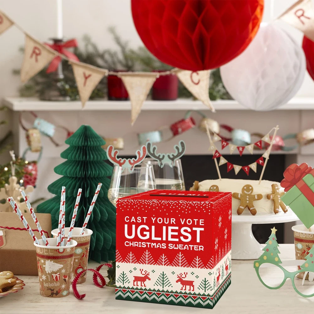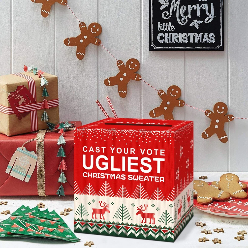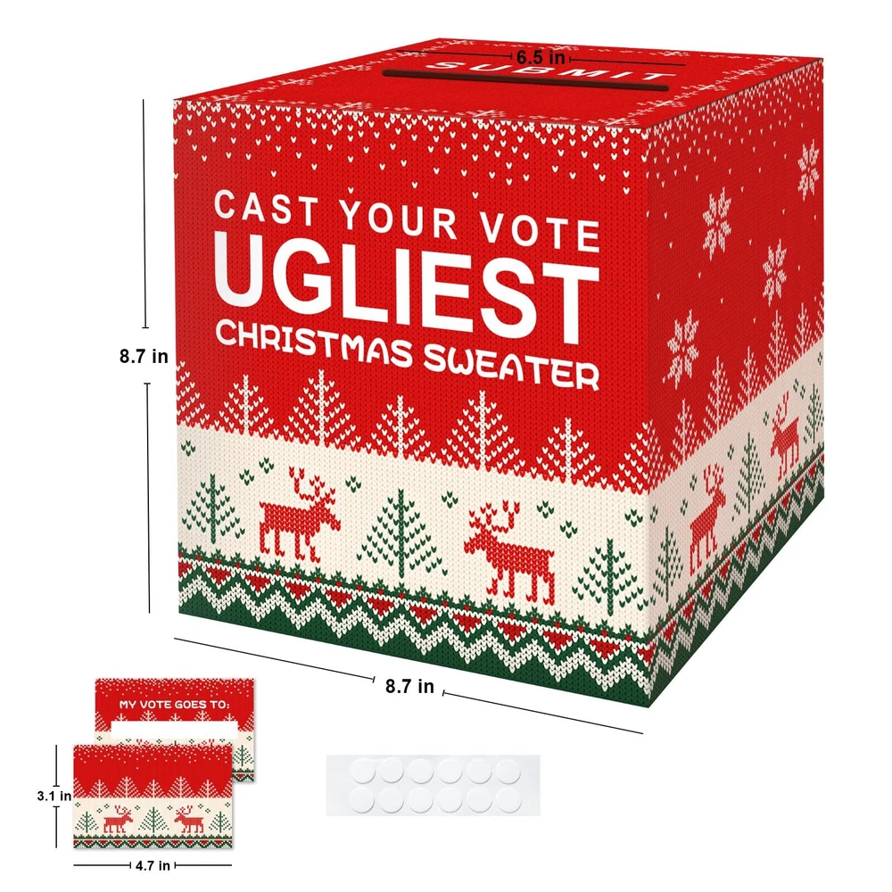 QIKSION Ugly Sweater Contest Ballot Box, Voting Cards Box Set with 50 Voting Cards Sweater Contest Ballot Box for Christmas Games Party Decorations MORE BENEFITS Package Include: Includes 50 ballot cards and 1 Ugly Sweater Contest Ballot Box, card box measures 8.7 x 8.7 x 8.7 inches, ballot Cards are plentiful enough to meet your party use, and everyone can attend the Christmas ugly sweater party! Easy to Assemble and Use: The ugly sweater voting box is simply designed for effortless assembly, it can be quickly folded into the shape of a ballot box, please refer to the picture for the specific assembly method. Funny Xmas Games: The ugly sweater party decorations are widely suitable for christmas sweater parties, carnival, New Year party, celebrations and other holidays. Perfect For All Ages: When the holidays come around, this Ugly Sweater Contest Ballot Box provides a fun, interactive game for your guests, kids, adults, and people of all ages to have fun and relax, too. It will be a very memorable Christmas ugly sweater party! QIKSION provides different color of card box for your options in the store. If you are dissatisfied with our gift card box, please feel free to contact us. We are glad to help you.
