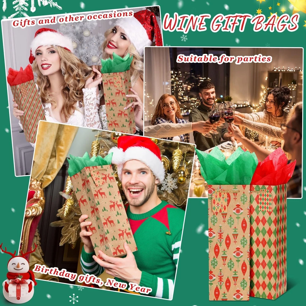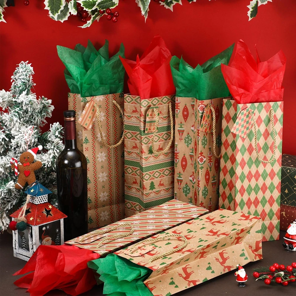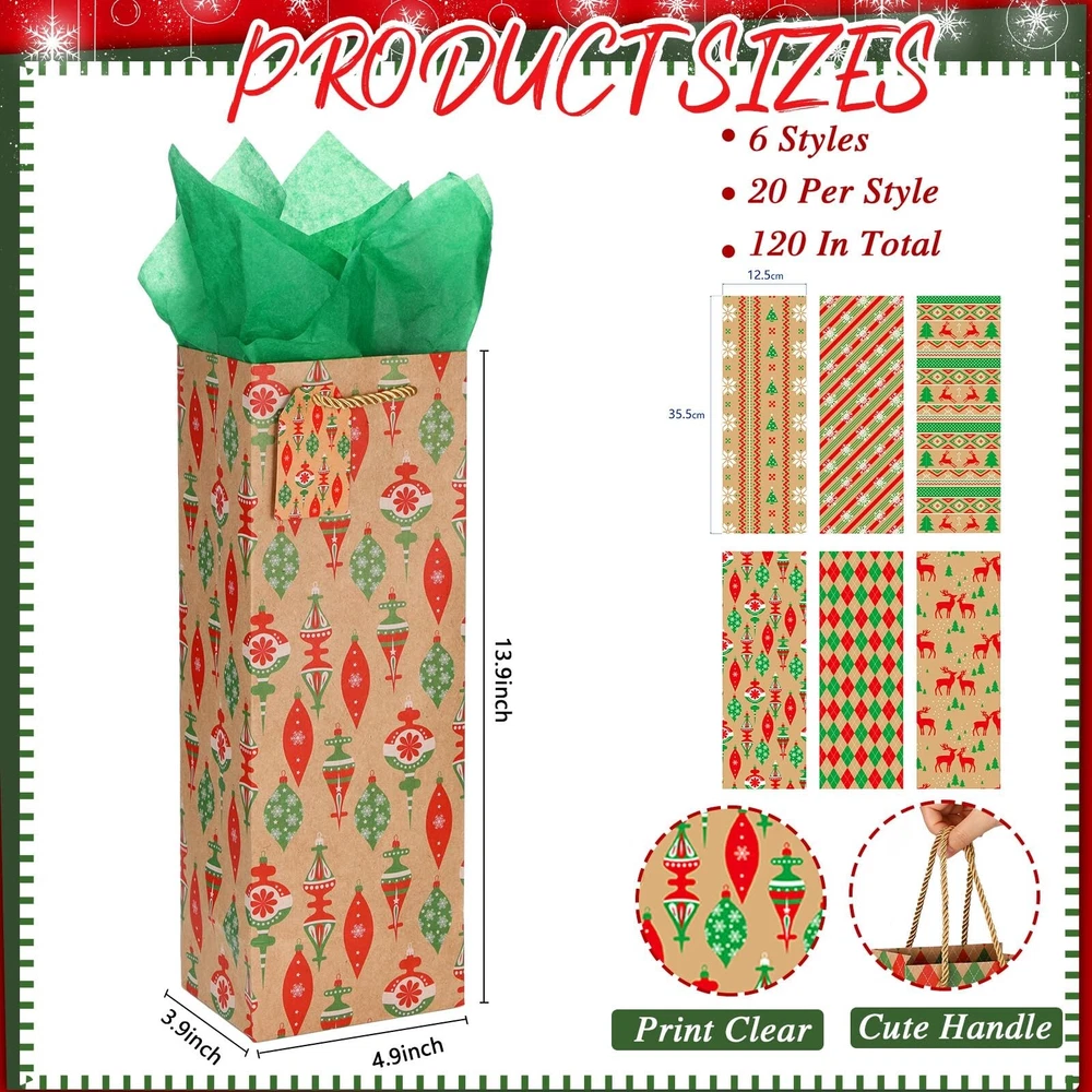 Qilery 60 Pieces Christmas Wine Bottle Gift Bags with Handle Christmas Kraft Wine Gift Bags Holiday Bottle Bags with Tissue Paper and Name Tags Kraft Wine Bags for Xmas Party Favors Supplies Product Details Brand: Qilery Color: Red Material: Cardboard Occasion: Christmas Included Components: Name tags, Tissue Paper, Twine Theme: Christmas Number of Items: 60 Unit Count: 1.0 Count Pattern: Christmas Size: Inches Package Dimensions: 15.98 x 10.75 x 7.09 inches Item Weight: 6.42 pounds Manufacturer: Qilery Country of Origin: China Item model number: YEN-Qilery-2228 Date First Available: July 24, 2023 Christmas Gift Bags Set: you will receive 60 Christmas wine gift bags including 6 different designs, 10 of each design, each Christmas pattern design is beautiful and colorful, the set also comes with 60 name tags, 60 sheets of tissue paper and a bundle of twine, to meet your packaging combination needs Suitable Size: Christmas wine bag bulk size is about 14 x 4.9 x 3.9 inch/ 35.5 x 12.5 x 10 cm, tissue paper size is about 20 x 24 inch/ 50 x 60 cm, suitable for packing a single standard wine bottle, you can use this wine bag to safely store your wine, gifts or other party favors Reliable Material: Christmas bottle gift bags are made of quality kraft paper, safe and reliable, light and strong, non fading, reusable, and can be applied for a long time with confidence, making your gifts look more delicate Christmas Exquisite Design: the wine Christmas gift bags are exquisitely designed, cute, colorful and eye catching, and have many Christmas elements, such as snowflakes, reindeer, Christmas trees, etc., to meet your gift giving and decoration needs, and create a strong Christmas atmosphere Suitable for Many Occasions: Xmas wine bag gifts are suitable for Christmas wine gift, winter holiday decorations, Christmas parties and gifts, and gifts for wine lovers and drinking lovers, making the gift look more exquisite Features: Ideal gift: These Christmas gift bags are suitable for wine, candies, biscuits, etc., with attached tags and twine, easy to hang tags and write names and wishes, ideal for wrapping gifts for Christmas. Strong Christmas atmosphere: Our holiday kraft wine bags are designed with classic Christmas patterns to enhance the Christmas mood and make your gifts more lively. Specifications: Material: kraft paper Color: as the picture shown Size: Christmas wine bags: about 14 x 4.9 x 3.9 inch Tissue paper: about 20 x 24 inch Name card: about 3.7 x 1.8 inch Hemp rope: 32.8ft Package includes 60 x Christmas wine gift bags 60 x Tissue paper 60 x Name card 1 x Hemp rope Warm reminder: Manual measurement, please allow slight errors on size. The color may exist a slight difference due to different screen displays.